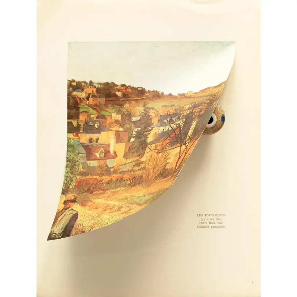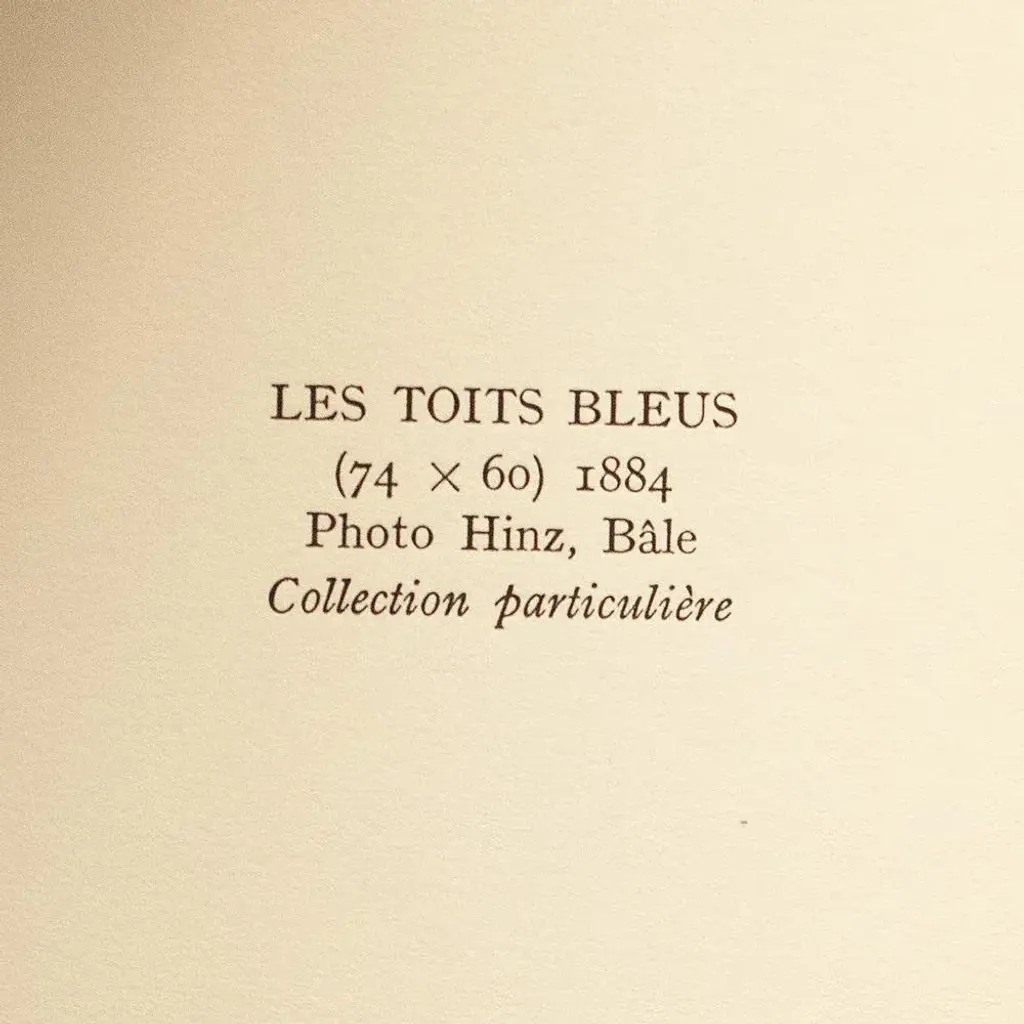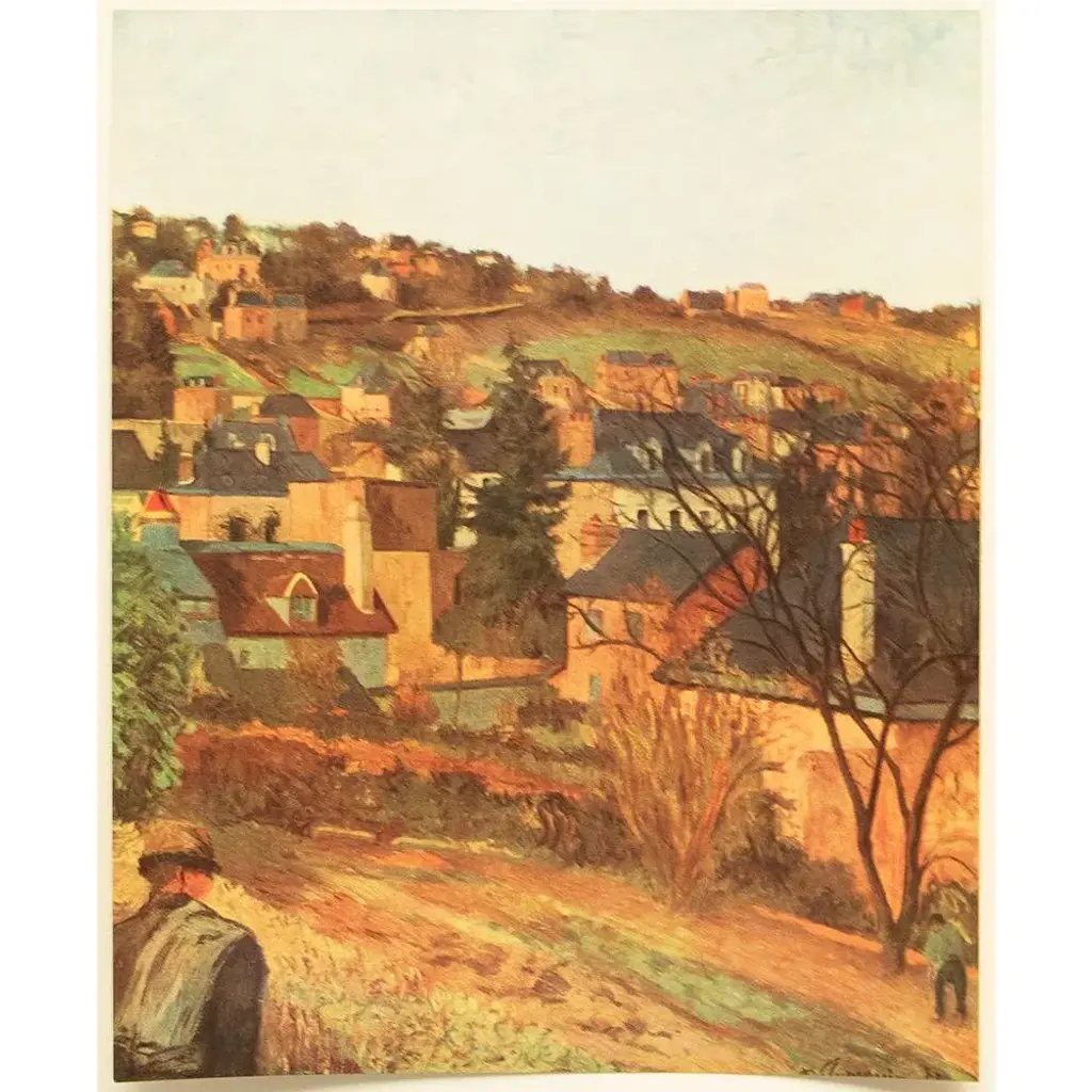 A lovely vintage offset lithograph (print) of painting "The Blue Roofs" by a major 19th-century painter, Paul Gauguin. Comes from a rare First Limited Edition art folio published by Editions du Chene in Paris, France, in 1949. Printed on one side. Hand tipped-in on a board of heavy paper. Information regarding the original artwork will be found by lifting the print, in French. Excellent condition - minor edge wear on the board, never framed. Overall 11"W x 14"H Image 8.10"W x 10.10"H