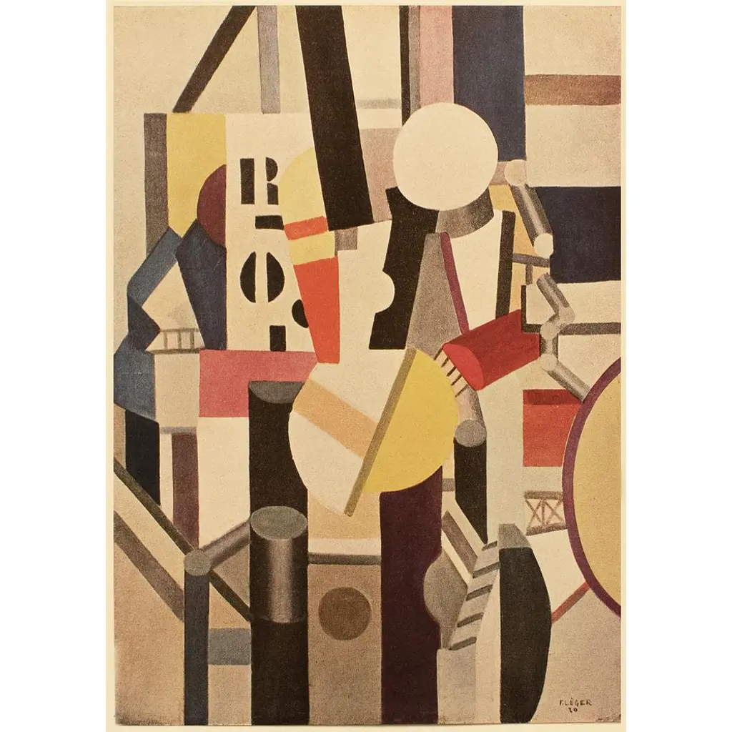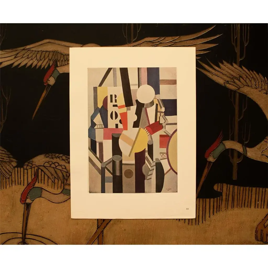 An excellent period offset lithograph, print, of the painting "Composition" (1920) by Fernand Léger. Comes from a First Limited German Edition art folio published by Editions Du Chene in Paris, France in 1950, in German language. Signed in the print (printed) at the lower right corner: F. Leger 20. Printed on one side. Hand tipped-in on a board of heavy paper. Information regarding the original artwork will be found in German, by lifting the piece. Numbered "III" in lower right corner. Excellent condition of the print; minor age and edge wear on the board; never framed. Overall 11"W x 15"H Image 7.70"W x 10.80" H