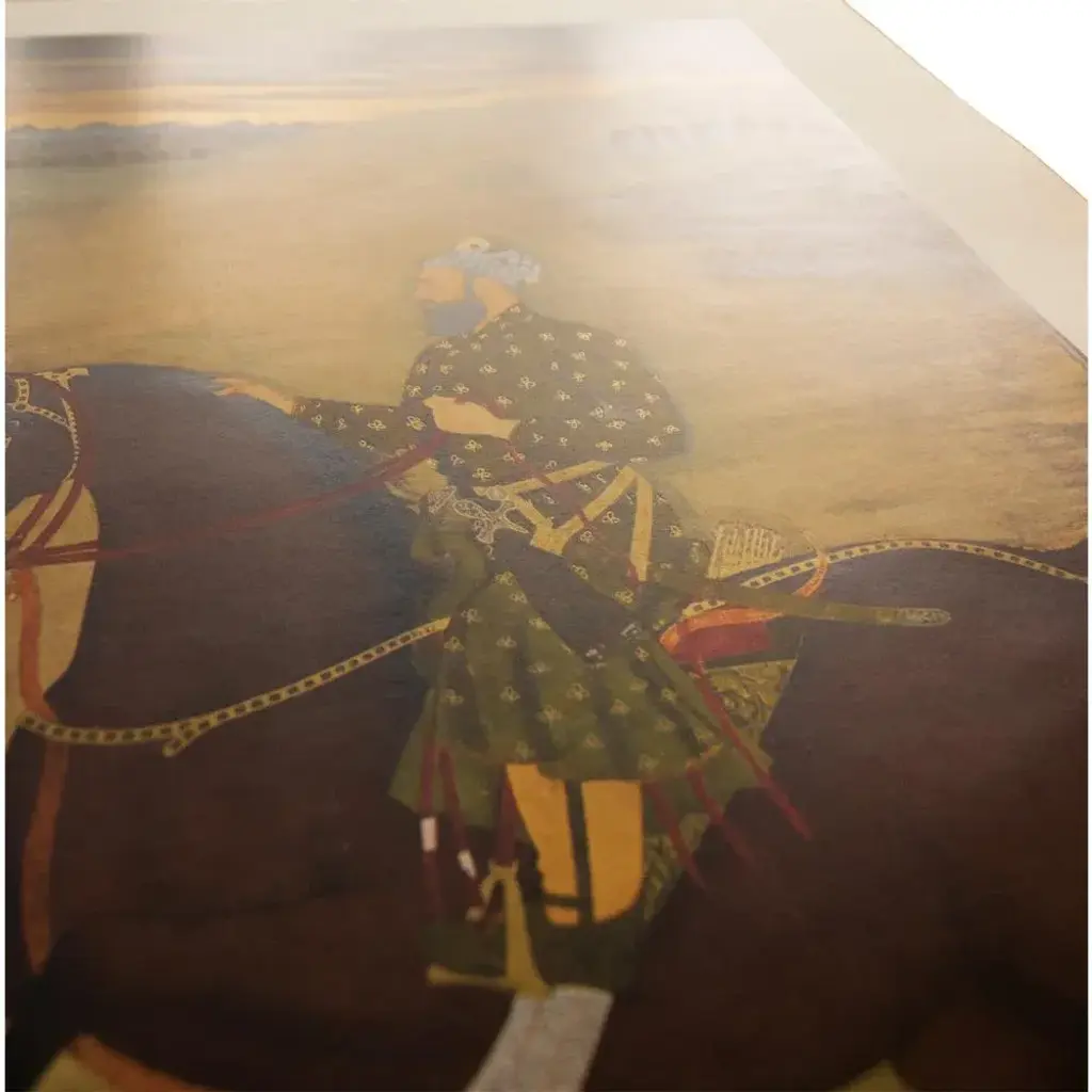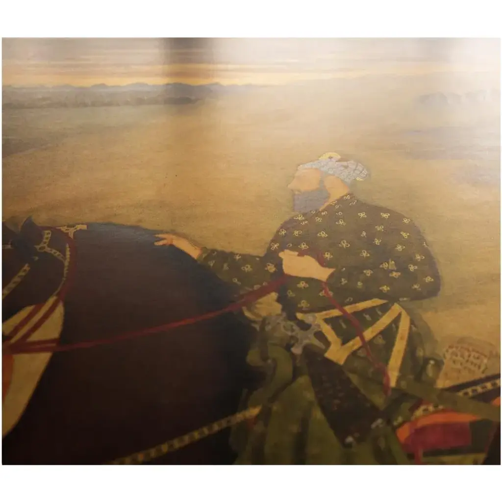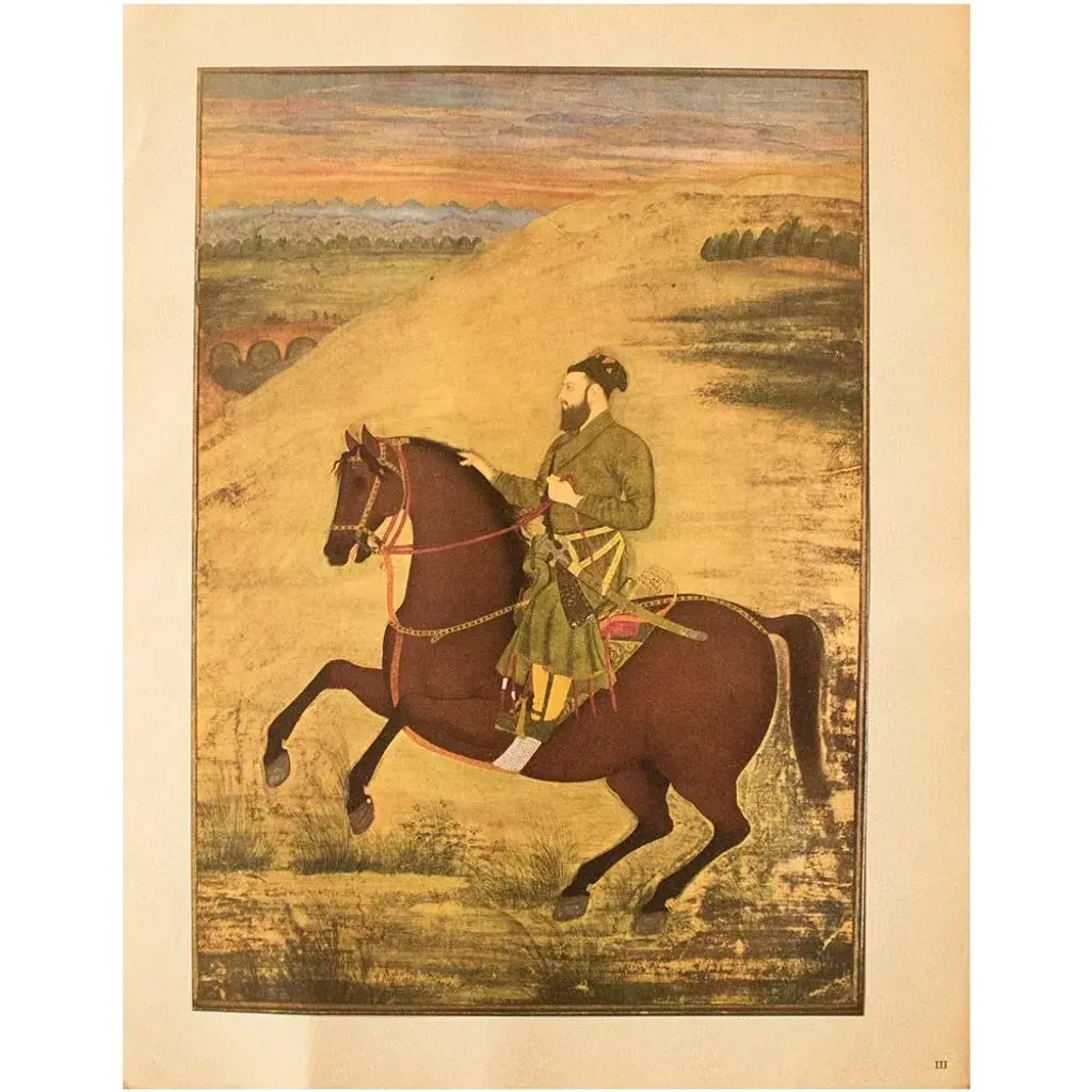 A stunning gold-leafed offset lithograph, print, of "Portrait of Said Khan" after 17th century Indian painting. Said Khan seated on a bay horse which capers in the manner of the coursiers of King Louis XIV. At the bottom of the lithograph, one reads in the print: "Work of Bitchitr Rai". Comes from a rare first limited edition art folio published by Les Editions du Chene in Paris, France in 1950. Printed on one side. Hand tipped-in on a board of heavy paper. Numbered "III" at the lower right corner of the board. Gold-leafed and very detailed. Superb quality, rich colors. Excellent condition - minor age wear on edges of the board, never framed. Image 8.8"W x 12.65"H - the same as the original artwork. The original 17th century Indian portrait of Said Khan is 8.8"W x 12.6"H, Collection J. Pozzi.