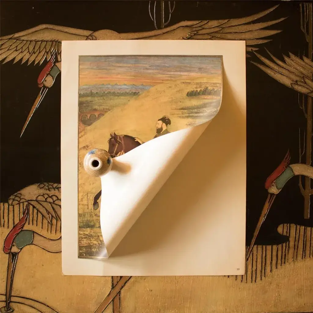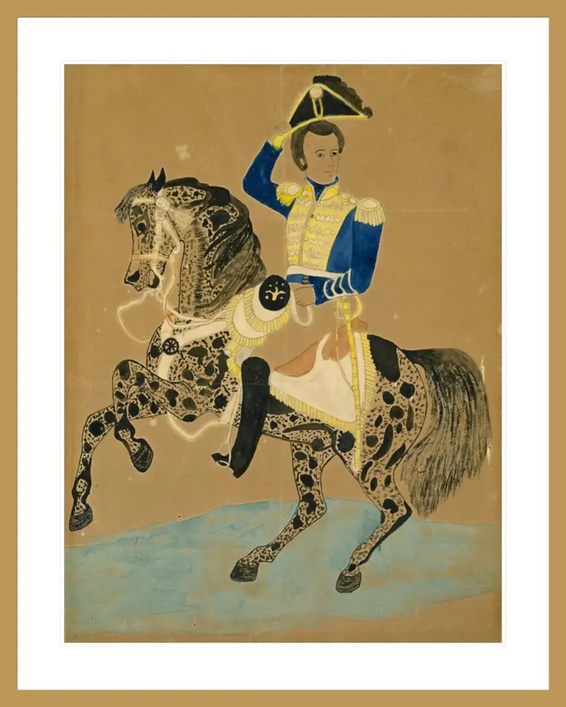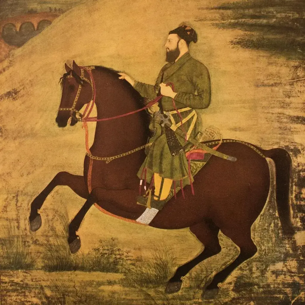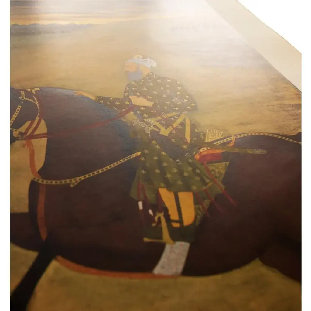 A stunning gold-leafed offset lithograph, print, of "Portrait of Said Khan" after 17th century Indian painting. Said Khan seated on a bay horse which capers in the manner of the coursiers of King Louis XIV. At the bottom of the lithograph, one reads in the print: "Work of Bitchitr Rai". Comes from a rare first limited edition art folio published by Les Editions du Chene in Paris, France in 1950. Printed on one side. Hand tipped-in on a board of heavy paper. Numbered "III" at the lower right corner of the board. Gold-leafed and very detailed. Superb quality, rich colors. Excellent condition - minor age wear on edges of the board, never framed. Image 8.8"W x 12.65"H - the same as the original artwork. The original 17th century Indian portrait of Said Khan is 8.8"W x 12.6"H, Collection J. Pozzi.