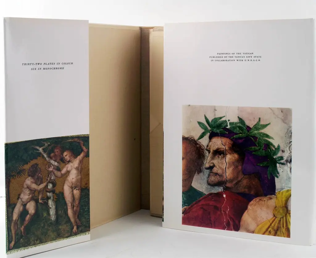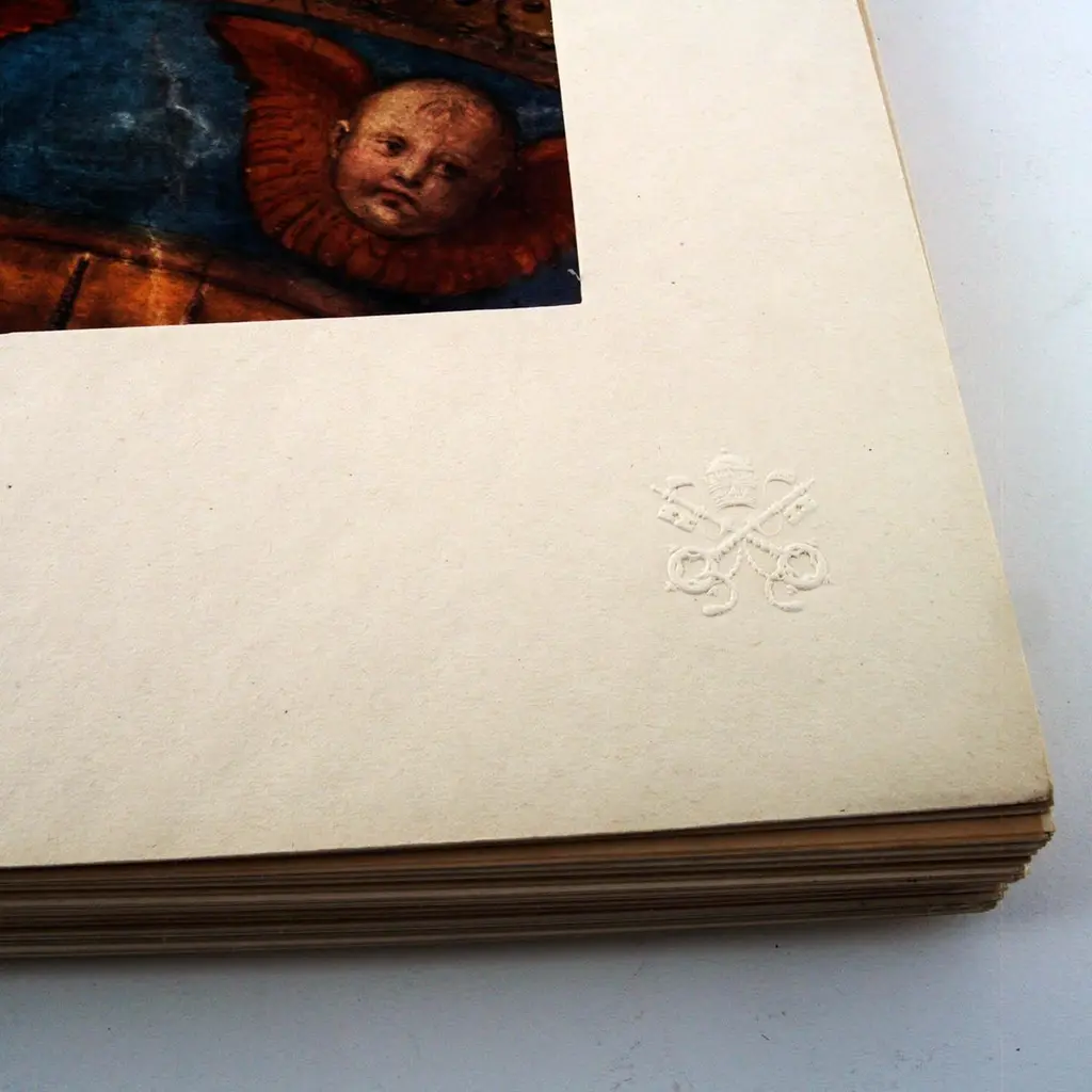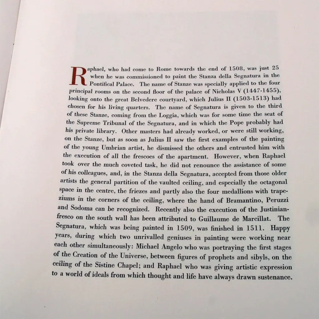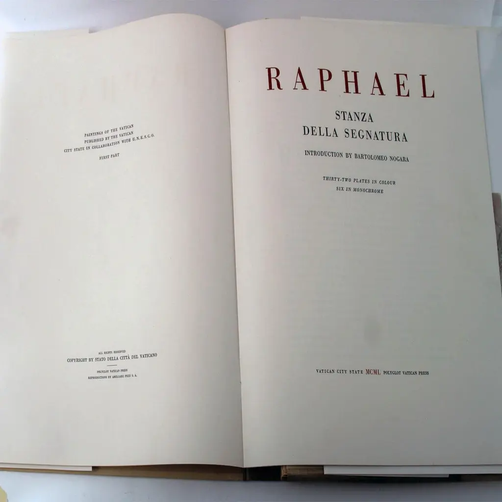 Midcentury, unique seven books of the "Stanza della Segnatura" by Raphael, containing thirty-two plates in color and six in monochrome, printed from Pope Pius XII ( Eugenio Pacelli) on 1950 which they were delivered to Heads of State and great personalities during theyrs Papal visit on Vatican.This books were printed in limited number of copies from the Vatican Editrice, branded dry, and as usual with destruction of the printing matricesVersions in English or German. The books are still originally packed.On kind authorization for the sale of the Holy See of Rome, the proceeds of which will go into charitable works.