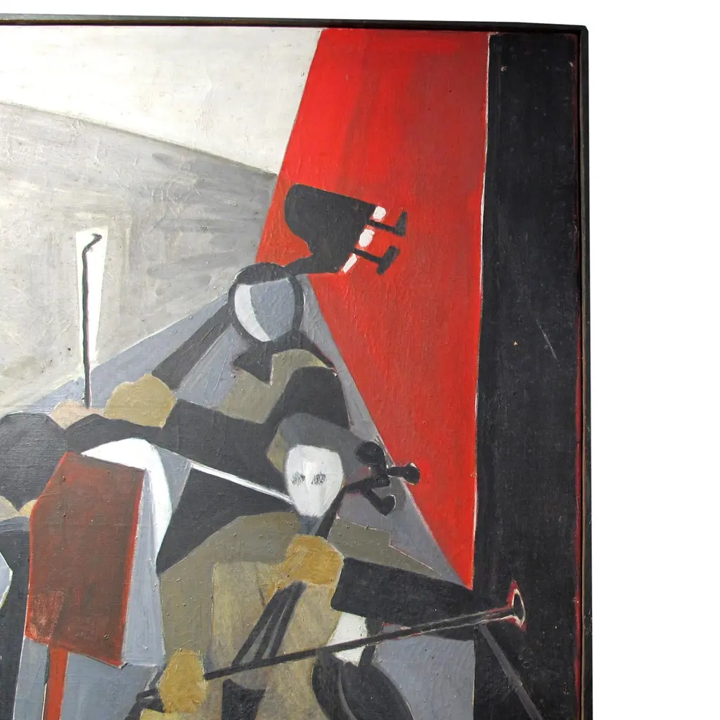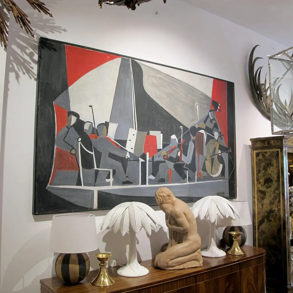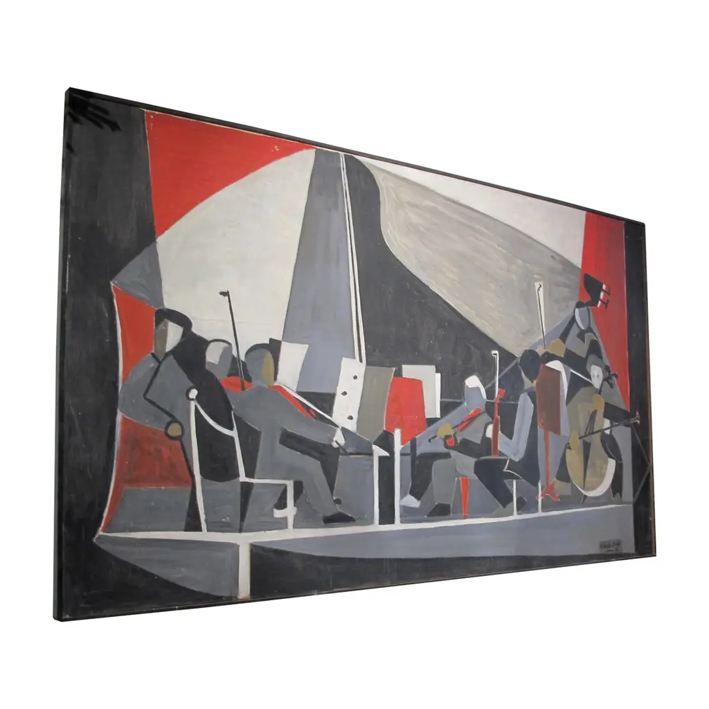 This is a large rectangular oil-on-canvas painting titled L'Orchestre, signed by François Jacquemin and dated 1950. The artwork reflects the dynamic post-war artistic movement associated with La Ruche, the artist colony in Paris's 15th arrondissement where Jacquemin was a member.The composition features an abstract depiction of an orchestra, rendered with bold geometric forms and a limited palette of black, white, grey, red, and yellow. The musicians and their instruments are stylised into angular shapes, creating a rhythm that mirrors the music they are performing. The contrast between light and dark areas and the striking use of red gives the piece energy and visual tension.This mid-century modern work is a tribute to the vibrancy of orchestral performance and an example of the innovative styles that emerged from La Ruche during this era. Its structured abstraction and dynamic composition exemplify Jacquemin’s engagement with the avant-garde movements of his time.Size: H116 cm x W196 cm