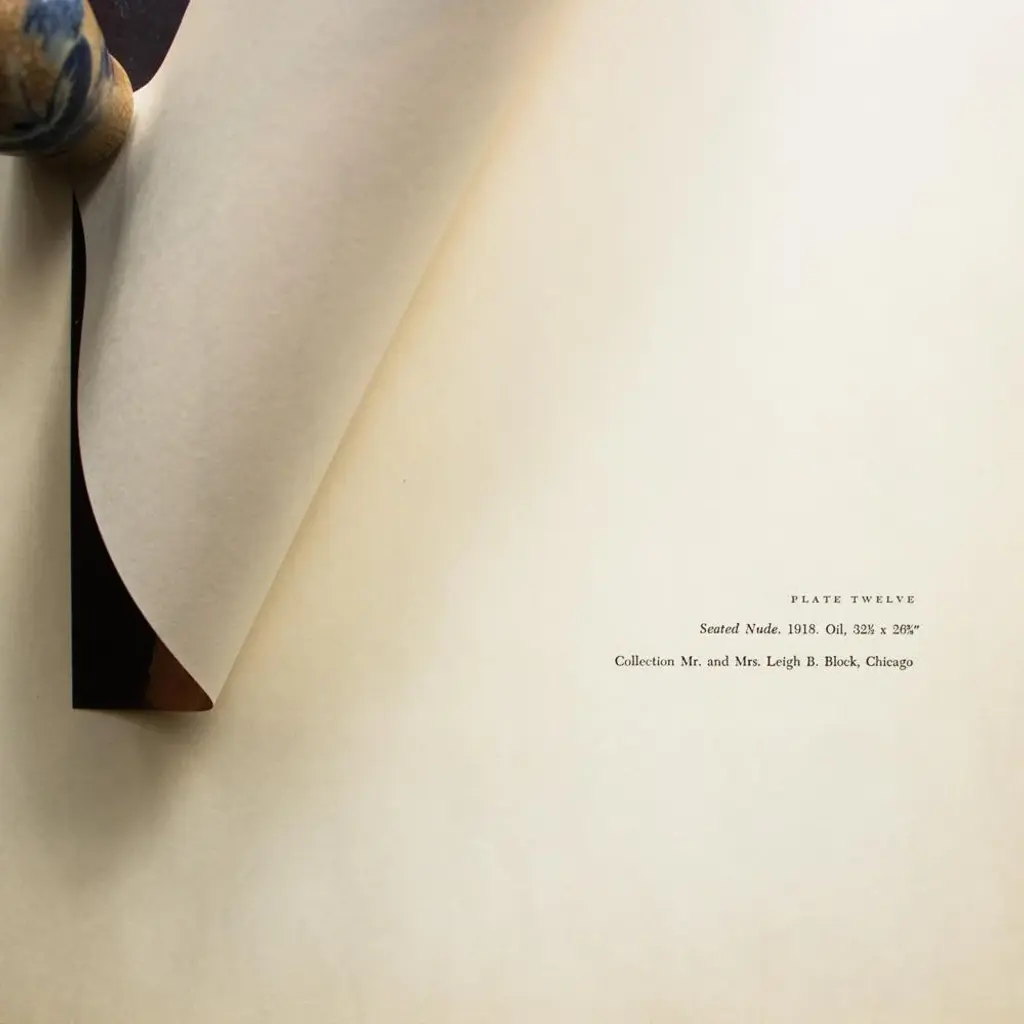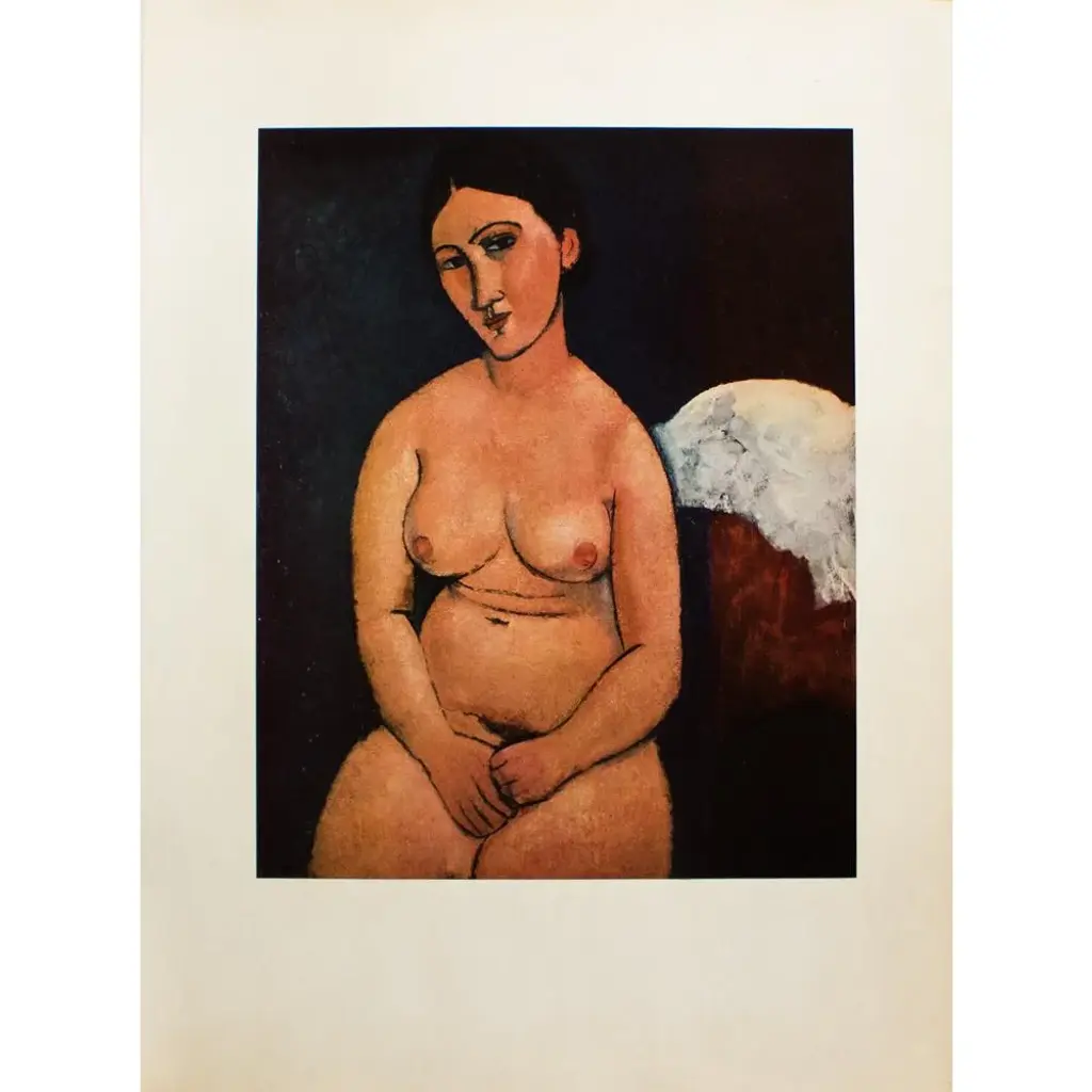 An excellent First Edition full-color print of painting "Seated Nude" (1918) by Amedeo Modigliani. Comes from a rare First Limited Edition art folio published in the 1950s. Printed on one side. Hand tipped-in on a board of heavy paper. Numbered on the board. Information regarding the original artwork will be found by lifting the piece. Excellent condition - minor edge wear on the board, never framed. Overall 11"W x 14.75"H Image 7.8"W x 10"H