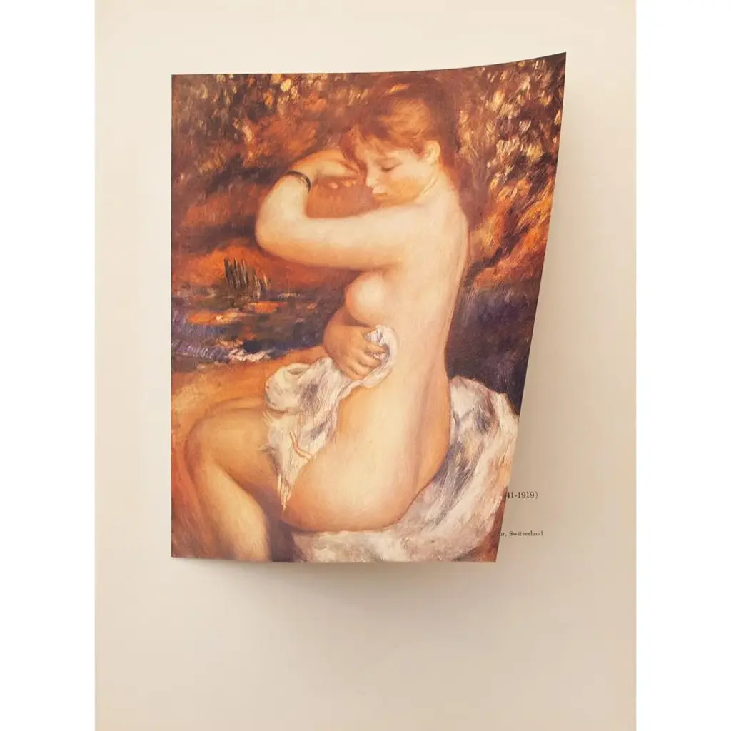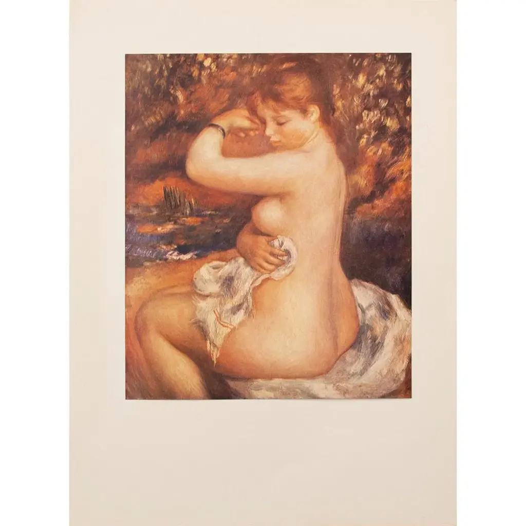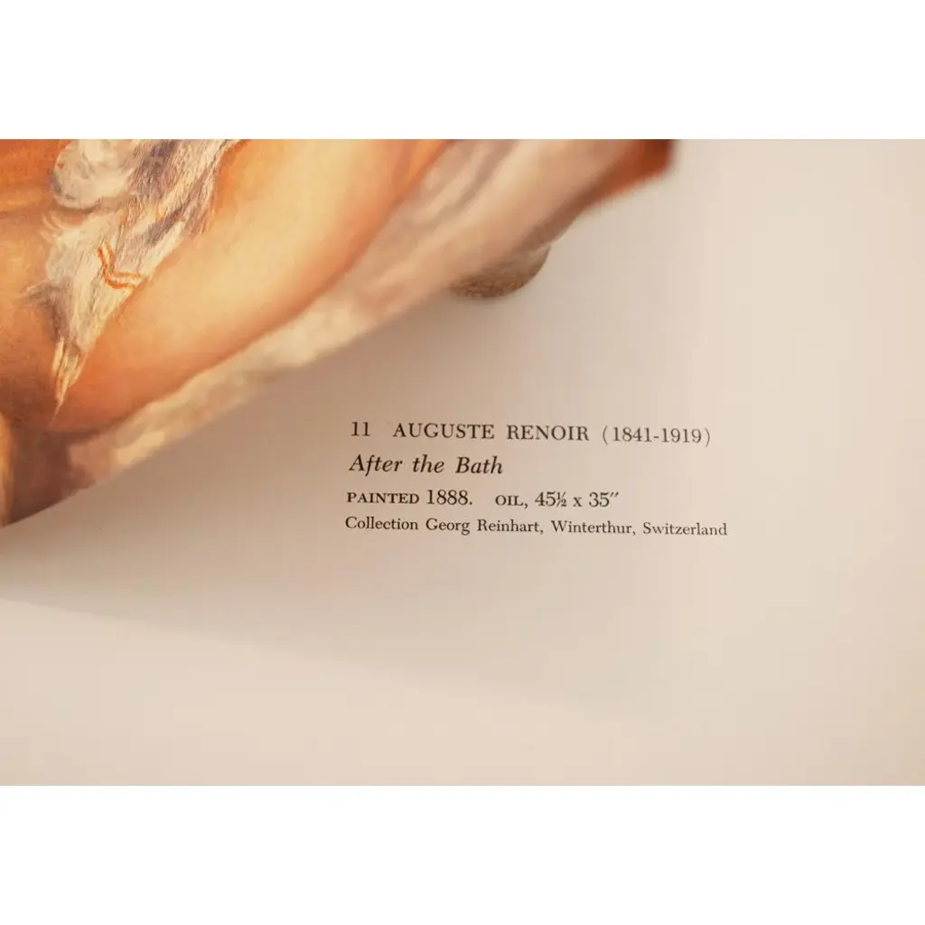 A lovely photogravure of painting 'After the Bath" by Auguste Renoir. Comes from first limited American edition folio published in 1950s. Printed on one side. Hand tipped-in on a sheet of heavy paper. Information regarding the original artwork will be found by lifting the plate. Excellent condition - never framed. 11"W x 14.75"H overall 7.95"W x 9.75"H image