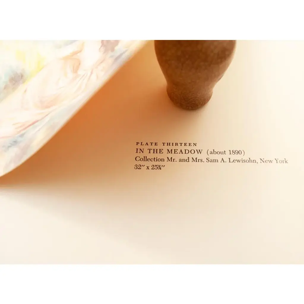 A lovely vintage First Edition photogravure after painting "In the Meadow" by Auguste Renoir. Comes from first limited American edition folio published in 1950s. Signed in the print. Printed on one side. Hand tipped-in on a sheet of heavy paper. Information regarding the original artwork will be found by lifting the plate. Excellent condition - never framed. 11"W x 14.75"H overall 8"W x 10"H image