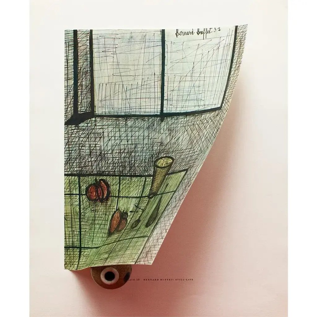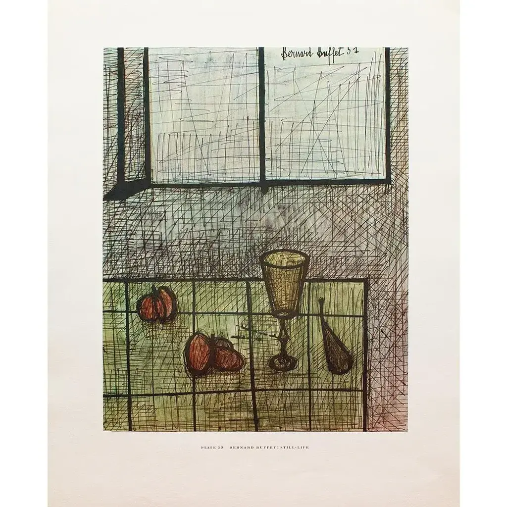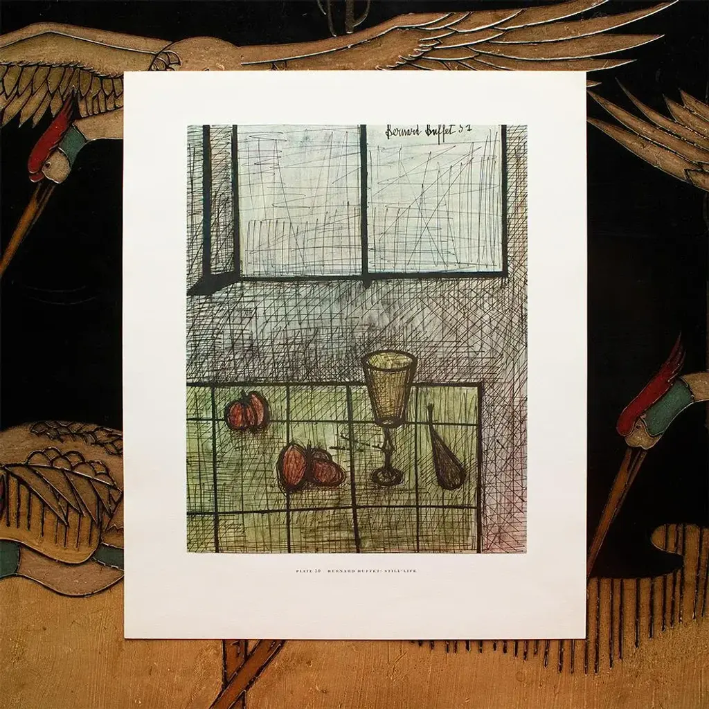 A rare period vintage full-color print of painting "Still Life" by Bernard Buffet from a First Edition art folio of The Albert D. Lasker Collection. Printed in Switzerland in the 1950s, probably by Albert Skira. Printed on one side. Hand tipped-in on a board of heavy paper. Copy below the image and on the back of the board. Excellent condition - minor edge wear on the board, never framed. Overall 11"W x 14"H Image 8.05"W x 10.55"H