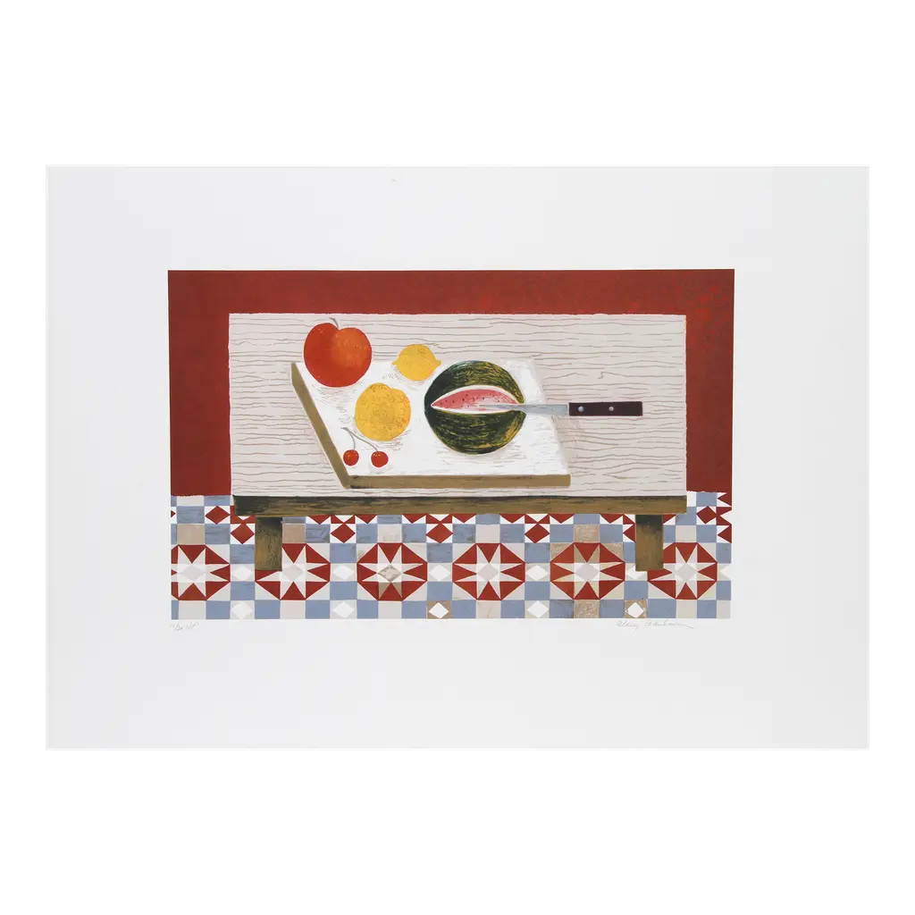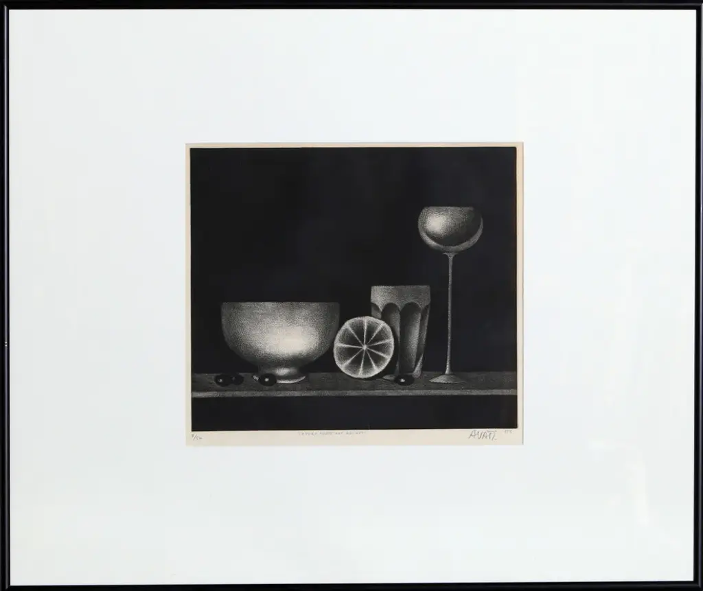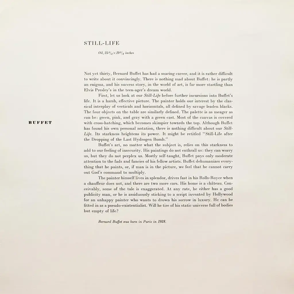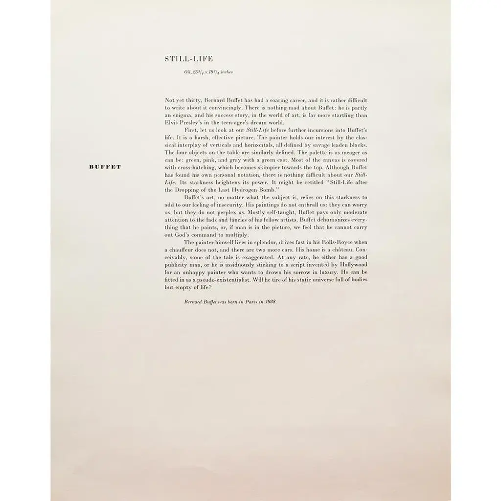 A rare period vintage full-color print of painting "Still Life" by Bernard Buffet from a First Edition art folio of The Albert D. Lasker Collection. Printed in Switzerland in the 1950s, probably by Albert Skira. Printed on one side. Hand tipped-in on a board of heavy paper. Copy below the image and on the back of the board. Excellent condition - minor edge wear on the board, never framed. Overall 11"W x 14"H Image 8.05"W x 10.55"H