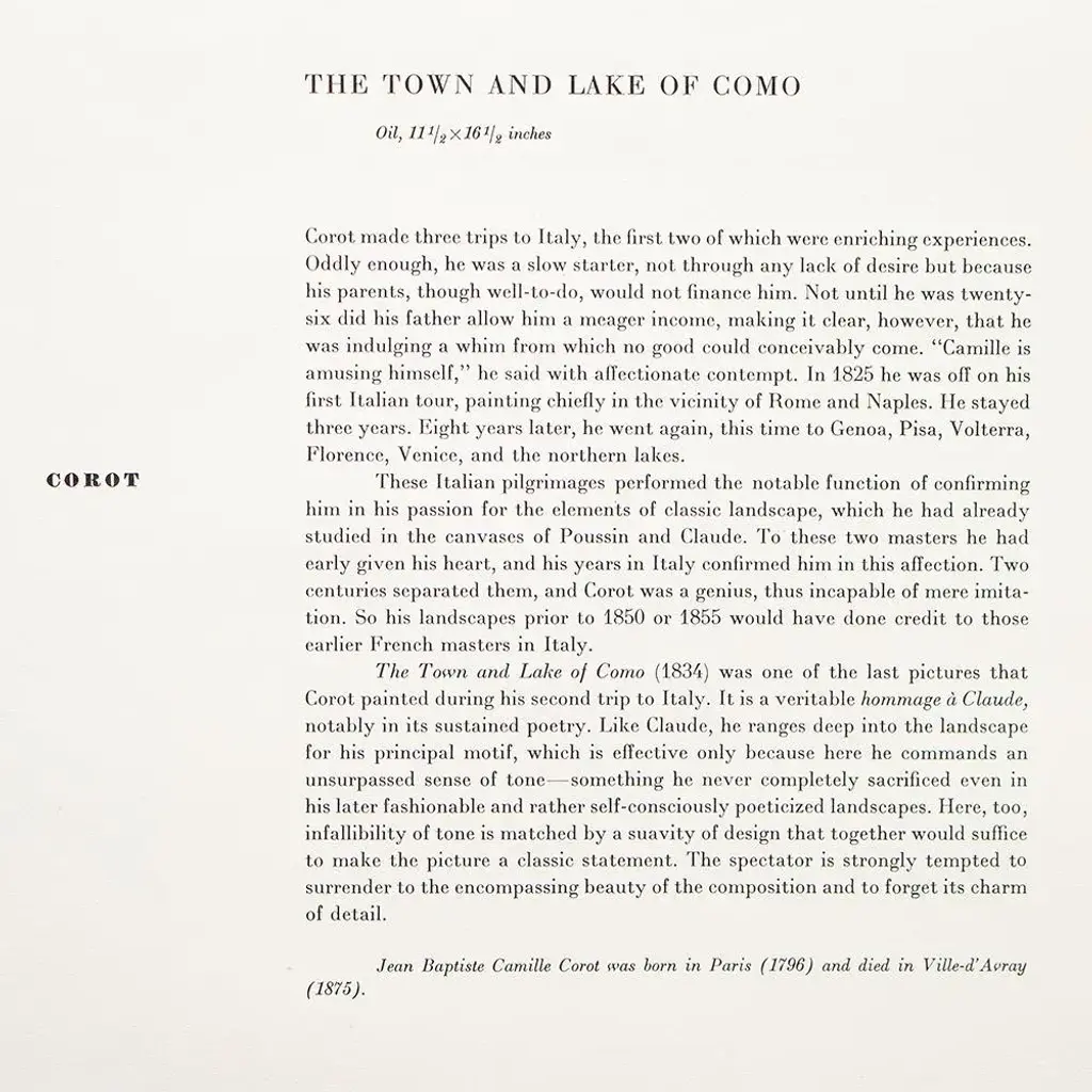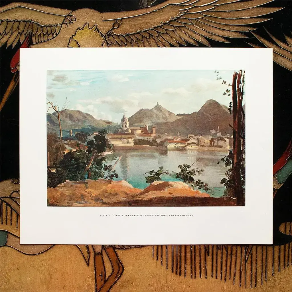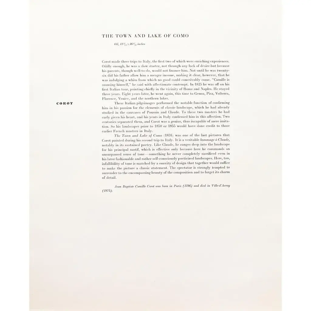 A rare vintage full-color print of Impressionist painting "The Town and Lake of Como" by Camille Jean Baptiste Corot from a First Edition art folio of The Albert D. Lasker Collection. Printed in Switzerland in the 1950s, probably by Albert Skira. Printed on one side. Hand tipped-in on a board of heavy paper. Copy below the image and on the back of the board. Excellent condition - minor age wear on the board, never framed. Overall 14"W x 11"H Image 11"W x 7.75"H