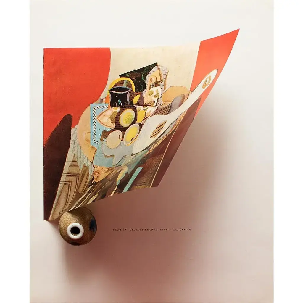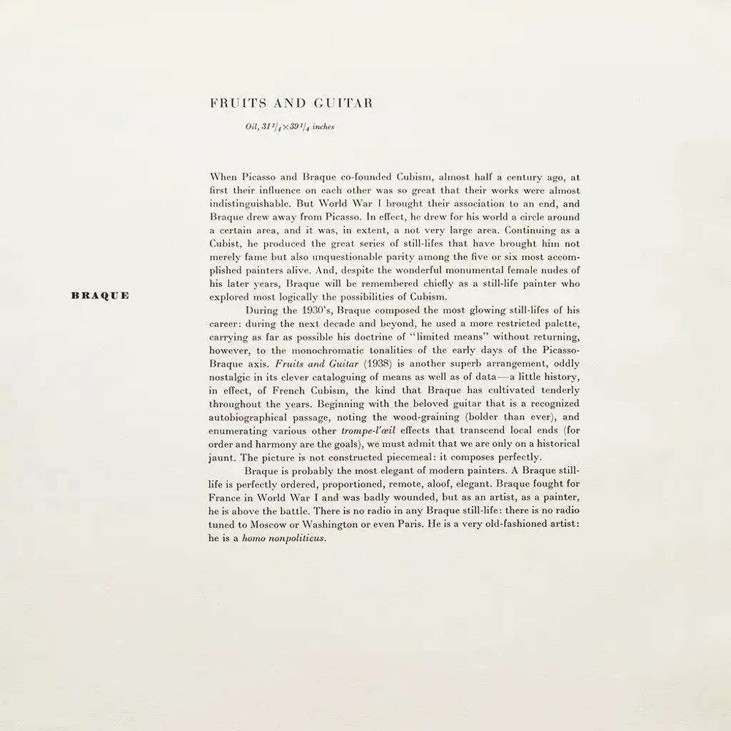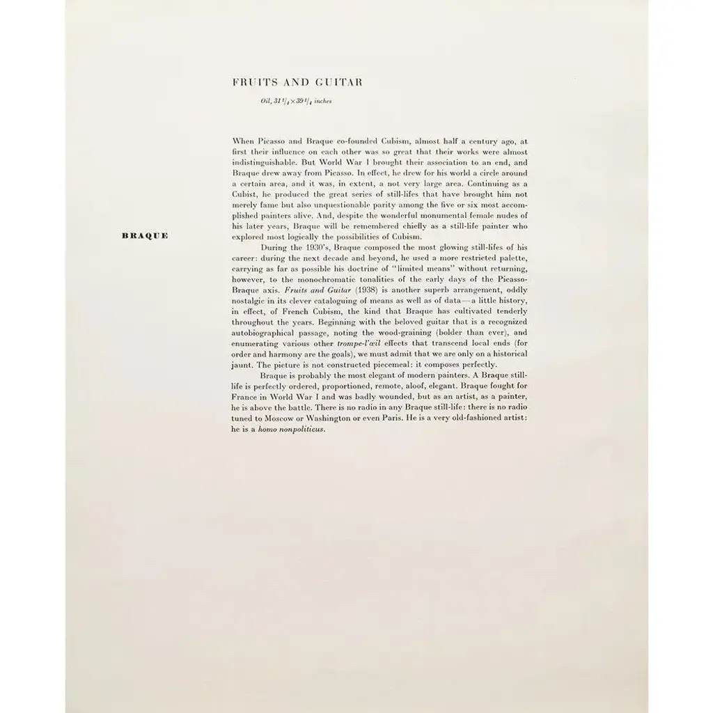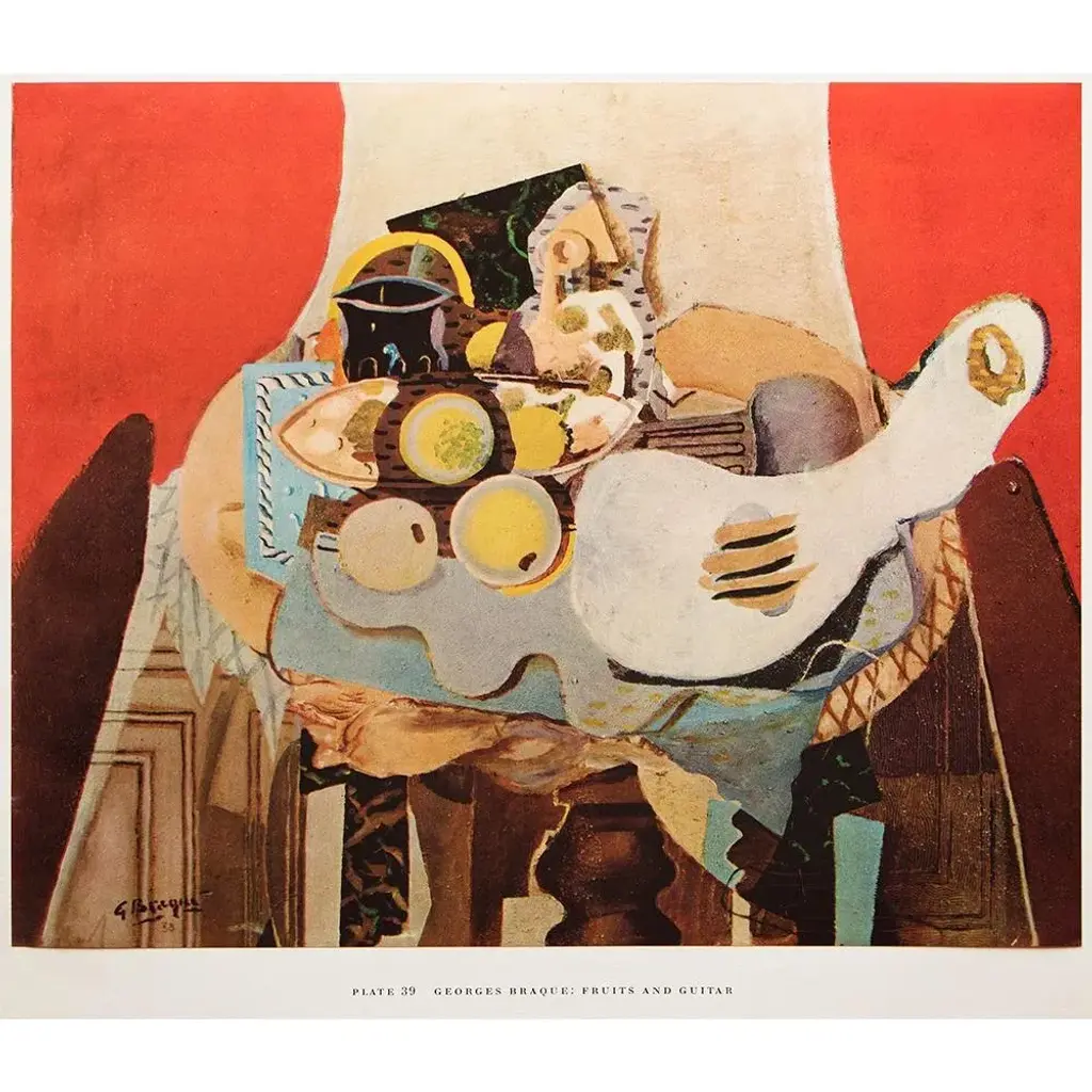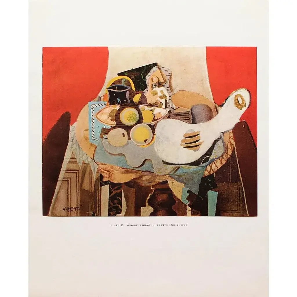 A rare vintage full-color print of Cubist painting "Fruits and Guitar" by Georges Braque from a First Edition art folio of The Albert D. Lasker Collection. Printed in Switzerland in the 1950s, probably by Albert Skira. Printed on one side. Hand tipped-in on a board of heavy paper. Copy below the image and on the back of the board. Excellent condition - minor edge wear on the board, never framed. Overall 11"W x 14"H Image 9.75"W x 8"H