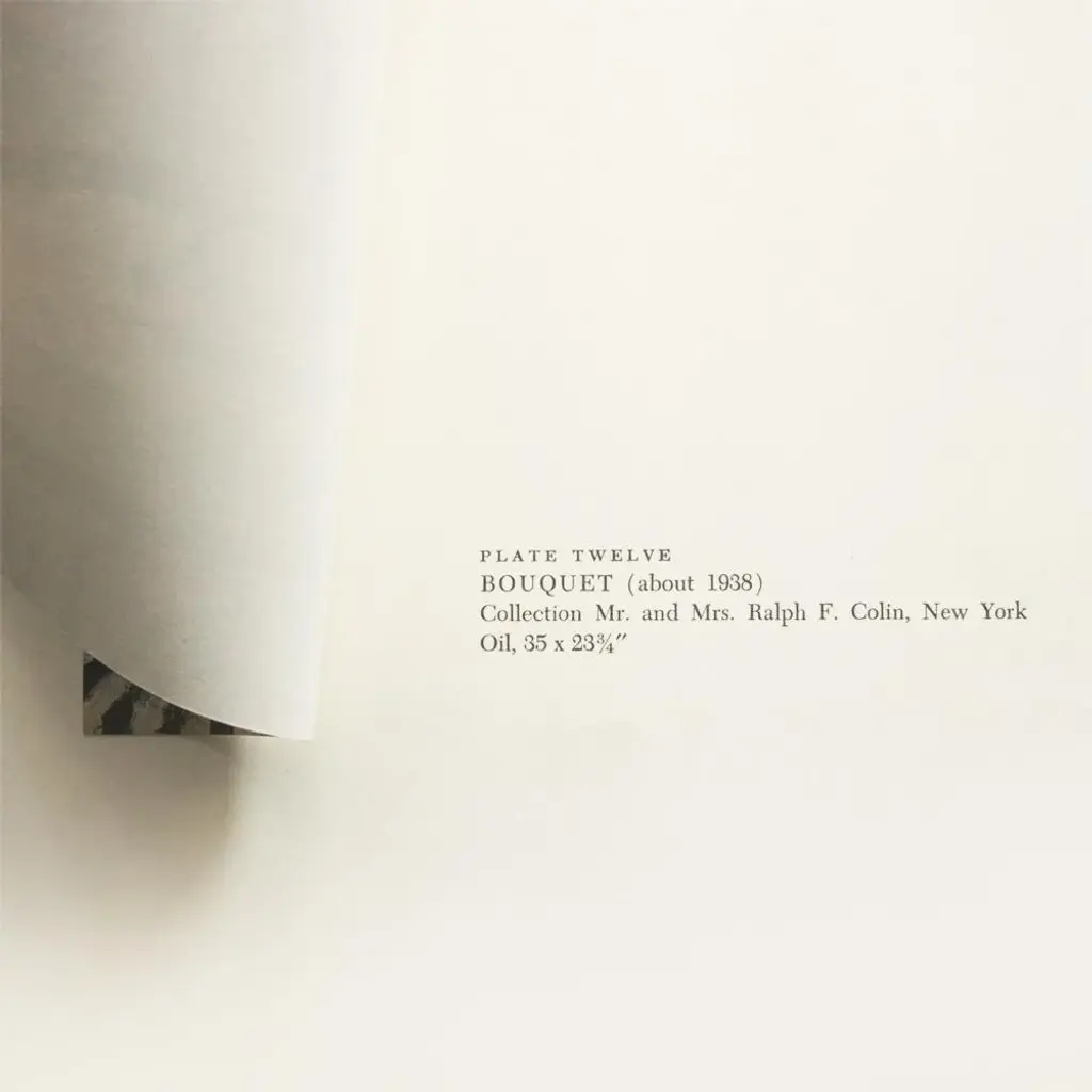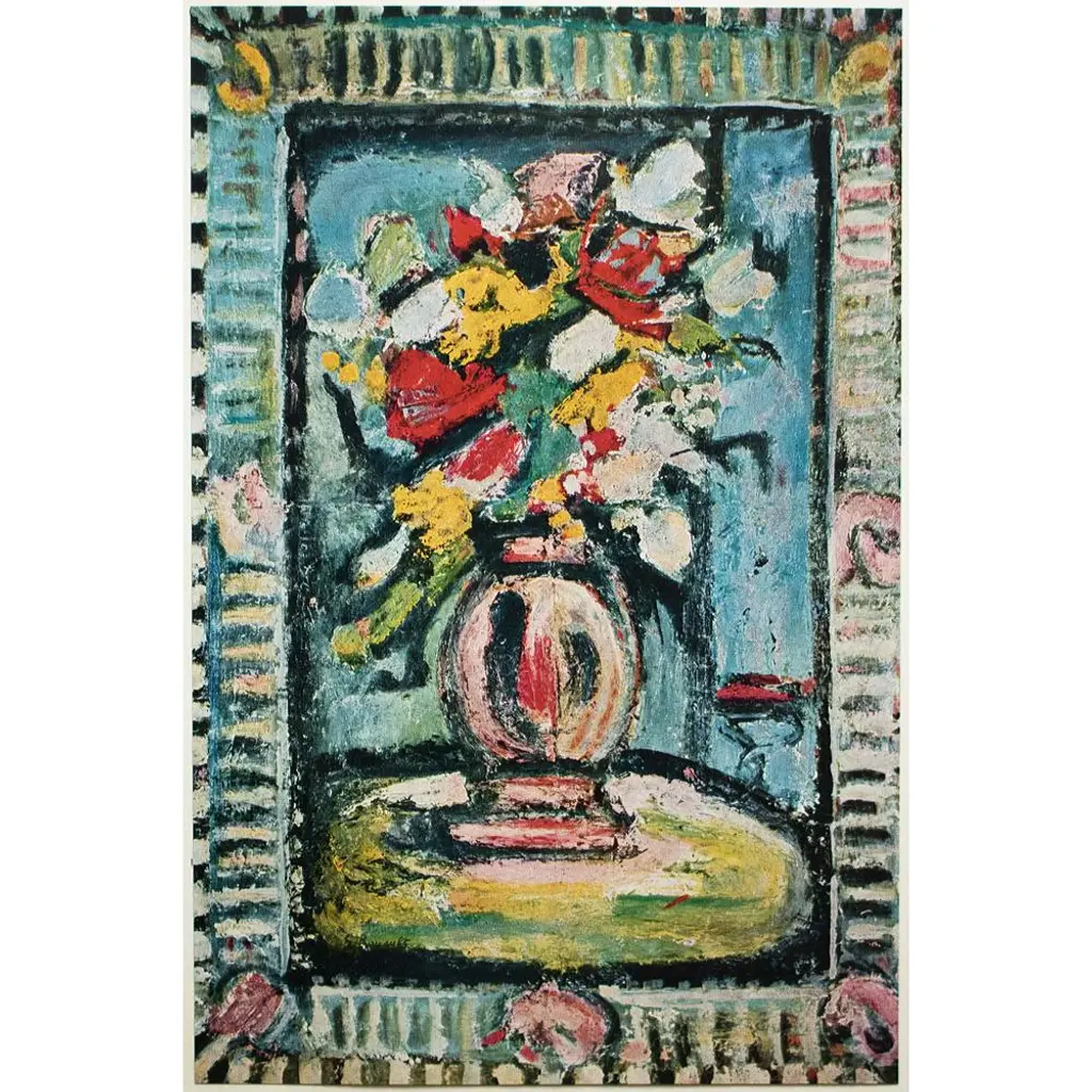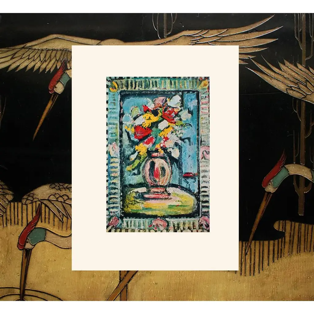 A lovely First Edition period offset lithograph print of oil painting "Bouquet" (1938) by Georges Rouault (1871-1958). Comes from a rare First Limited American Edition art folio published in the mid 1950s. Printed on one side. Hand tipped-in on a sheet of heavy paper. Information regarding the original artwork will be found by lifting the lithograph. Colors are brilliant. First Limited American Edition. Excellent - minor edge wear on the board, never framed. Image 6.65"W x 10.20"H