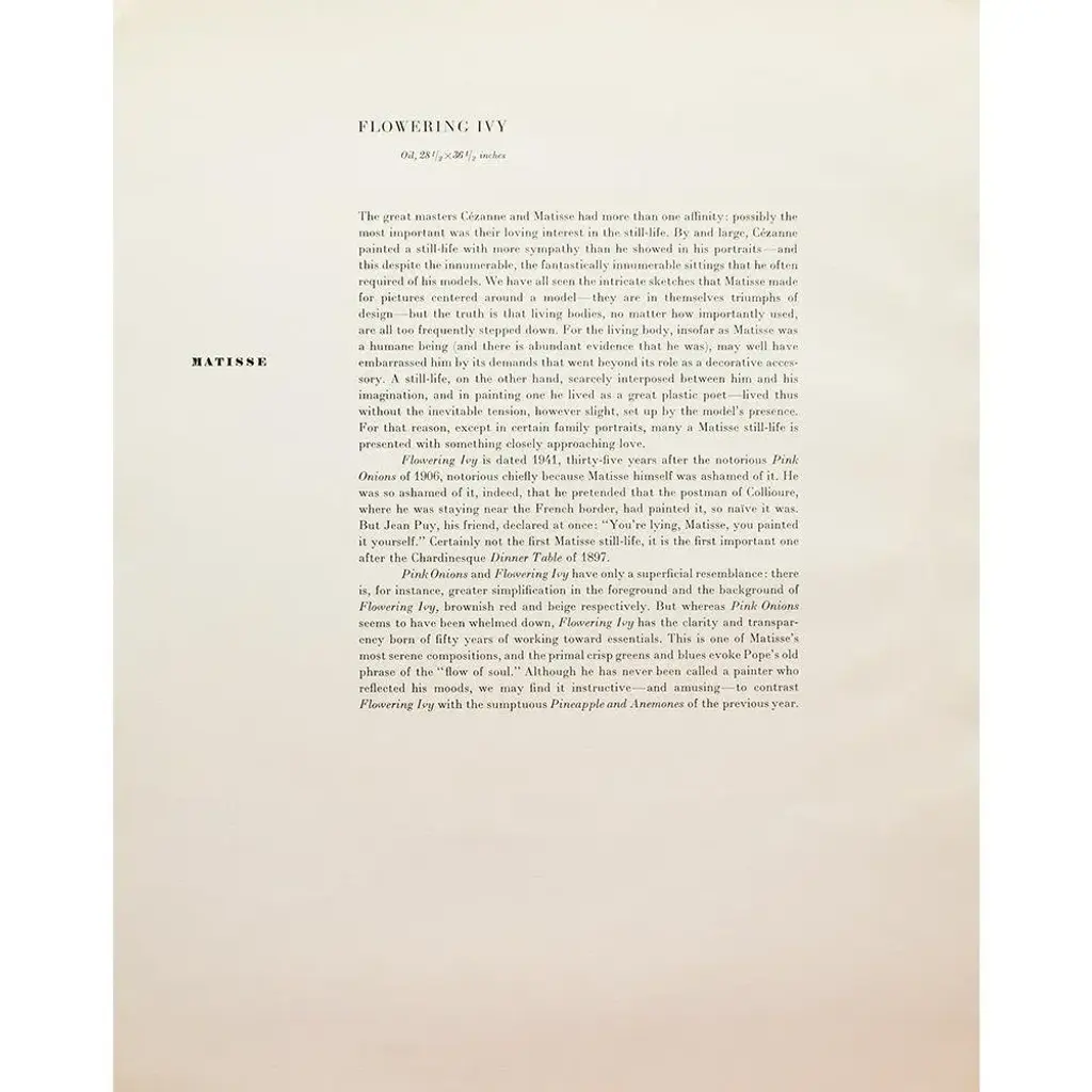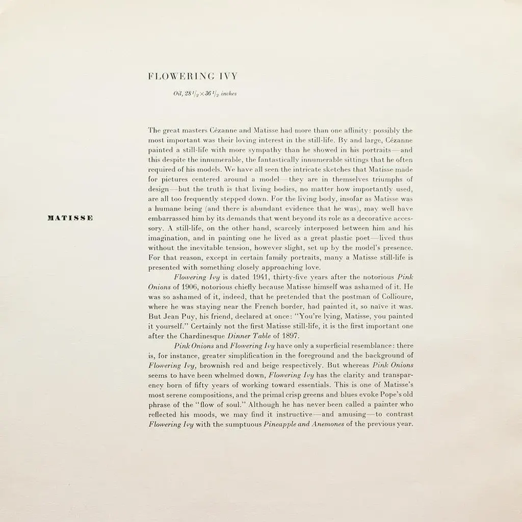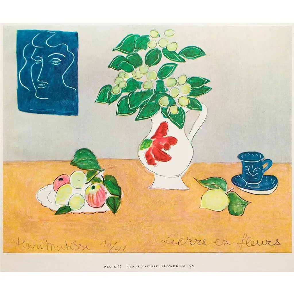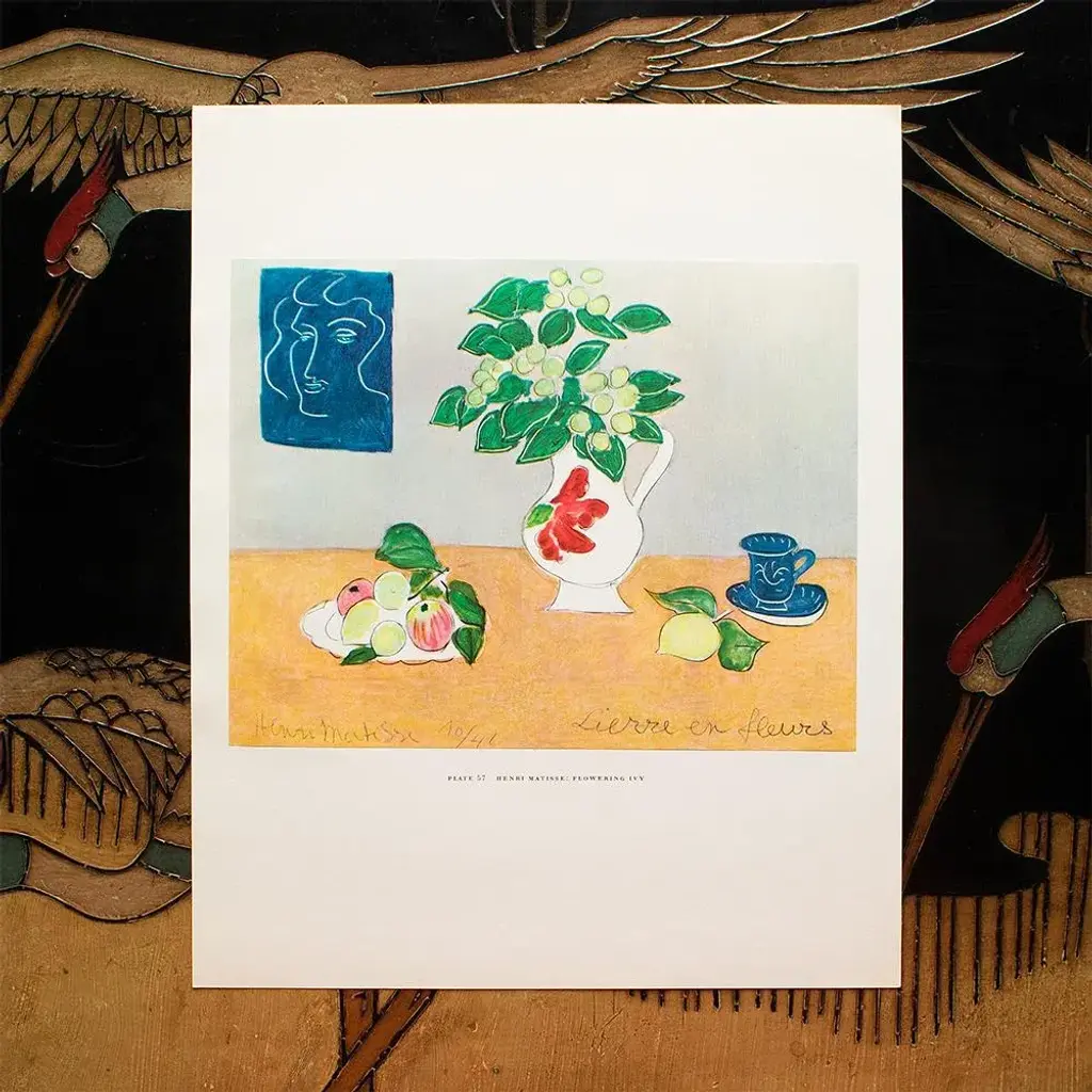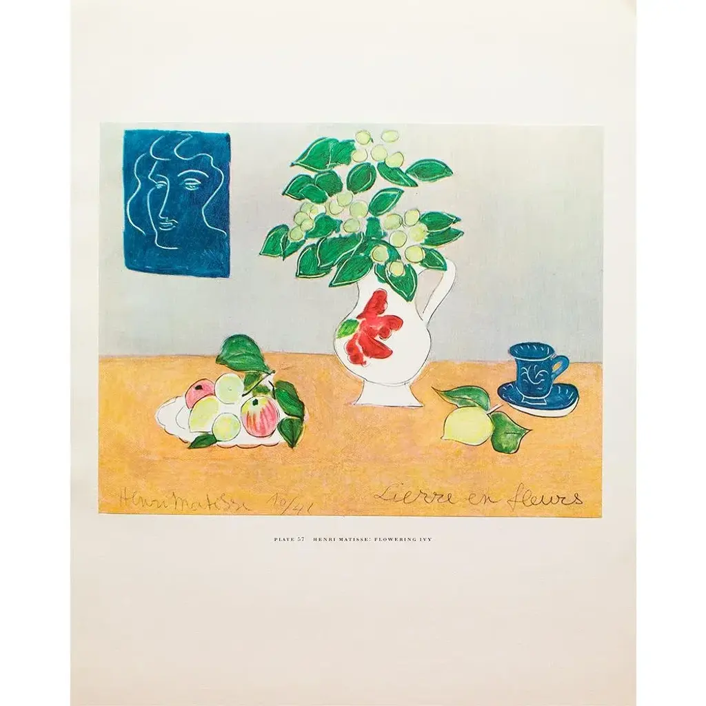 A rare period vintage full-color print of oil painting "Flowering Ivy" by Henri Matisse from a First Edition art folio of The Albert D. Lasker Collection. Printed in Switzerland in the 1950s, probably by Albert Skira. Printed on one side. Hand tipped-in on a board of heavy paper. Copy below the image and on the back of the board. Excellent condition - minor edge wear on the board, never framed. Overall 11"W x 14"H Image 9.75"W x 7.75"H