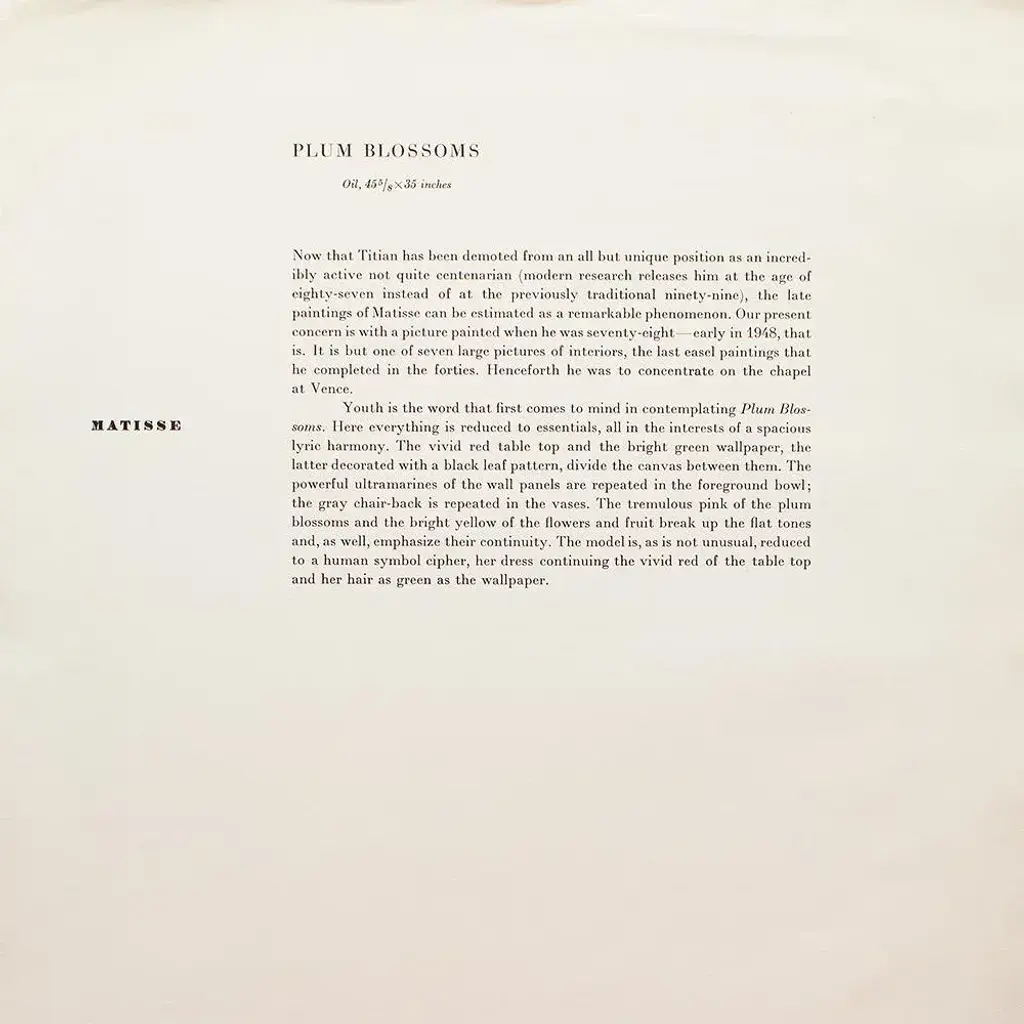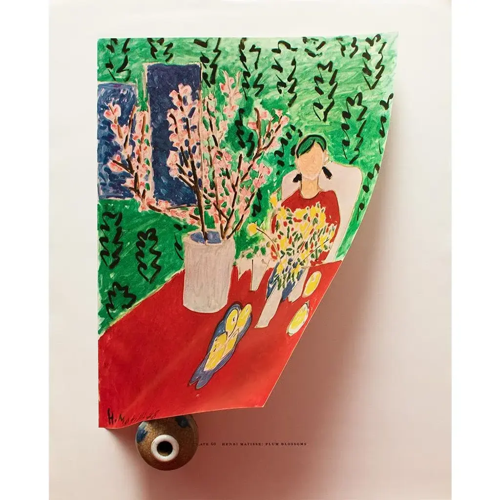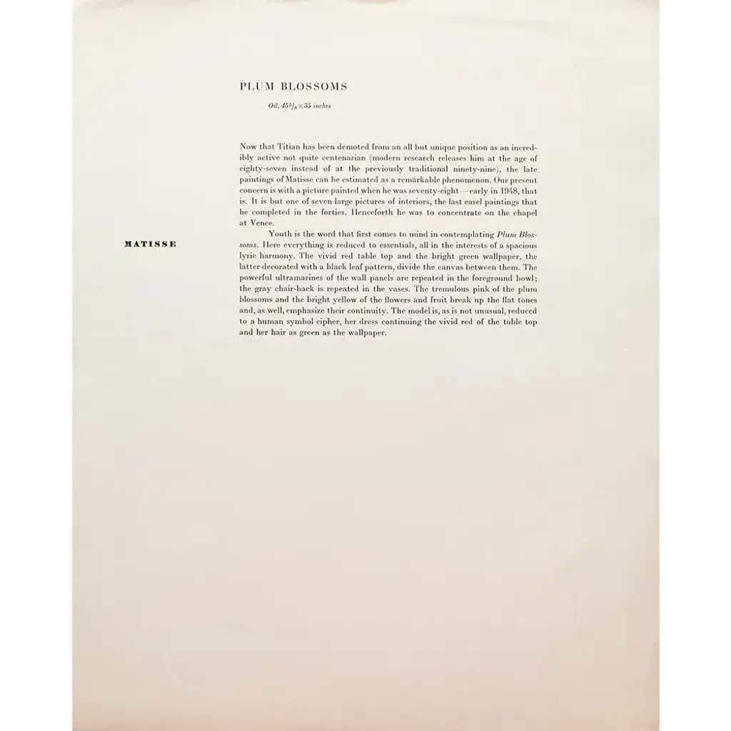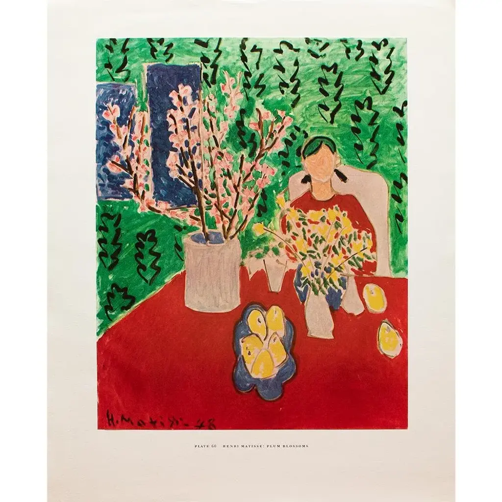 A rare period vintage full-color print of oil painting "Plum Blossoms" by Henri Matisse from a First Edition art folio of The Albert D. Lasker Collection. Printed in Switzerland in the 1950s, probably by Albert Skira. Printed on one side. Hand tipped-in on a board of heavy paper. Copy below the image and on the back of the board. Very good condition - minor age wear, never framed. Overall 11"W x 14"H Image 8.30"W x 10.90"H