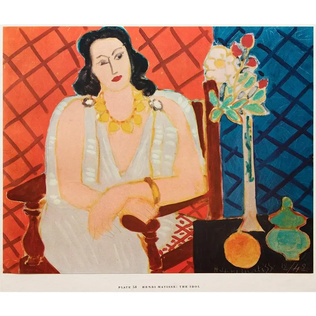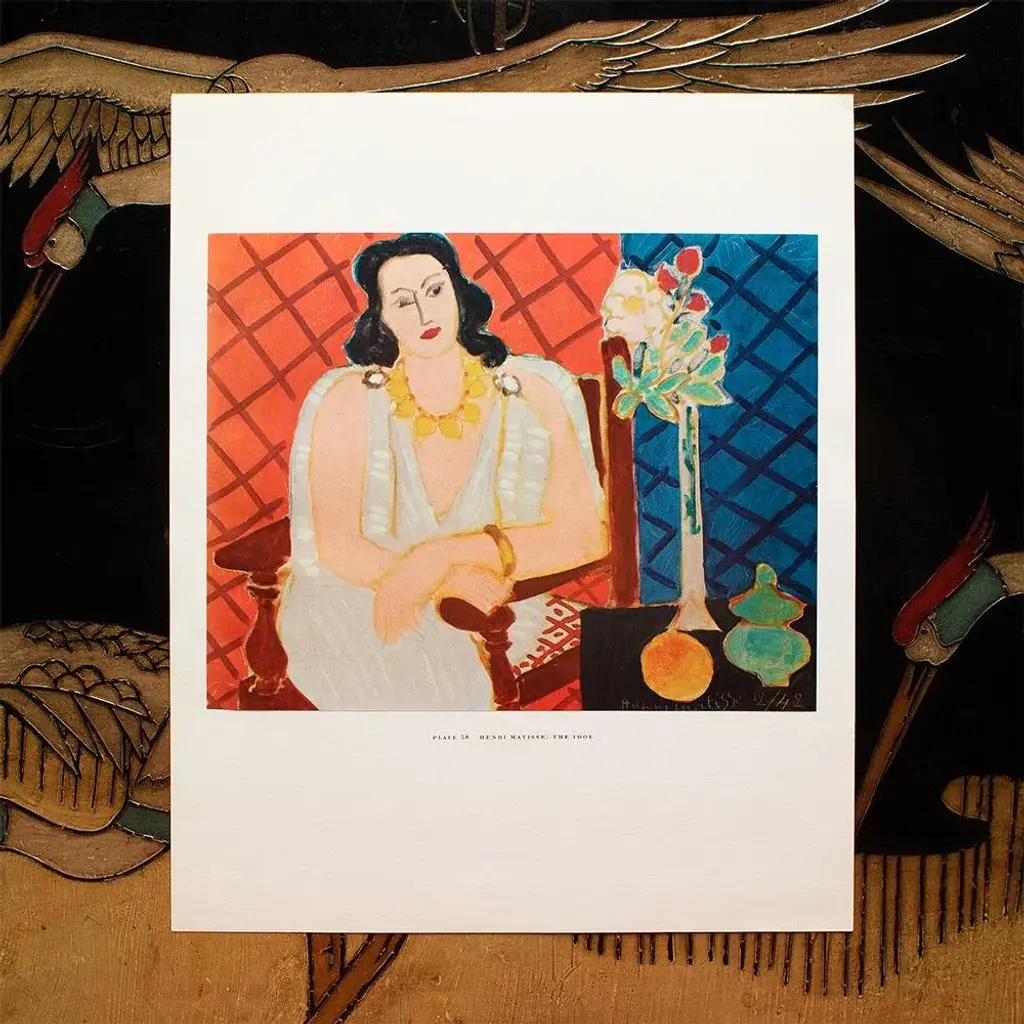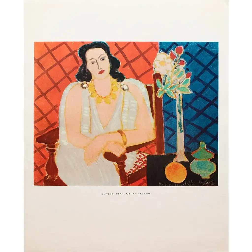 A rare period vintage full-color print of oil painting "The Idol" by Henri Matisse from a First Edition art folio of The Albert D. Lasker Collection. Printed in Switzerland in the 1950s, probably by Albert Skira. Printed on one side. Hand tipped-in on a board of heavy paper. Copy below the image and on the back of the board. Excellent condition - minor edge wear on the board, never framed. Overall 11"W x 14"H Image 9.80"W x 8"H