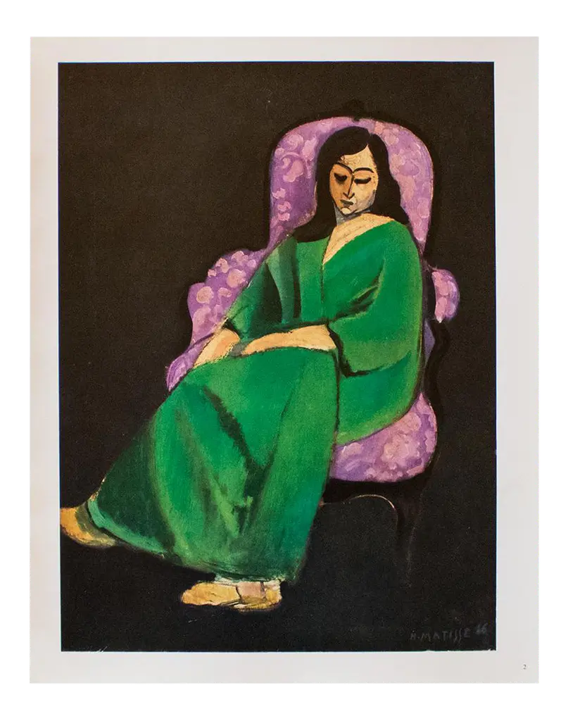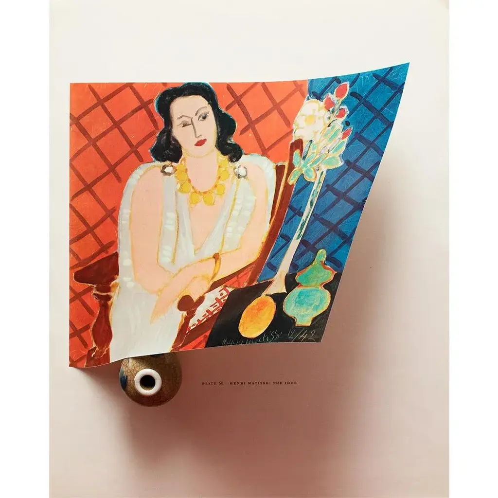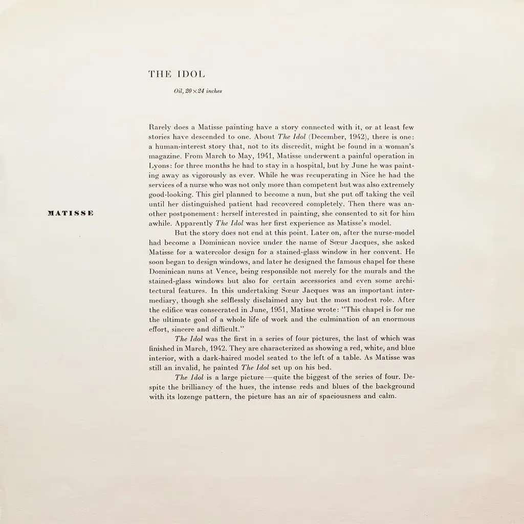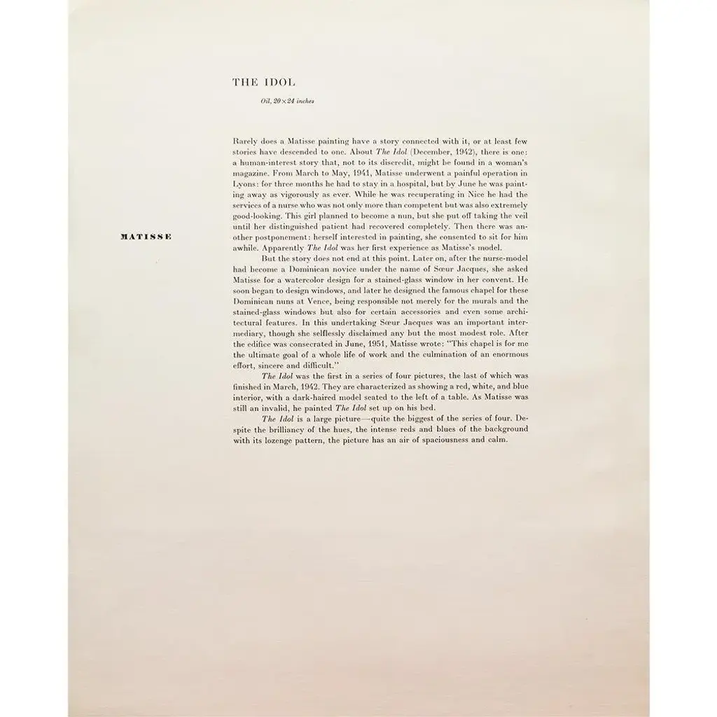A rare period vintage full-color print of oil painting "The Idol" by Henri Matisse from a First Edition art folio of The Albert D. Lasker Collection. Printed in Switzerland in the 1950s, probably by Albert Skira. Printed on one side. Hand tipped-in on a board of heavy paper. Copy below the image and on the back of the board. Excellent condition - minor edge wear on the board, never framed. Overall 11"W x 14"H Image 9.80"W x 8"H