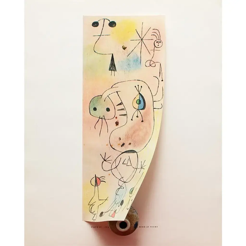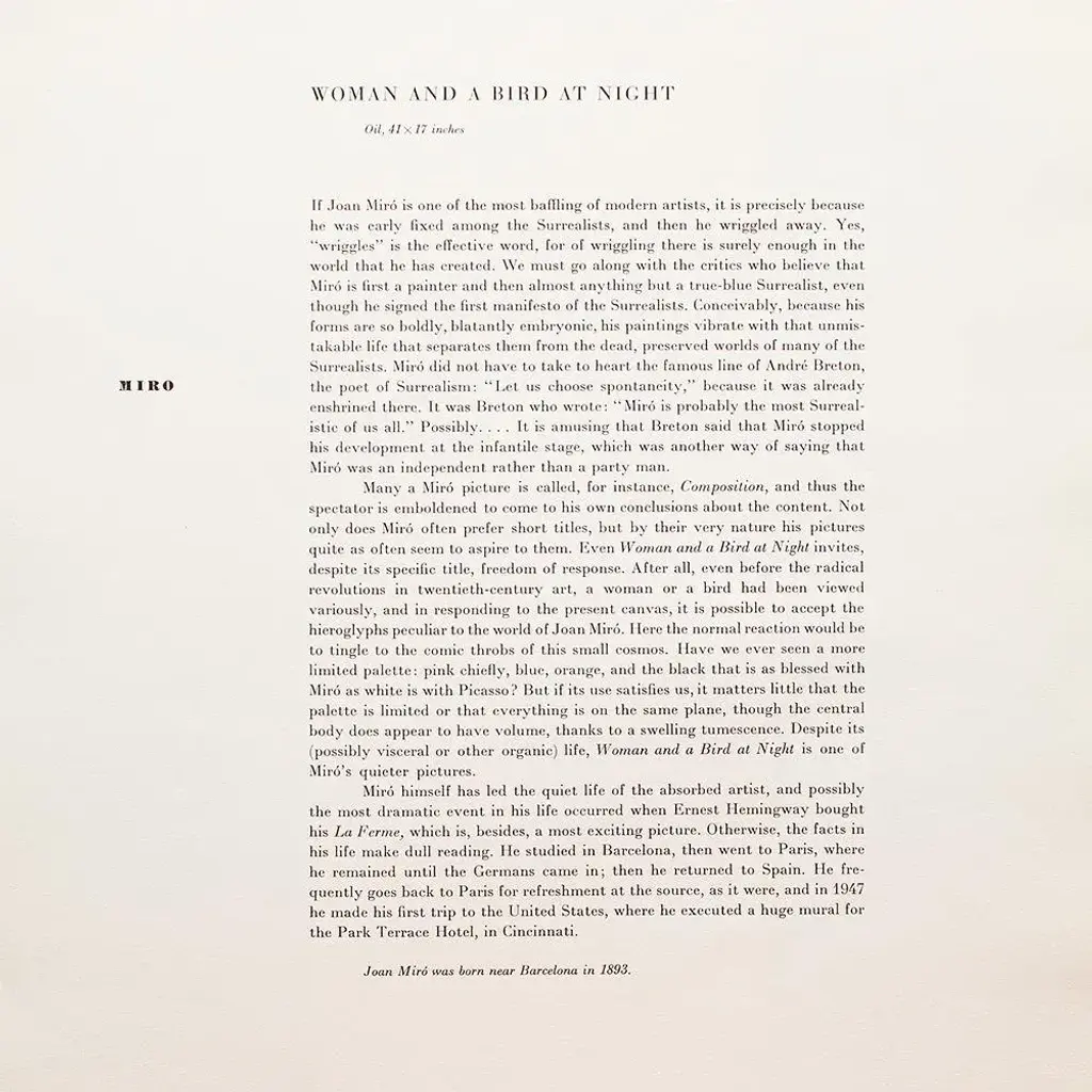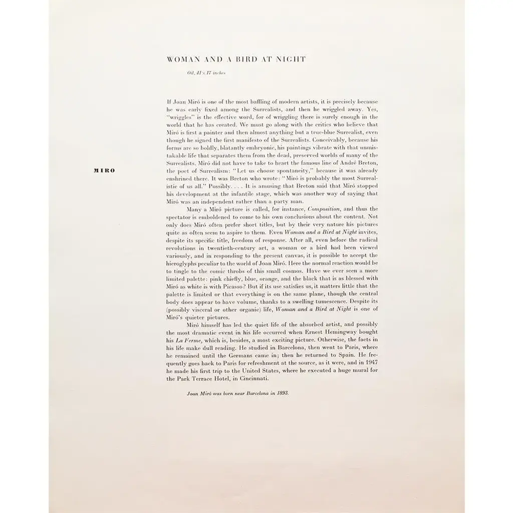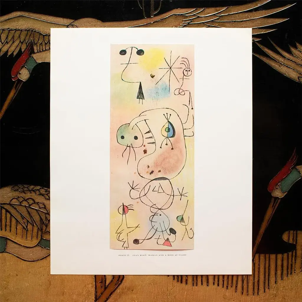 A rare period vintage full-color print of Abstract painting "Woman and a Bird at Night" by Joan Miro from a First Edition art folio of The Albert D. Lasker Collection. Printed in Switzerland in the 1950s, probably by Albert Skira. Printed on one side. Hand tipped-in on a board of heavy paper. Copy below the image and on the back of the board. Excellent condition - minor edge wear on the board, never framed. Overall 11"W x 14"H Image 4.60"W x 11.60"H