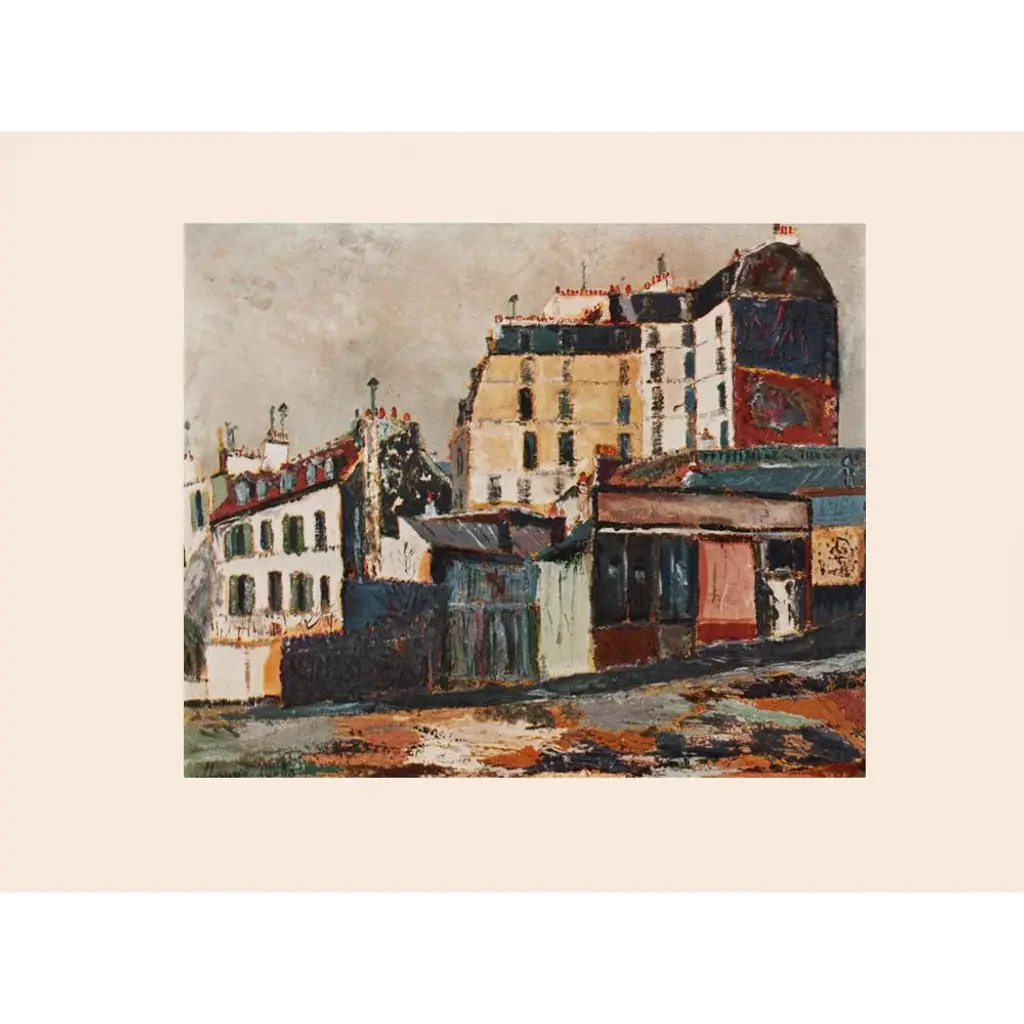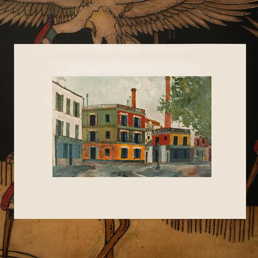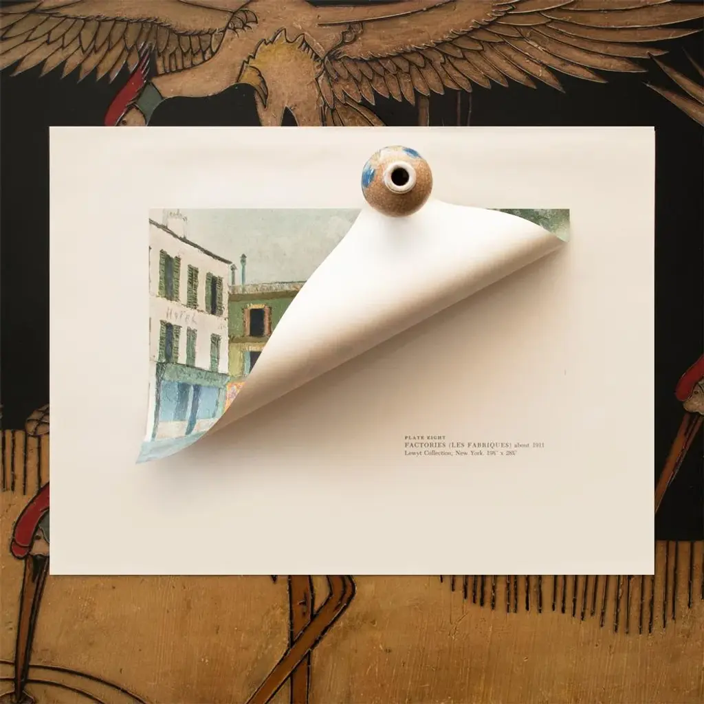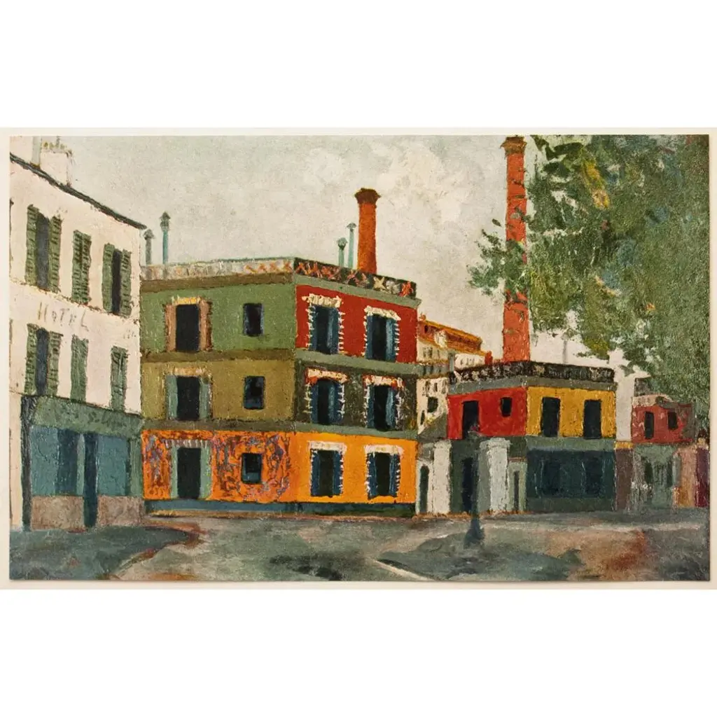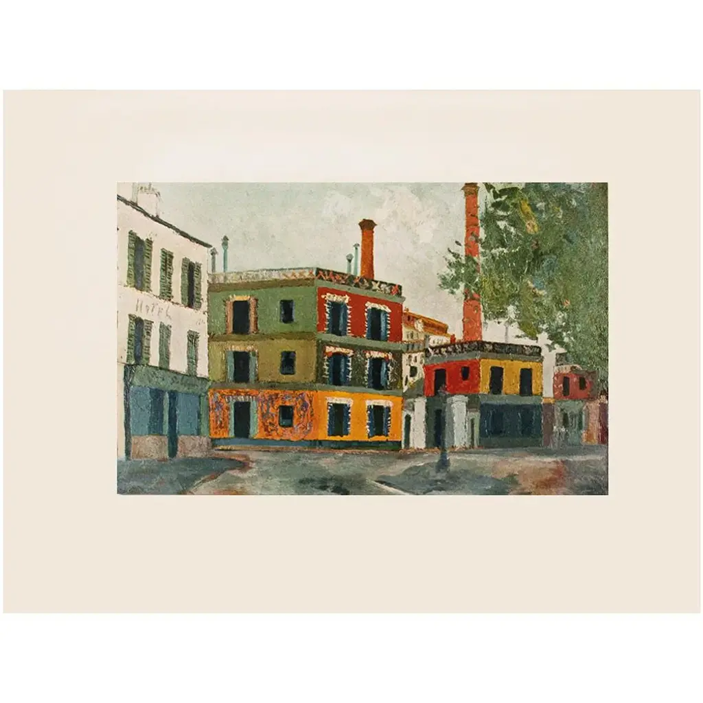 An excellent vintage period Industrial Style First Edition full-color print of painting "Factories" (circa 1911), by French artist Maurice Utrillo (1883-1955). Comes from a First Limited Edition art folio published in the early 1950s. Printed on one side. Hand tipped on a board of heavy paper. Information regarding the original artwork will be found by lifting the plate. Very detailed. Colors are vivid and deep. Excellent condition - never framed. Overall 14.75"W x 10.75"H Image 10.15"W x 6.5"H