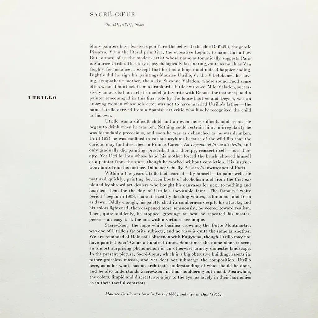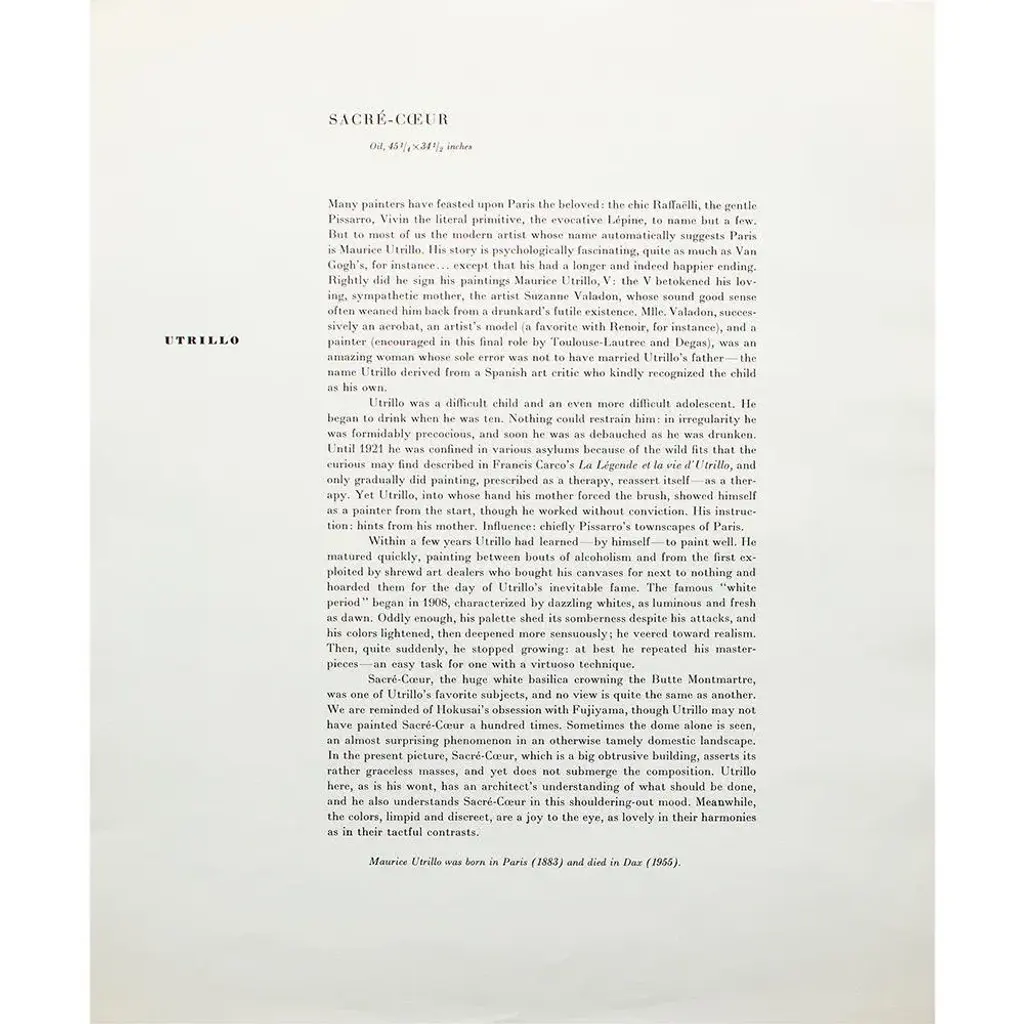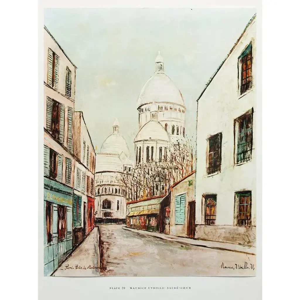 A rare vintage full-color print of Impressionist painting "Sacre-Ceur" by Maurice Utrillo from a First Edition art folio of The Albert D. Lasker Collection. Printed in Switzerland in the 1950s, probably by Albert Skira. Printed on one side. Hand tipped-in on a board of heavy paper. Copy below the image and on the back of the board. Excellent condition - minor edge wear on the board, never framed. Overall 11"W x 14"H Image 7.95"W x 10.26"H