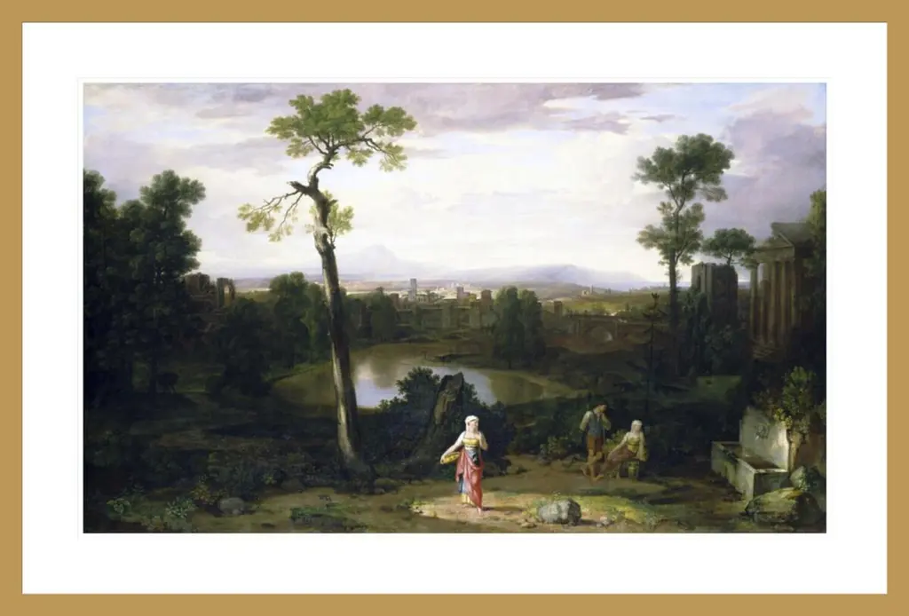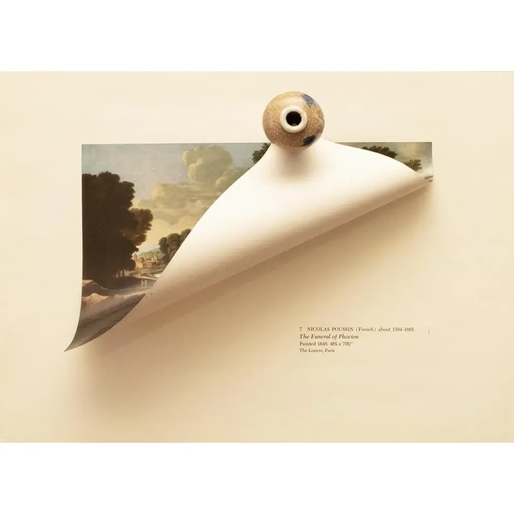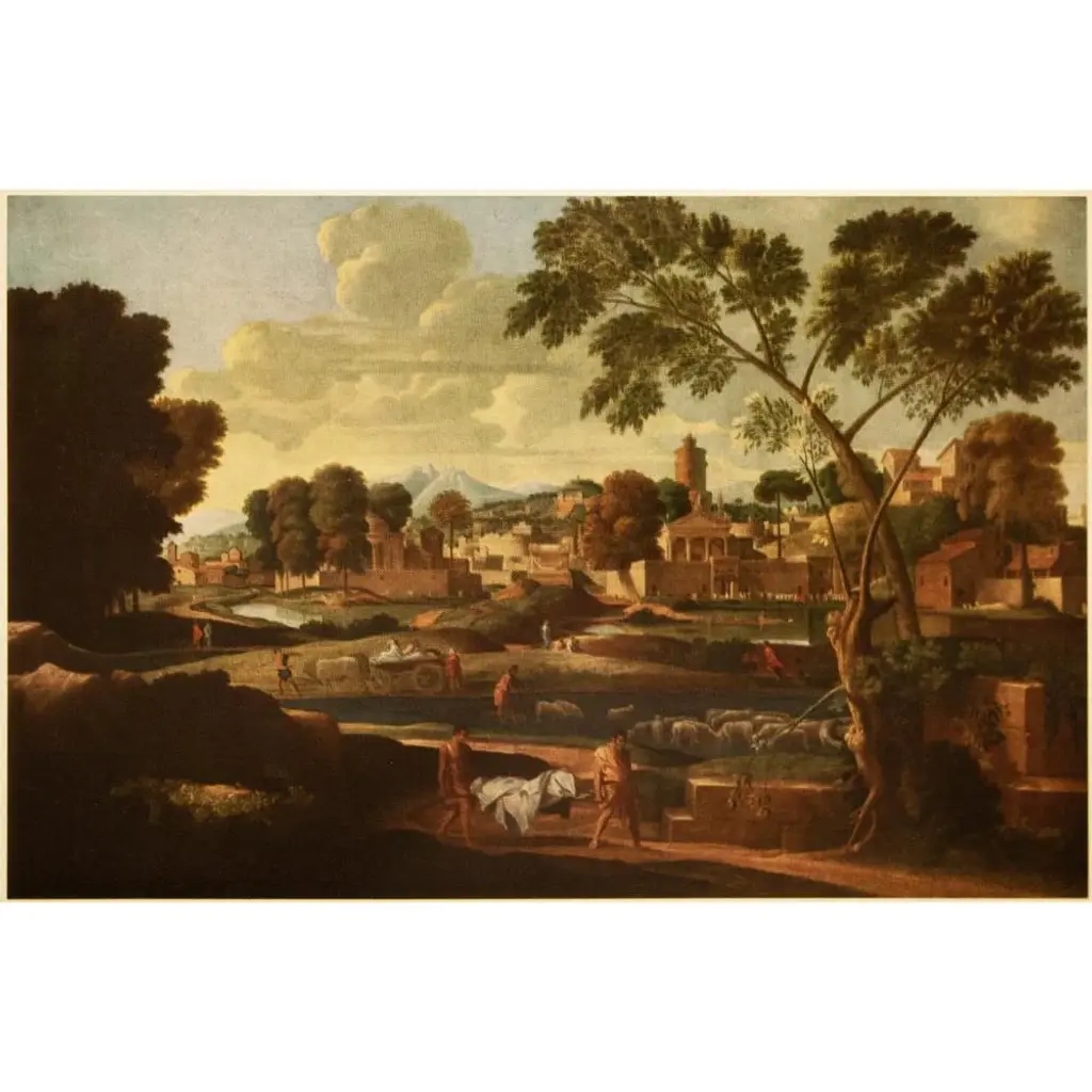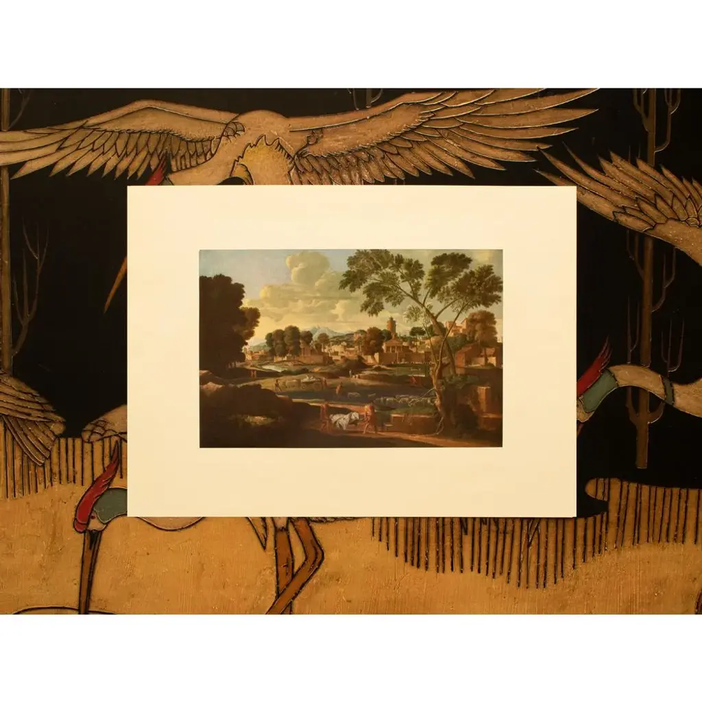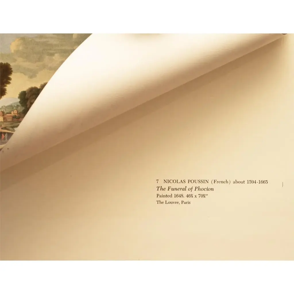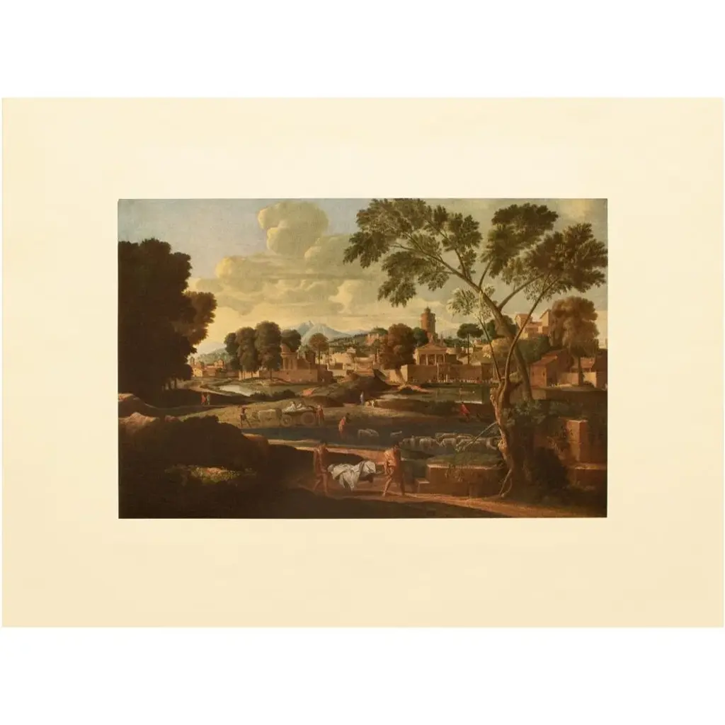A stunning vintage First Edition photogravure print after oil painting "Evening Landscape", also known as "The Funeral of Phocion" by Nicholas Poussin. Comes from a First Limited Edition art folio published in the 1950s. Printed on one side. Hand tipped-in on a board of heavy paper. Information regarding the original artwork will be found by lifting the plate. Very detailed. Beautiful deep and vivid colors. Excellent condition - minor edge wear on the board, never framed. Overall 14.75"W x 10.75"H Image 9.9"W x 6.5"H