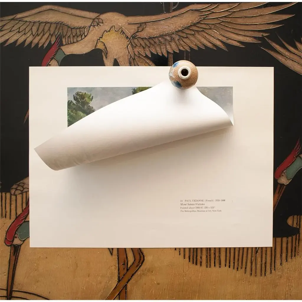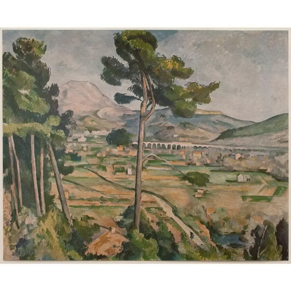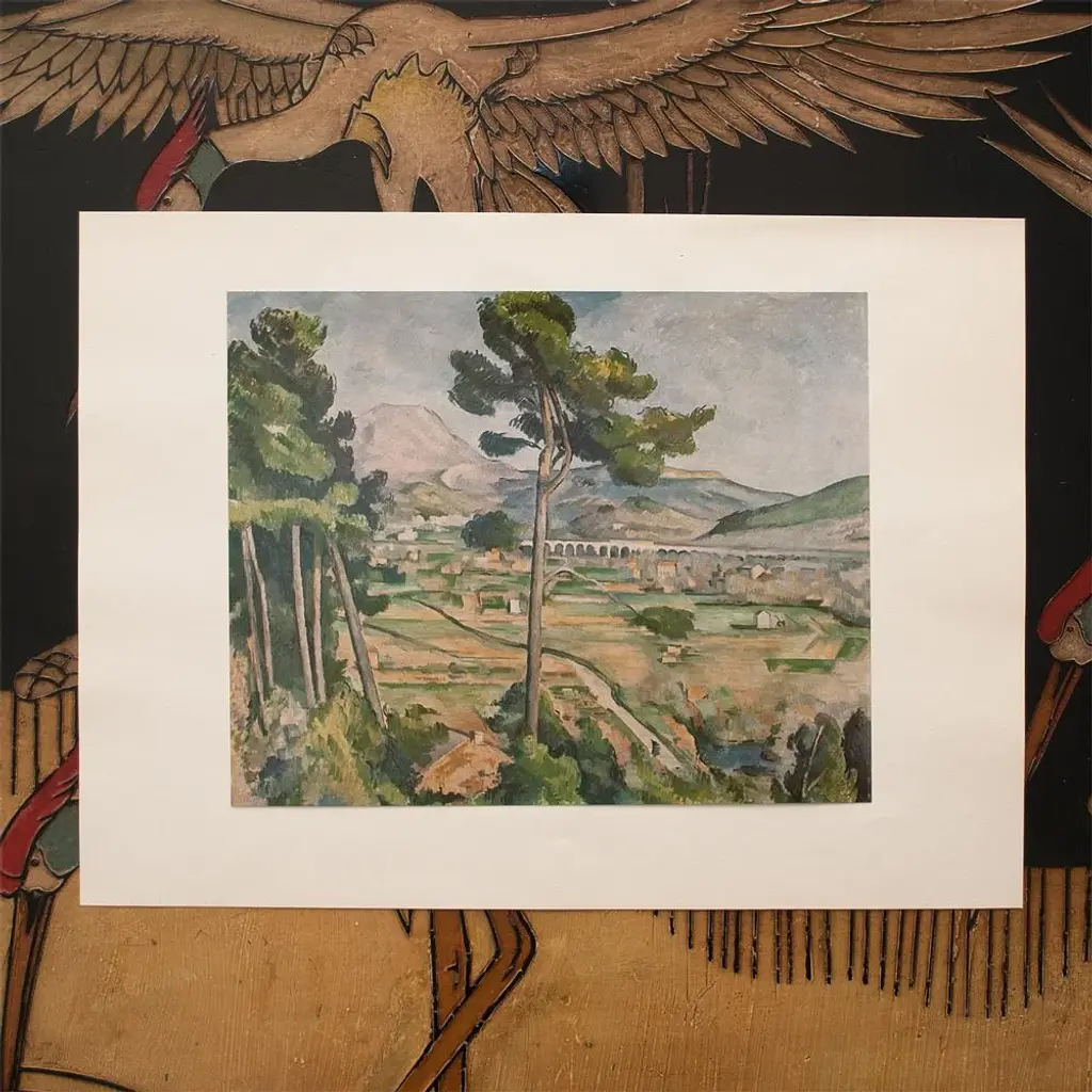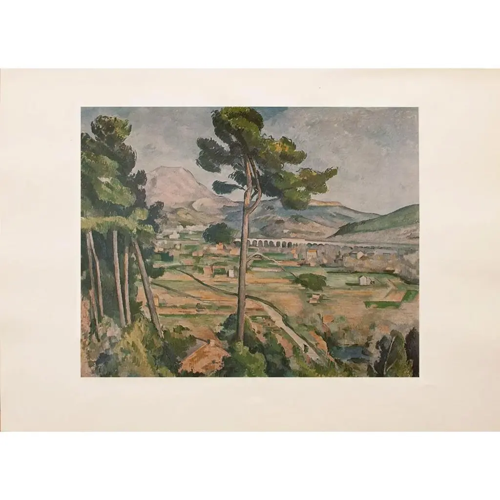 An excellent vintage full-color print of Impressionist painting "Mont Sainte-Victoire" by Paul Cezanne. Comes from a rare First Limited Edition art folio published in the 1950s. Printed on one side. Hand tipped-in on a board of heavy paper. Information regarding the original artworkwill be found by lifting the piece. Excellent condition - minor edge wear on the board, never framed. Overall 14.75"W x 10.75"H Image 10"W x 8"H