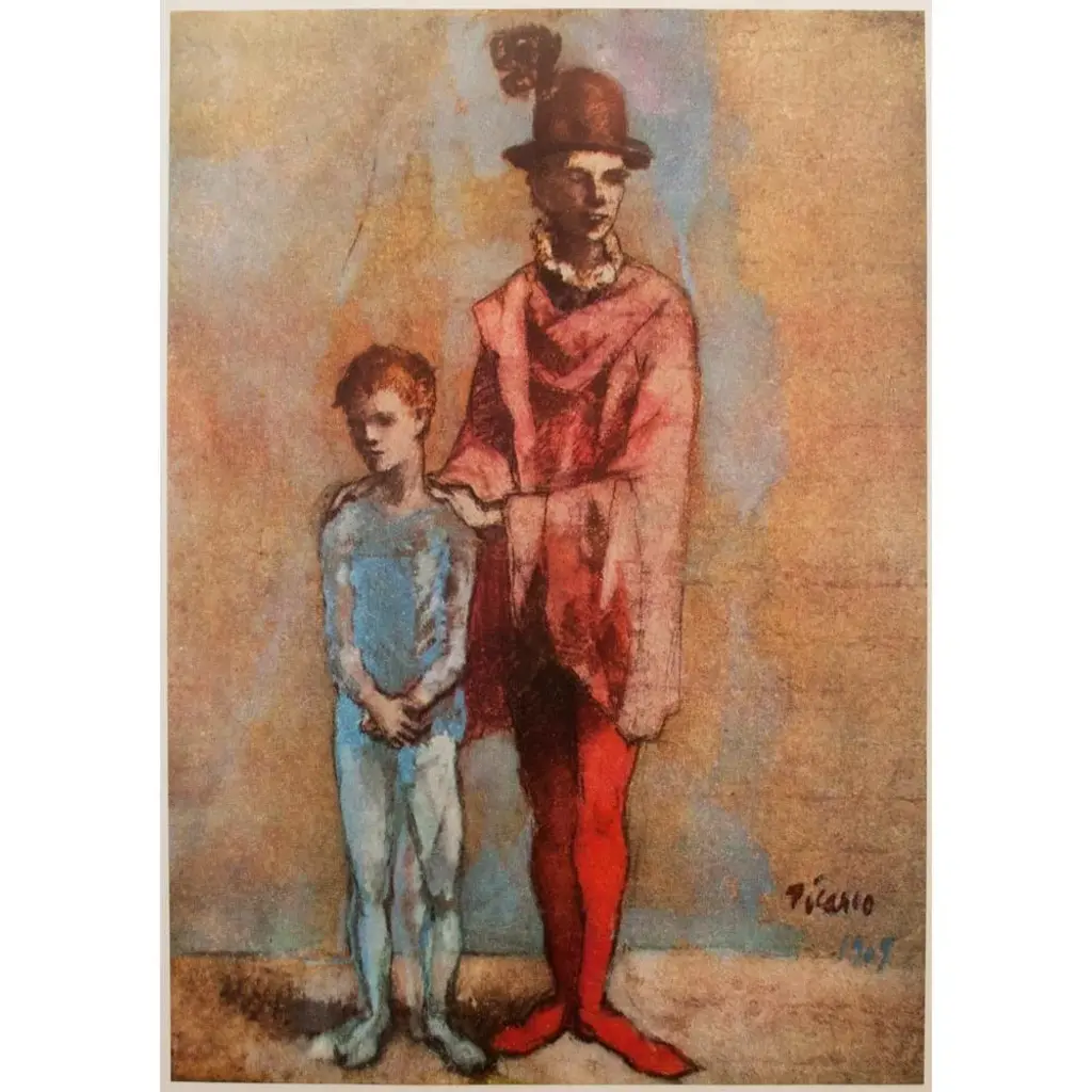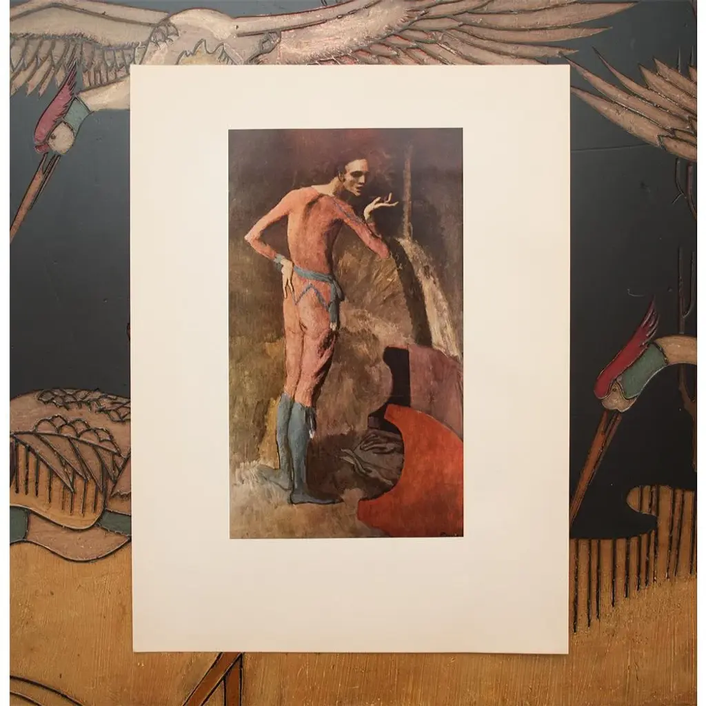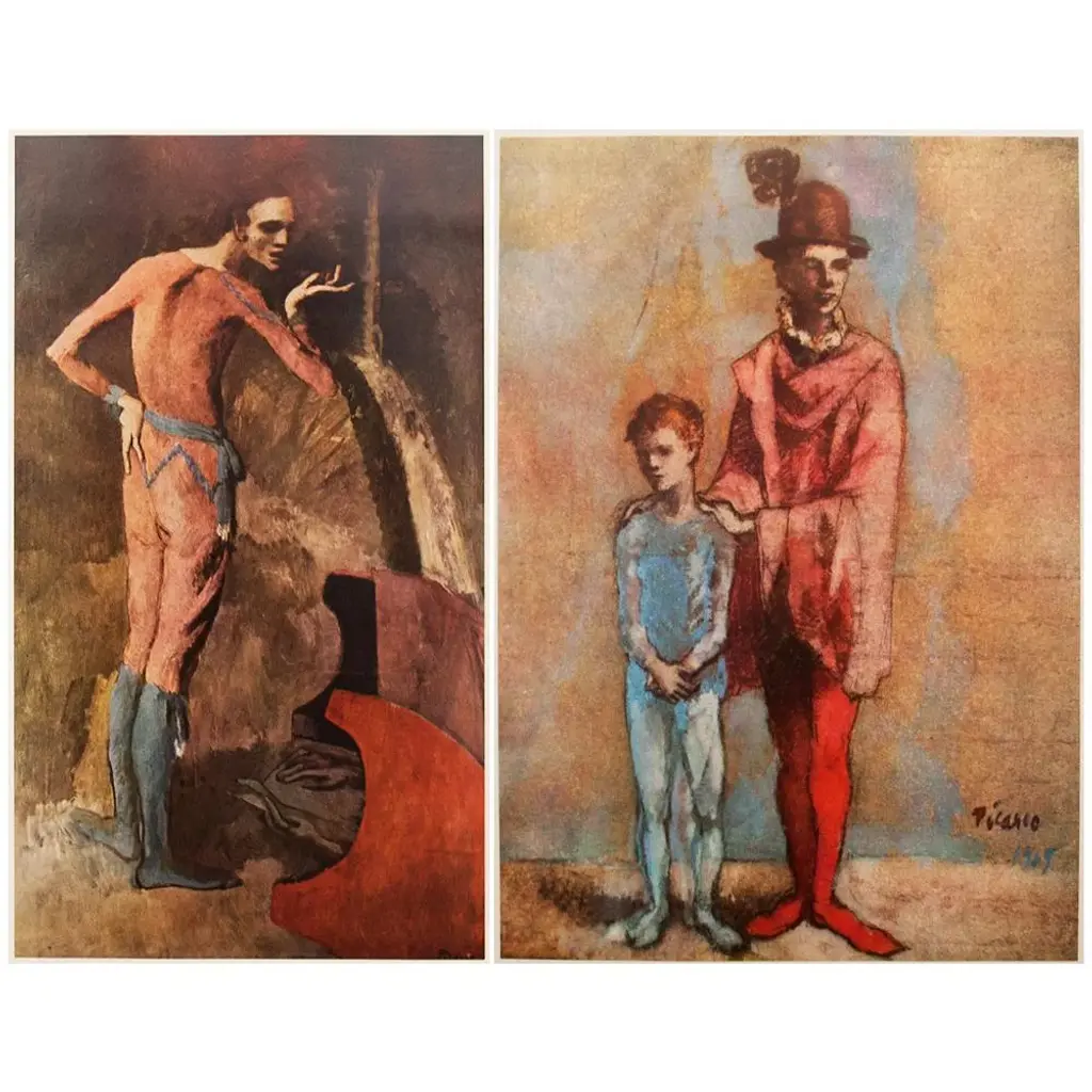 A set of two beautiful period full-color prints of oil painting The Actor (1904-1905) and pastel Two Saltimbanques (1901) by Pablo Picasso from the a first limited edition art folio from the 1950s. Printed on one side. Hand tipped-in on boards of heavy paper. Information regarding the original paintings will be found by lifting the pieces. Excellent condition - minor edge wear on the boards, never framed. Each piece overall is 11"W x 14.75"H The Actor Image 5.85" x 10.25"H Two Saltimbanques Image 7.20" x 10.25"H