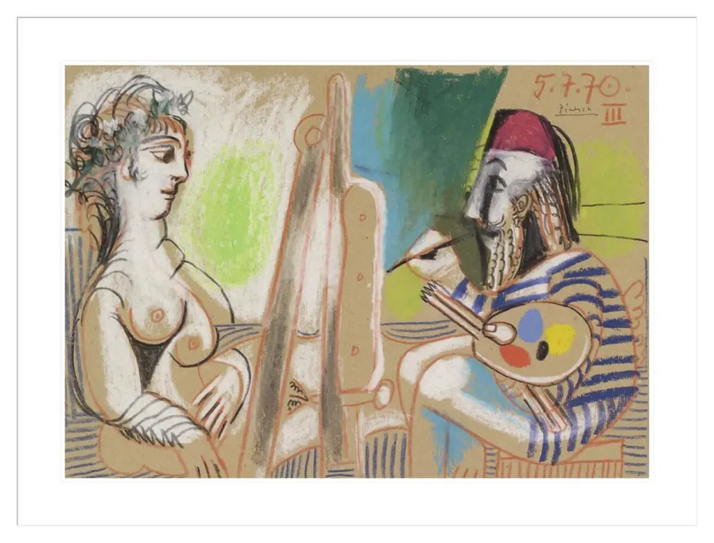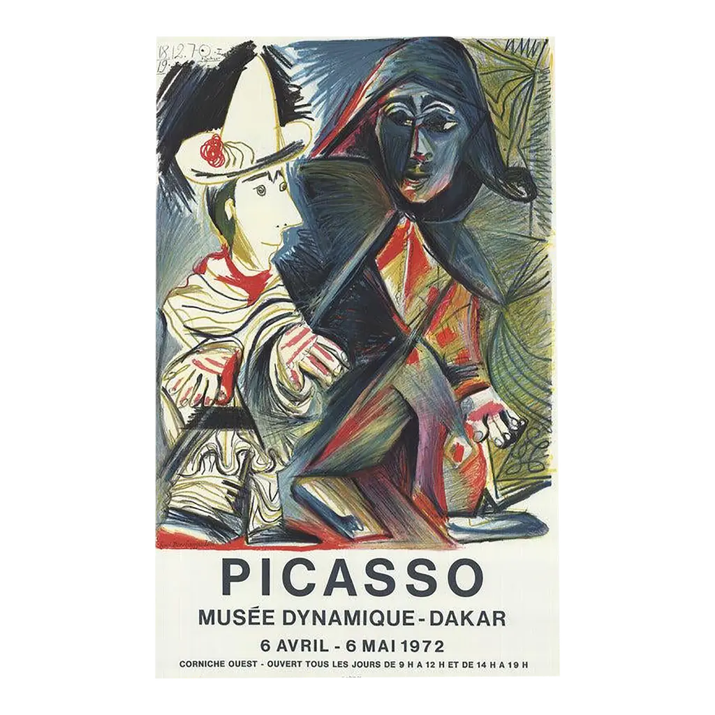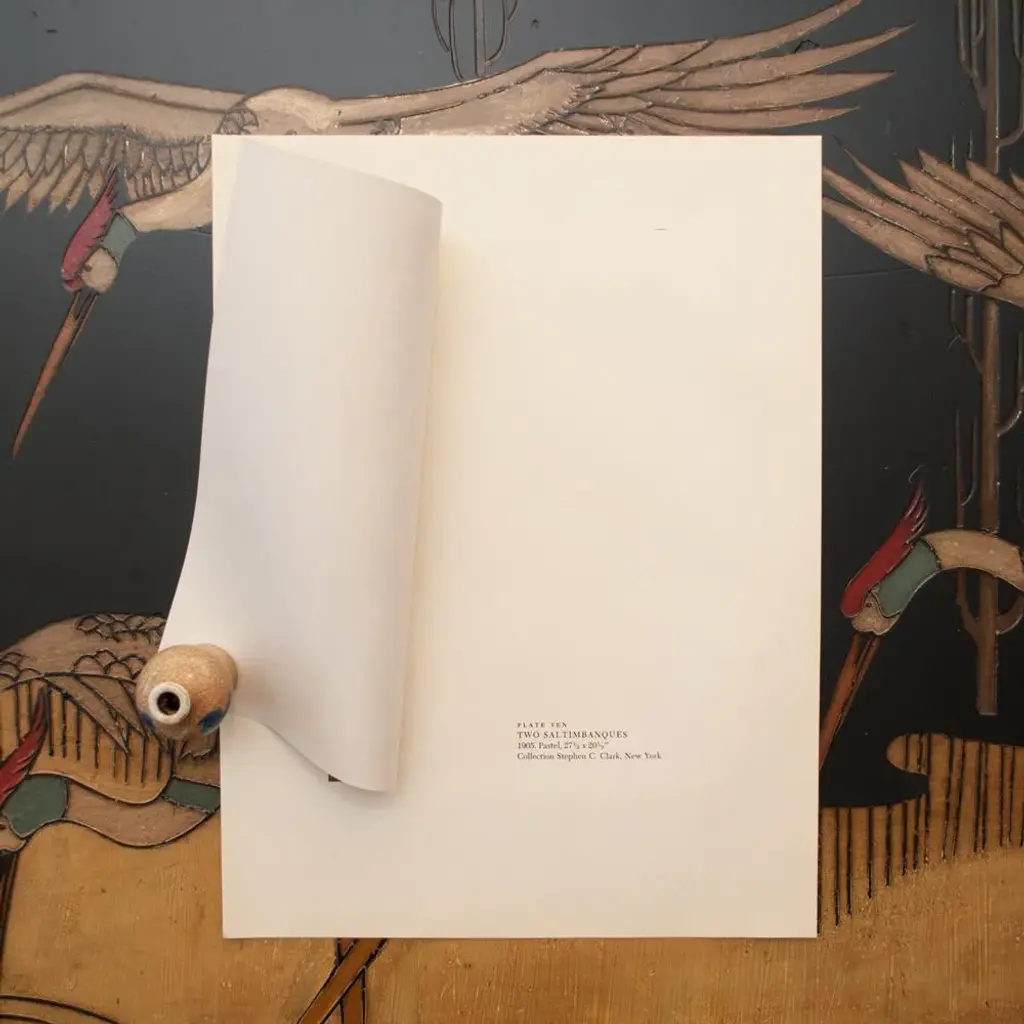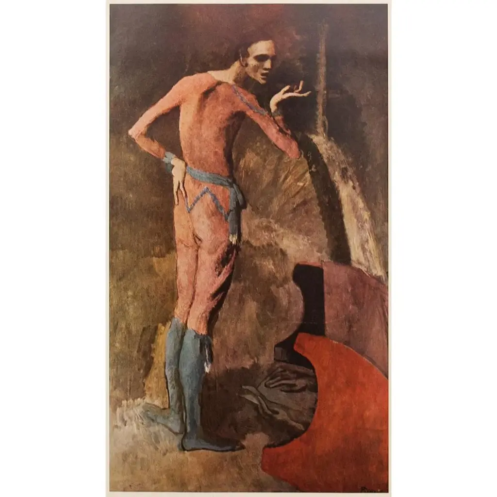 A set of two beautiful period full-color prints of oil painting The Actor (1904-1905) and pastel Two Saltimbanques (1901) by Pablo Picasso from the a first limited edition art folio from the 1950s. Printed on one side. Hand tipped-in on boards of heavy paper. Information regarding the original paintings will be found by lifting the pieces. Excellent condition - minor edge wear on the boards, never framed. Each piece overall is 11"W x 14.75"H The Actor Image 5.85" x 10.25"H Two Saltimbanques Image 7.20" x 10.25"H