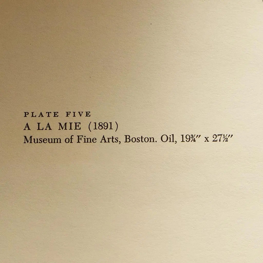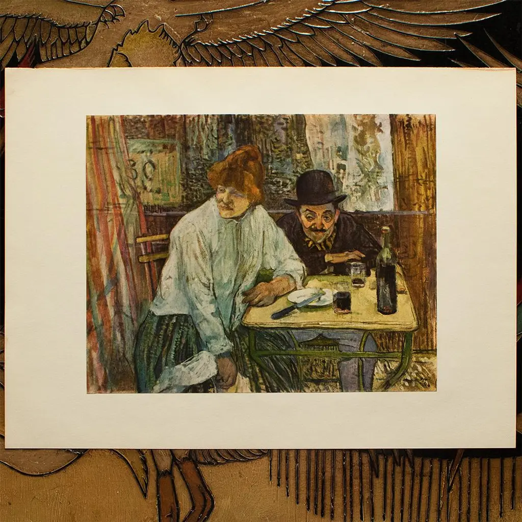 An excellent vintage full color Impressionist print after oil painting "At the Café La Mie" by Toulouse-Lautrec. Comes from a rare First Limited edition folio of the artist published in the 1950s. Printed on one side. Hand tipped-in on a board of heavy paper. Information regarding the original artwork will be found by lifting the piece. Excellent condition - never framed. Overall 14.7" W x 10.9" H Image 10" W x 7.9" H