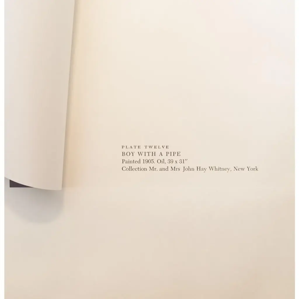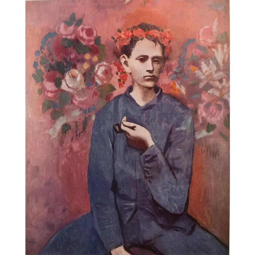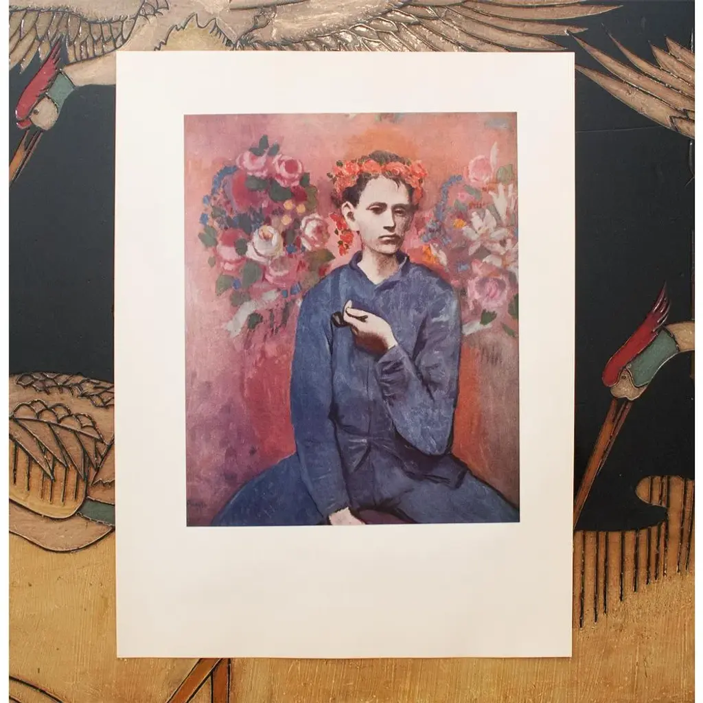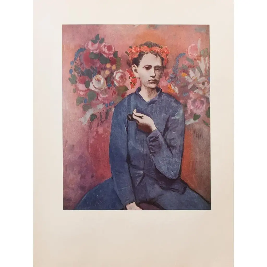 A gorgeous original period offset lithograph, full-color print, after oil painting Boy with a Pipe (1905) by Pablo Picasso from limited edition of XVI prints from Picasso's Blue and Rose periods portfolio, created while the great artist was still living, published in the mid of 20th c. Signed in the plate in the lower left corner: "Picasso". The title, size, and other information on the original painting will be found by lifting the piece. Printed on 1 side. First American Edition. Excellent condition - never used. 11"W x 14.75"H overall 8" x 10" H image only Picasso was briefly interested in sculpture and, after a short trip to Holland during the summer, his painting became more objective. Even in the Boy with a Pipe, so closely related to the pictures of the circus performers, Picasso's attitude seems more detached. the face is that of the taller boy in the painting reproduced on the lithograph Two Saltimbanques with a Dog (which is also offered for sale at our Print Shop on Chairish), but Picasso's interest is formal rather than narrative, and the backdrop of painted flowers throws the figure into bold relief. Boy with a Pipe is one of the first paintings of the Rose period.