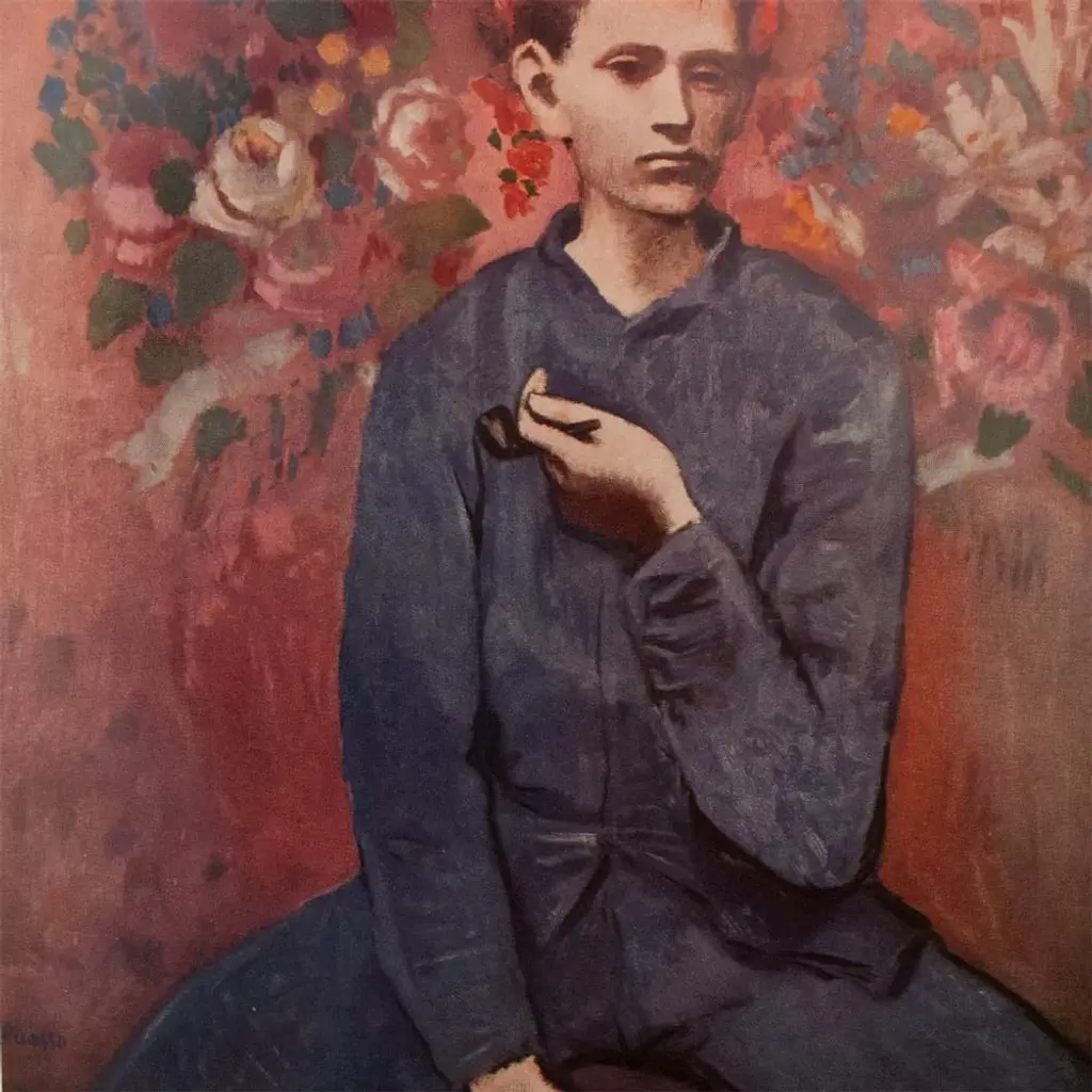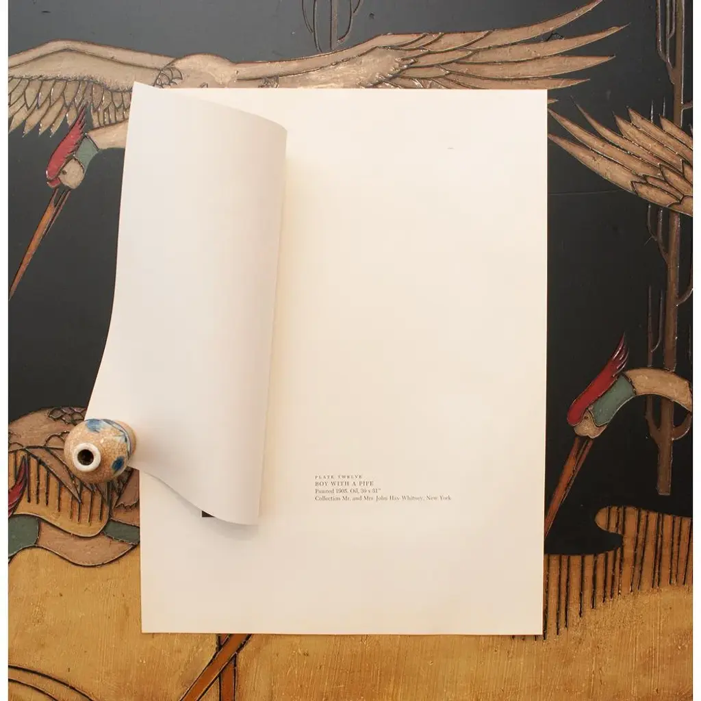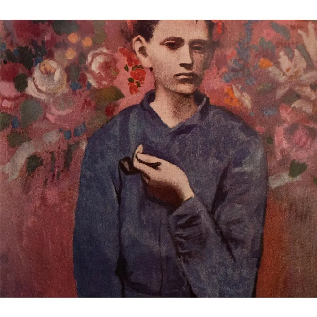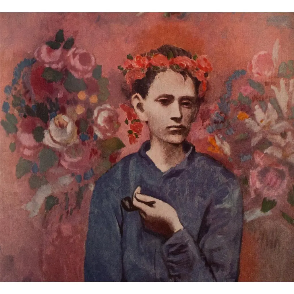 A gorgeous original period offset lithograph, full-color print, after oil painting Boy with a Pipe (1905) by Pablo Picasso from limited edition of XVI prints from Picasso's Blue and Rose periods portfolio, created while the great artist was still living, published in the mid of 20th c. Signed in the plate in the lower left corner: "Picasso". The title, size, and other information on the original painting will be found by lifting the piece. Printed on 1 side. First American Edition. Excellent condition - never used. 11"W x 14.75"H overall 8" x 10" H image only Picasso was briefly interested in sculpture and, after a short trip to Holland during the summer, his painting became more objective. Even in the Boy with a Pipe, so closely related to the pictures of the circus performers, Picasso's attitude seems more detached. the face is that of the taller boy in the painting reproduced on the lithograph Two Saltimbanques with a Dog (which is also offered for sale at our Print Shop on Chairish), but Picasso's interest is formal rather than narrative, and the backdrop of painted flowers throws the figure into bold relief. Boy with a Pipe is one of the first paintings of the Rose period.