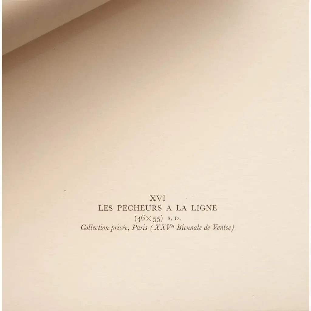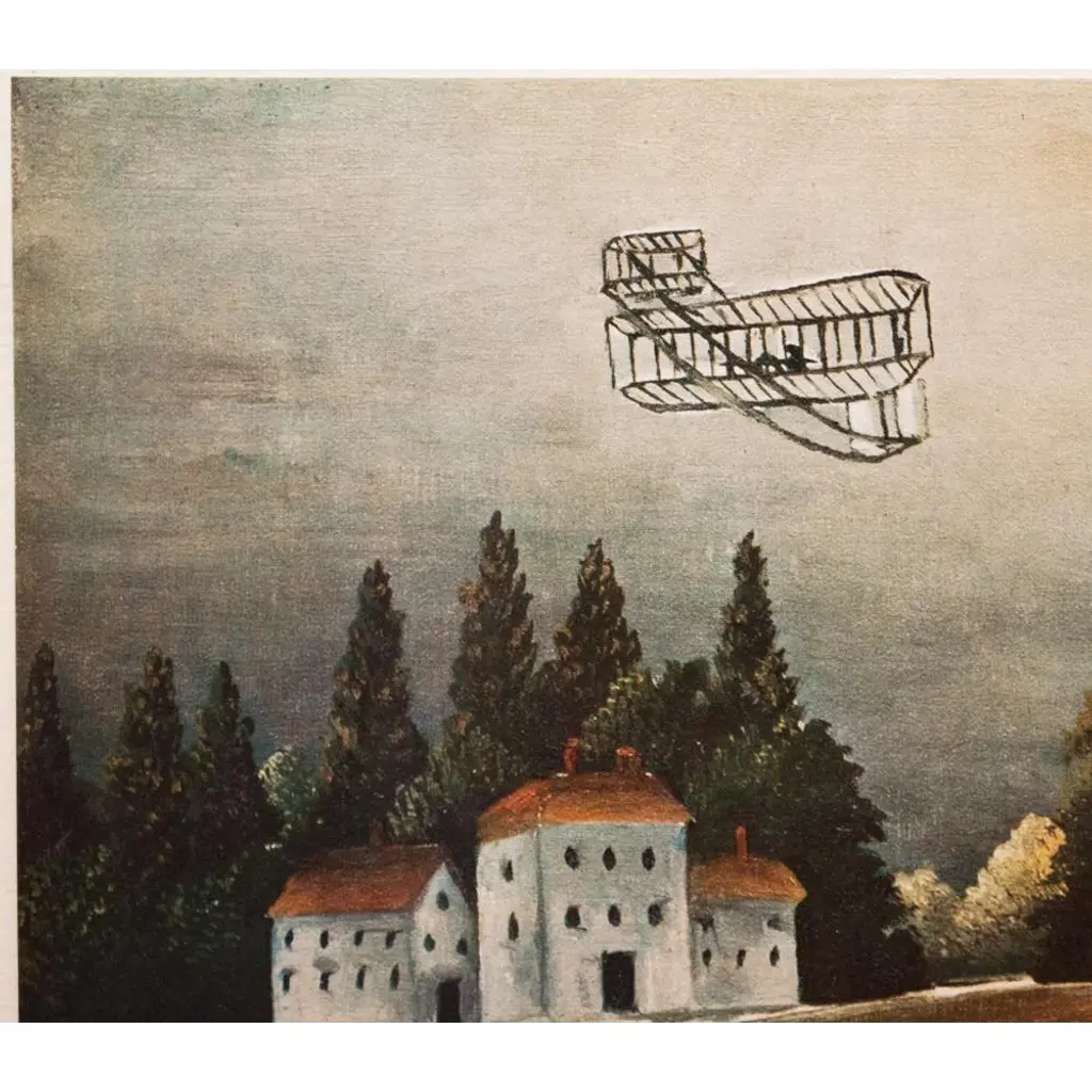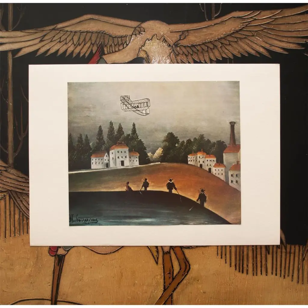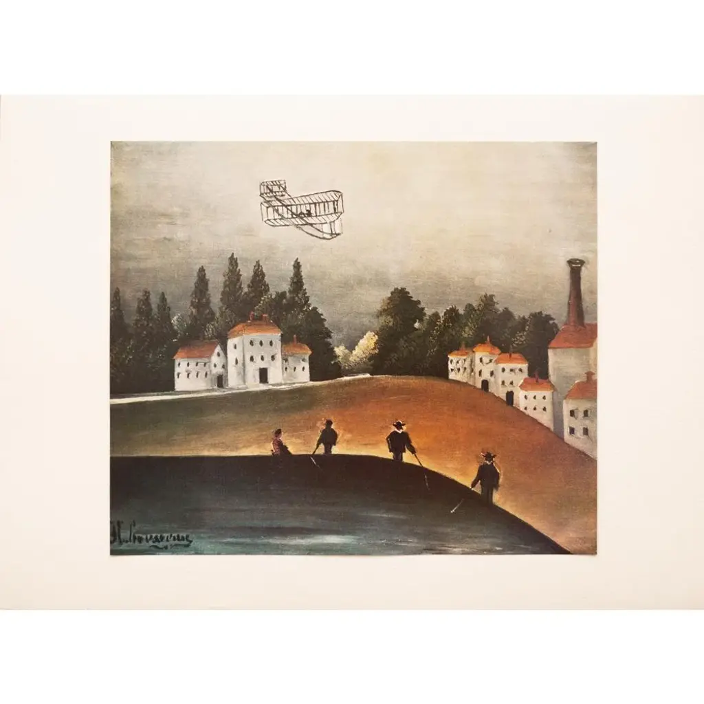 A lovely vintage First Edition full-color print of painting "Les Pecheurs a La Ligne" (Landscape and Four Fishermen, 1905 ), by Henri Rousseau from limited edition portfolio, published by Les Editions Du Chene in Paris, France in 1951. Signed in the print. Hand tipped-in on a board of heavy paper. Numbered. Information regarding the original artwork will be found by lifting the piece. Superb quality of printing and materials. Excellent condition - never framed. Overall 14.75"W x 10.75"H Image 10.25"W x 8.5"H Rousseau liked to depict ordinary people at leisure. Here, the aeroplane flying overhead introduces a modern touch into the composition, as does the factory chimney in the background. Rousseau depicted airships and aeroplanes several times in his work, which made him a pioneer in representing modernity. This theme would be widely taken up by the painter Robert Delaunay (1885-1941), who greatly admired Rousseau’s work. The conquest of the skies, the great challenge of the era, was the top story in the press. The aeroplane is perfectly recognisable: it is the biplane of Wilbur Wright (1867-1912), the American pioneer who, with his brother, Orville Wright (1871-1948) organised public flights from Le Mans in 1908, and whose image was circulated in Le Petit Journal illustré de la jeunesse on 27 December 1908 and in the Petit Journal on 5 September 1909. The beach, or strip of ochre coloured earth, separates the fishermen’s space from the houses. It slopes down on the right of the painting, which means that the houses, depicted frontally, sit oddly in the space as their base follows the curve of the ground. Similarly, the fishermen, whose feet are cropped, seem to be placed on the water, or rather, stuck on to the strip of land. Provenance: Ambroise Vollard, Paris; Paul Guillaume (1931); Domenica Walter On the subject of the editor: Les Editions du Chêne, Paris 1941, it is an occupied Paris which witnesses the emergence, 16, place Vendôme, of the Editions du Chêne. A risky bet given that its 21-year old founder was called Maurice Kahane, an atheist Jewish man who would then adopt the name of his mother, Girodias. The Chêne specialized itself by the edition of art books and literature. The Editions du Chêne would become a branch of the Hachette group in 1951. The edition of art books would then adopt pride of place. George Herscher takes over the Hachette house with enthusiasm in 1971.