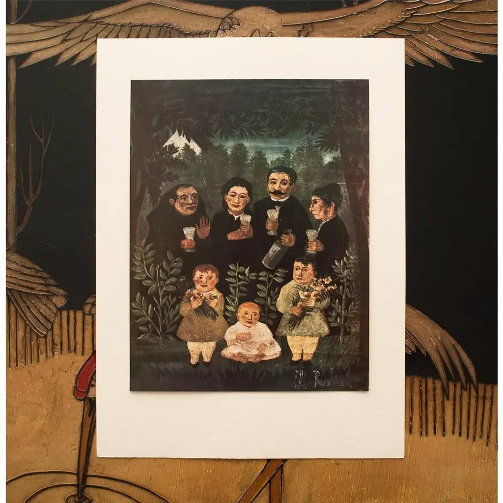 A rare excellent vintage First Edition full-color print of painting "La Famille" (The Family, 1896), by Henri Rousseau. Comes from a rare First Limited Edition art folio of the artist, published by Les Editions Du Chene in Paris, France in 1951. Printed on one side. Hand tipped-in on a board of heavy paper. Numbered. Information regarding the original painting will be found by lifting the piece. Excellent condition - minor age wear on the the board, never framed. Overall 10.75"W x 14.75"H Image 8.25"W x 11"H On the subject of the editor: Les Editions du Chêne, Paris 1941, it is an occupied Paris which witnesses the emergence, 16, place Vendôme, of the Editions du Chêne. A risky bet given that its 21-year old founder was called Maurice Kahane, an atheist Jewish man who would then adopt the name of his mother, Girodias. The Chêne specialized itself by the edition of art books and literature. The Editions du Chêne would become a branch of the Hachette group in 1951. The edition of art books would then adopt pride of place. George Herscher takes over the Hachette house with enthusiasm in 1971.