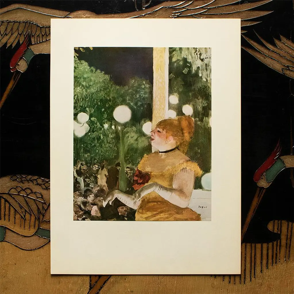 An excellent vintage print after gouache and pastel painting "Cafe-Concert: The Song of the Dog" (1834-1917) by Edgar Degas. Comes from a First Limited Edition art folio published in 1952. Signed in the print. Printed on one side. Hand tipped-in on a board of heavy paper. Information regarding the original artwork will be found by lifting the piece. Detailed. Beautiful colors. Excellent condition - minor edge wear on the board, never framed. Overall 10.9"W x 14.75"H Image 7.95"W x 10"H