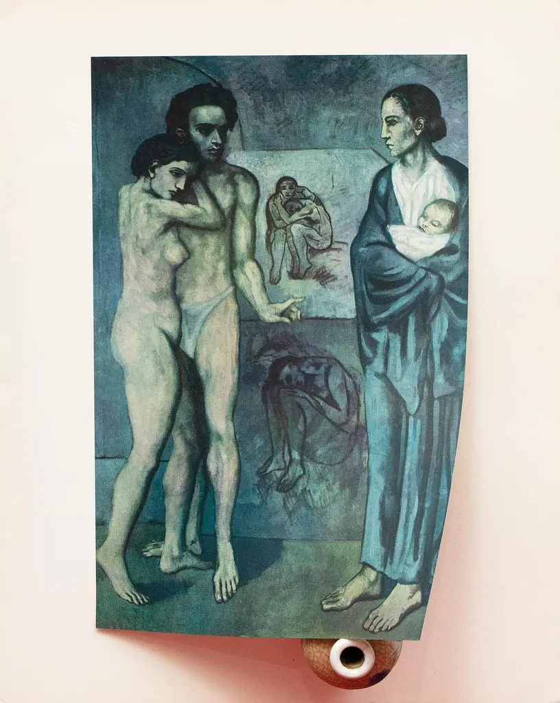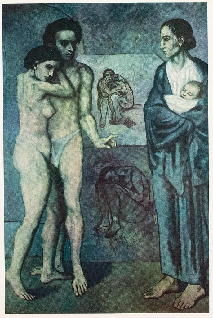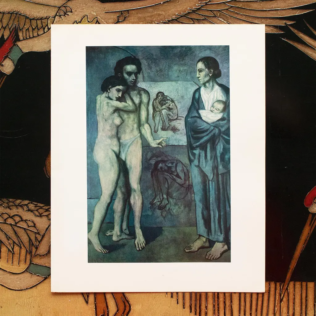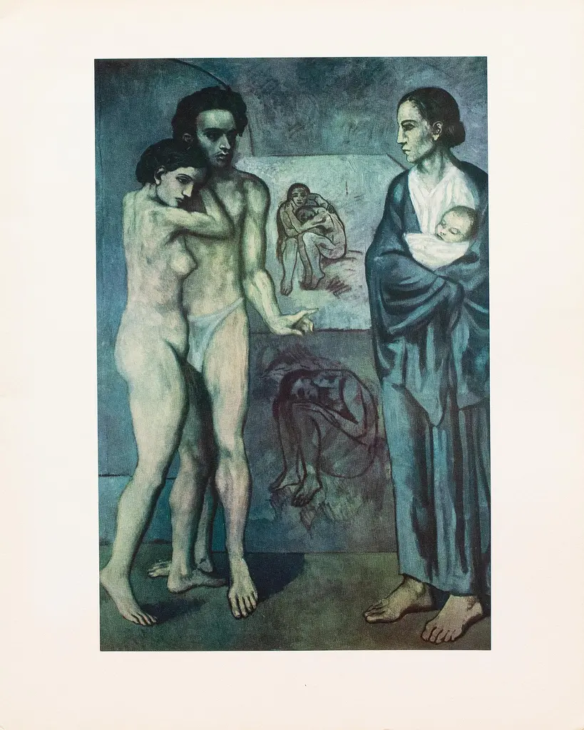 An excellent period reproduction full-color print after painting "La Vie (Life)" (1903) by Pablo Picasso. Comes from an art folio published and printed in the United States, in 1952. Printed on one side. Hand tipped-in on a board of heavy paper. Copy on back. Excellent condition - minor edge wear on the board, never framed. Overall 9.7"W x 12.55"H Image 6.45"W x 10.15"H