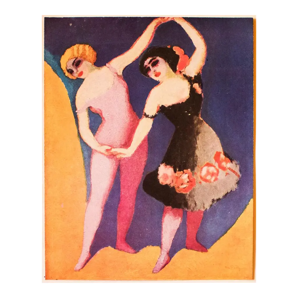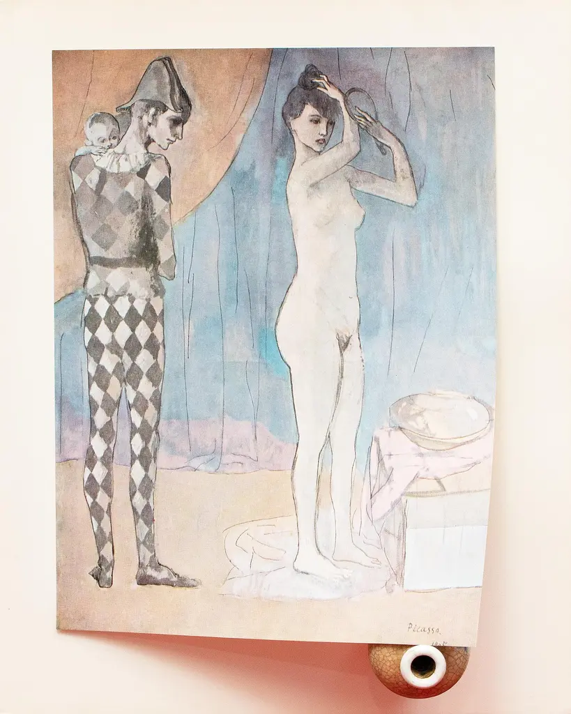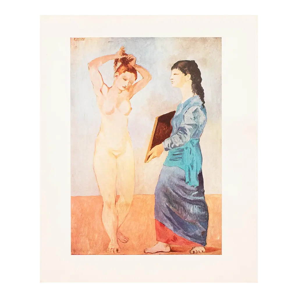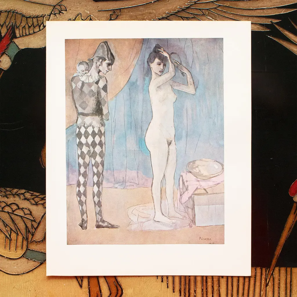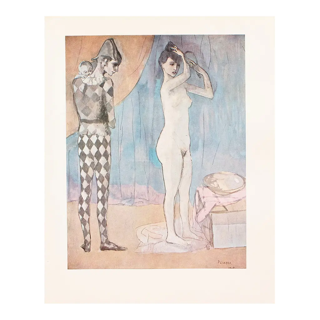 An excellent period reproduction full-color print after painting "The Harlequin's Family" (1905) by Pablo Picasso. Comes from an art folio published and printed in the United States, in 1952. Printed on one side. Hand tipped-in on a board of heavy paper. Copy on back. Excellent condition - minor edge wear on the board, never framed. Overall 9.7"W x 12.55"H Image 7.4"W x 10.15"H