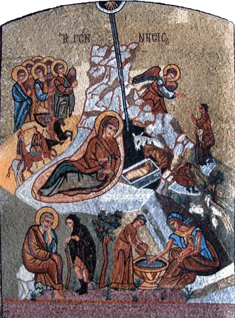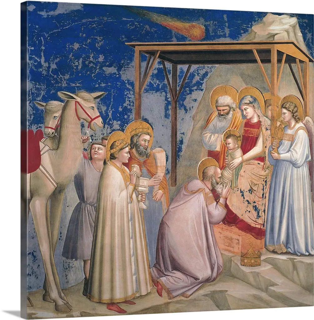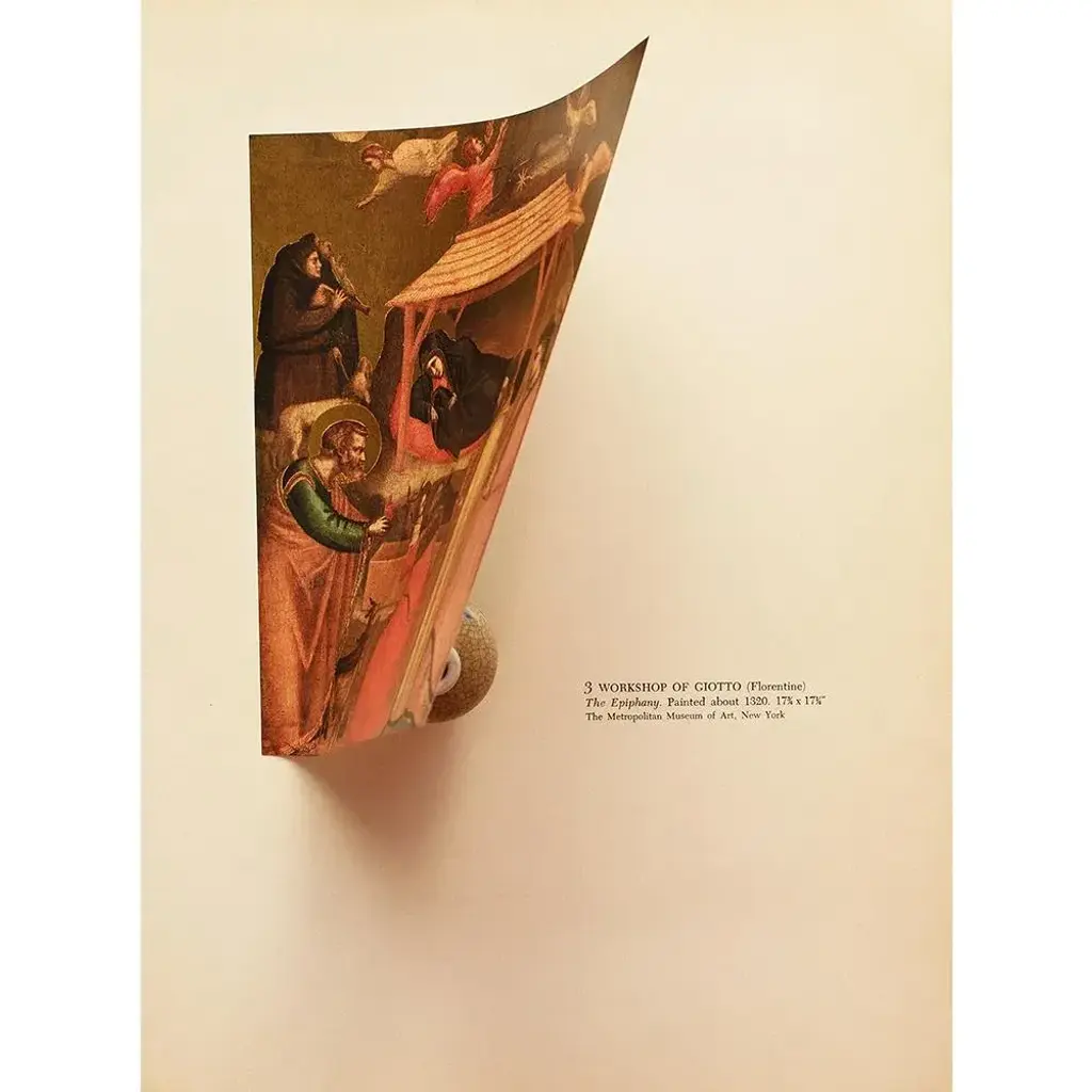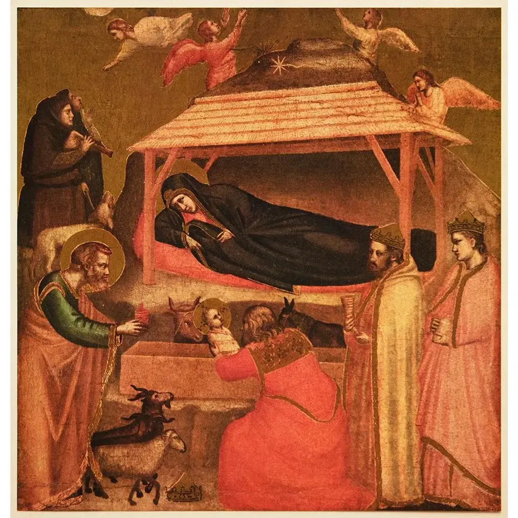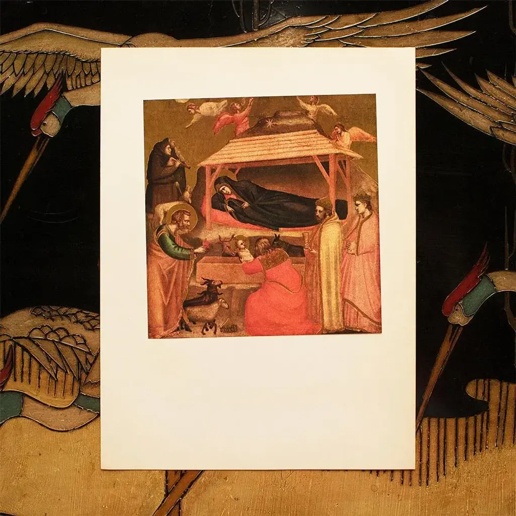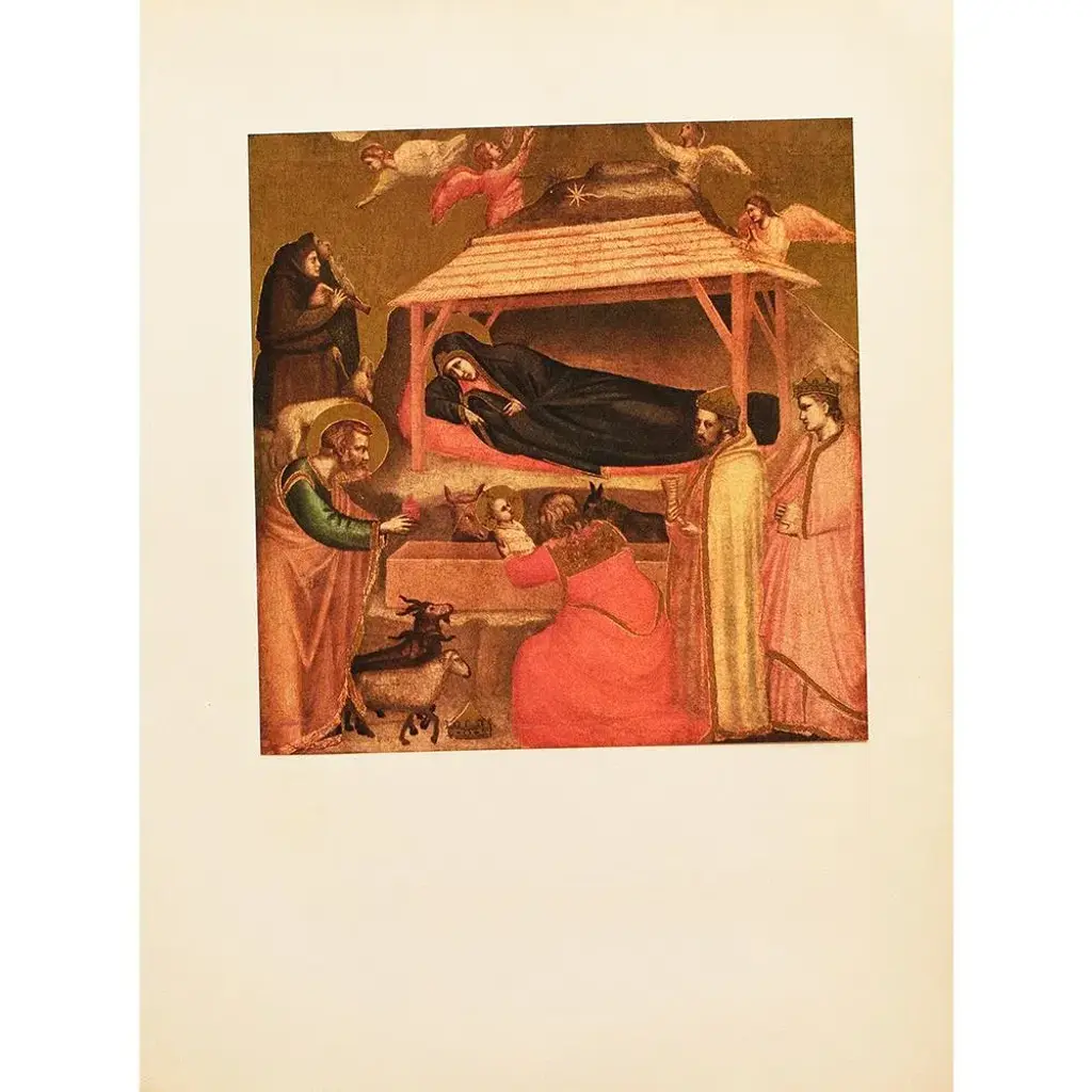 An excellent vintage gold printed full-color reproduction print after painting "The Epiphany" by Workshop of Giotto. Comes from a First Edition art folio printed in 1953. Printed on one side. Hand tipped-in on a board of heavy paper. Information regarding the original artwork will be found by lifting the piece. Excellent condition - minor edge wear on the board, never framed. Overall 10.75"W x 14.60"H Image 7.90"W x 8.25"H