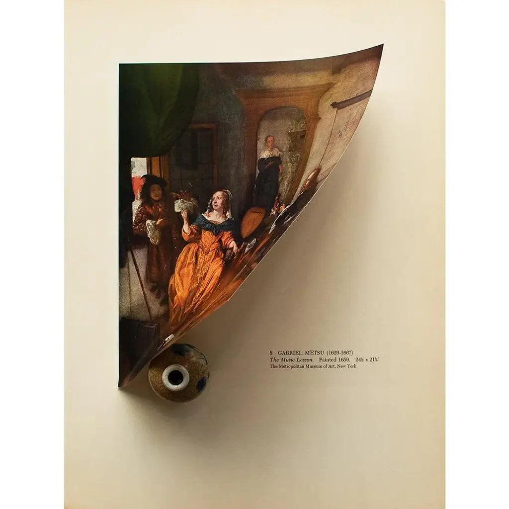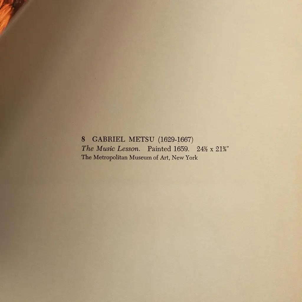 An excellent vintage full-color print after oil painting "The Music Lesson" by Gabriel Metsu. Comes from a First Edition art folio published in 1954. Printed on one side. Hand tipped-in on a board of heavy paper. Information regarding the original artwork will be found by lifting the piece. Detailed. Excellent condition - minor edge wear on the board, never framed. Overall 10.80"W x 14.75"H Image 8"W x 9.26"H