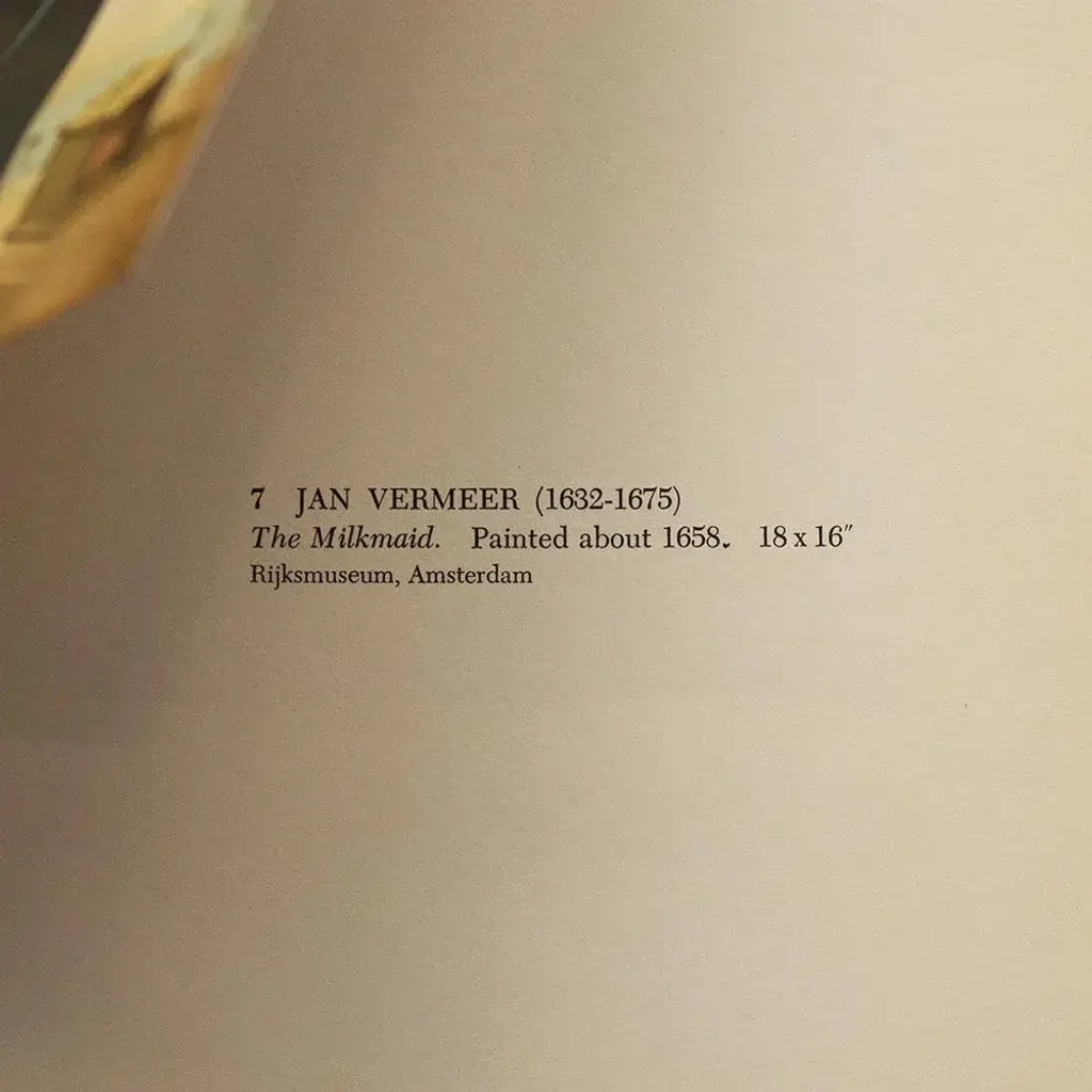 A beautiful vintage full-color print after oil painting "The Milkmaid" by Jan Vermeer. Comes from a First Edition art folio published in 1954. Printed on one side. Hand tipped-in on a board of heavy paper. Information regarding the original artwork will be found by lifting the piece. Detailed. Warm colors. Excellent condition - minor edge wear on the board, never framed. Overall 10.80"W x 14.75"H Image 8.30"W x 9.30"H