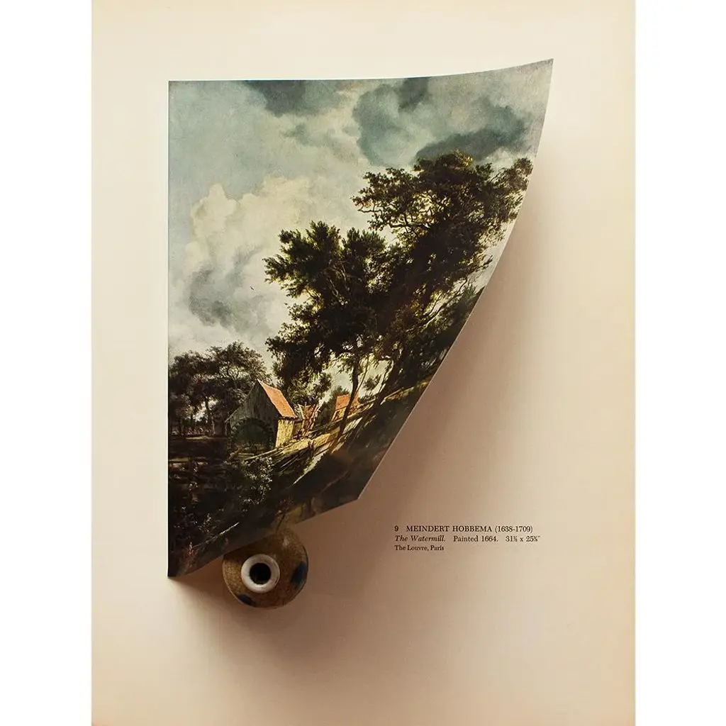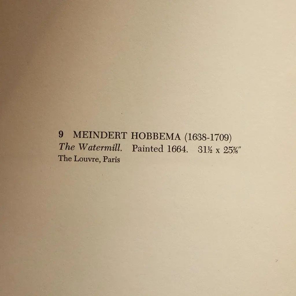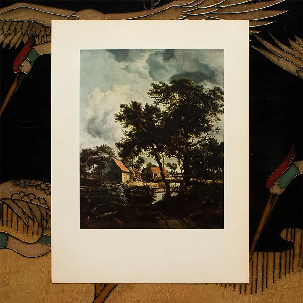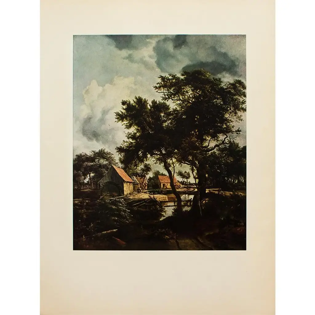An excellent vintage full-color print after oil painting "The Watermill" by Meindert Hobbema. Comes from a First Edition art folio published in 1954. Printed on one side. Hand tipped-in on a board of heavy paper. Information regarding the original artwork will be found by lifting the piece. Detailed. Excellent condition - minor edge wear on the board, never framed. Overall 10.80"W x 14.75"H Image 8"W x 10"H