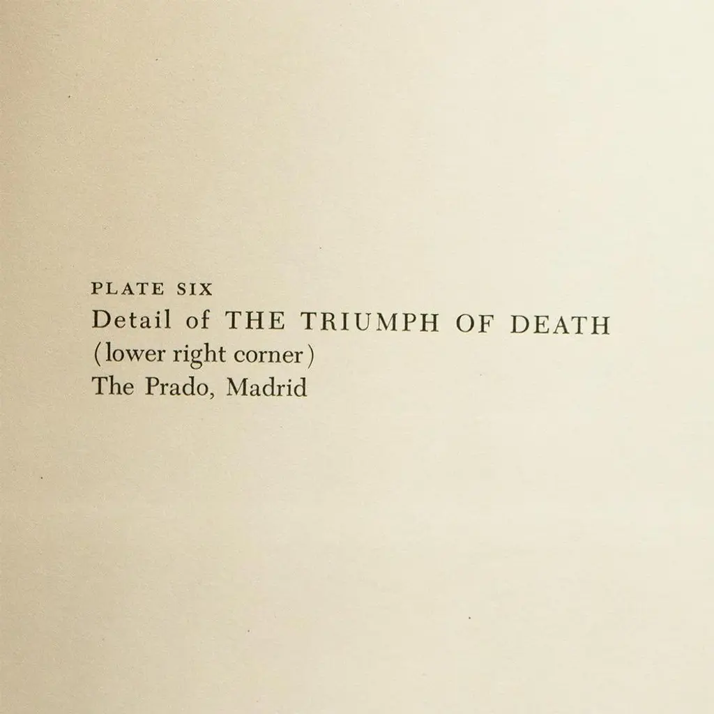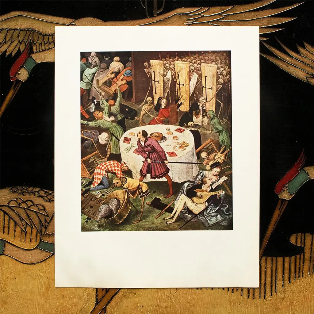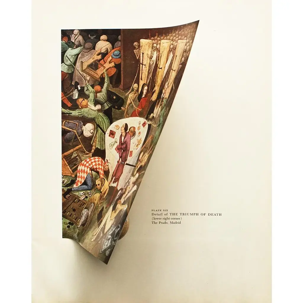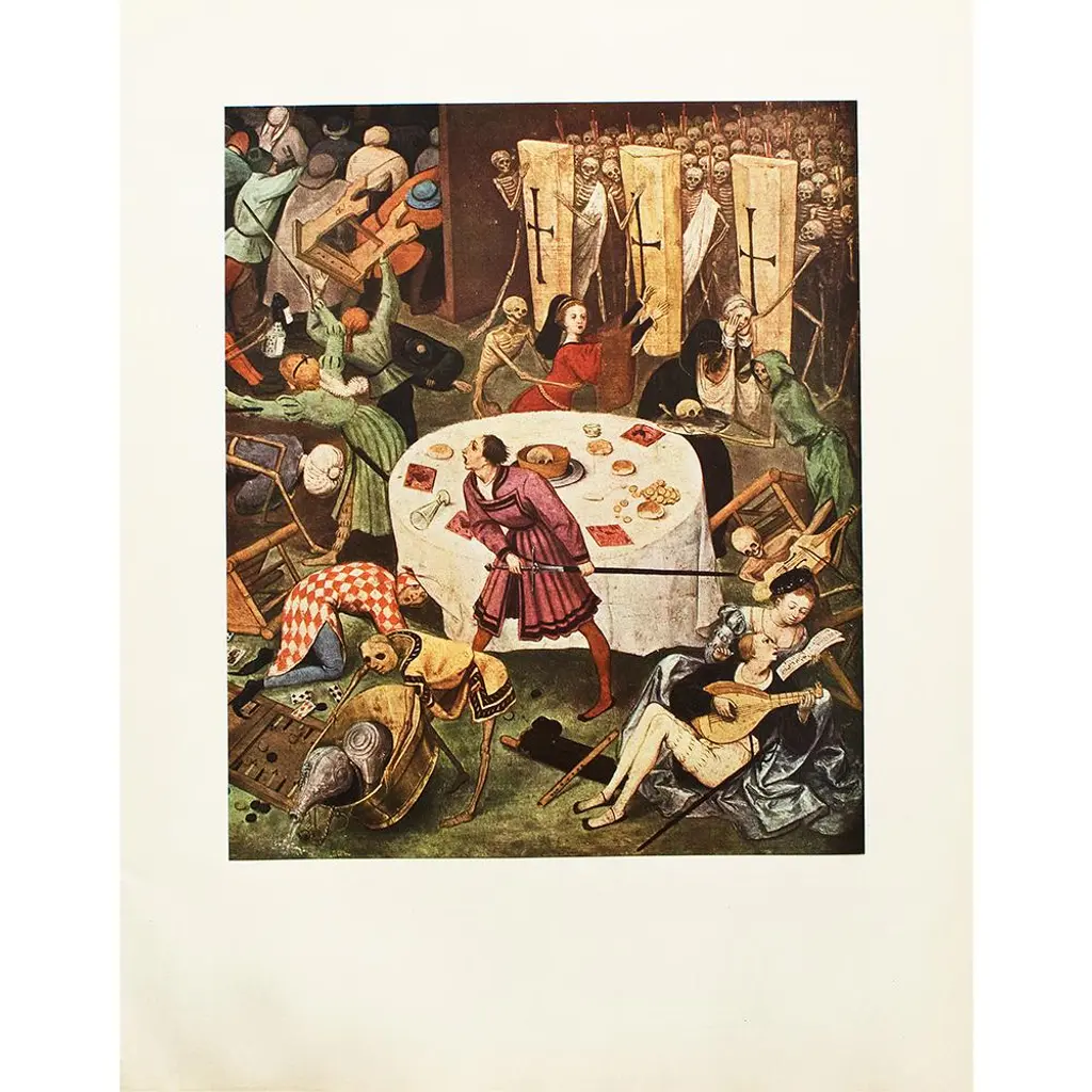 An excellent First Edition photogravure (print) of detailf of painting "The Triumph of Death" by Pieter Bruegel. Comes from a First Limited Edition art folio published in 1954. Printed on one side. Hand tipped-in on a board of heavy paper. Information regarding the original artwork will be found by lifting the piece. Excellent condition - minor edge wear on the board, never framed. Image 8"W x 10"H
