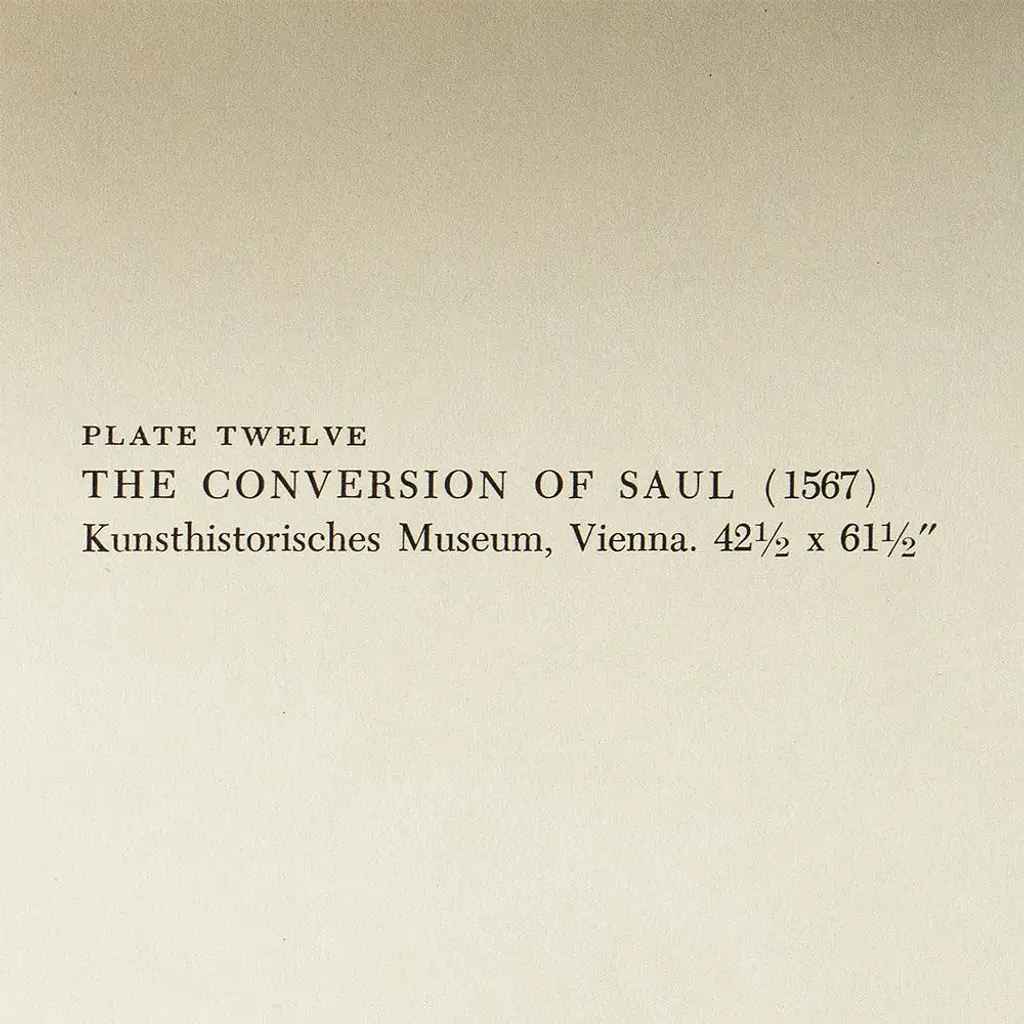 An excellent First Edition photogravure (print) of painting "The Conversion of Saul" by Pieter Bruegel. Comes from a First Limited Edition art folio published in 1954. Printed on one side. Hand tipped-in on a board of heavy paper. Information regarding the original artwork will be found by lifting the piece. Excellent condition - minor edge wear on the board, never framed. Image 10.15"W x 7"H