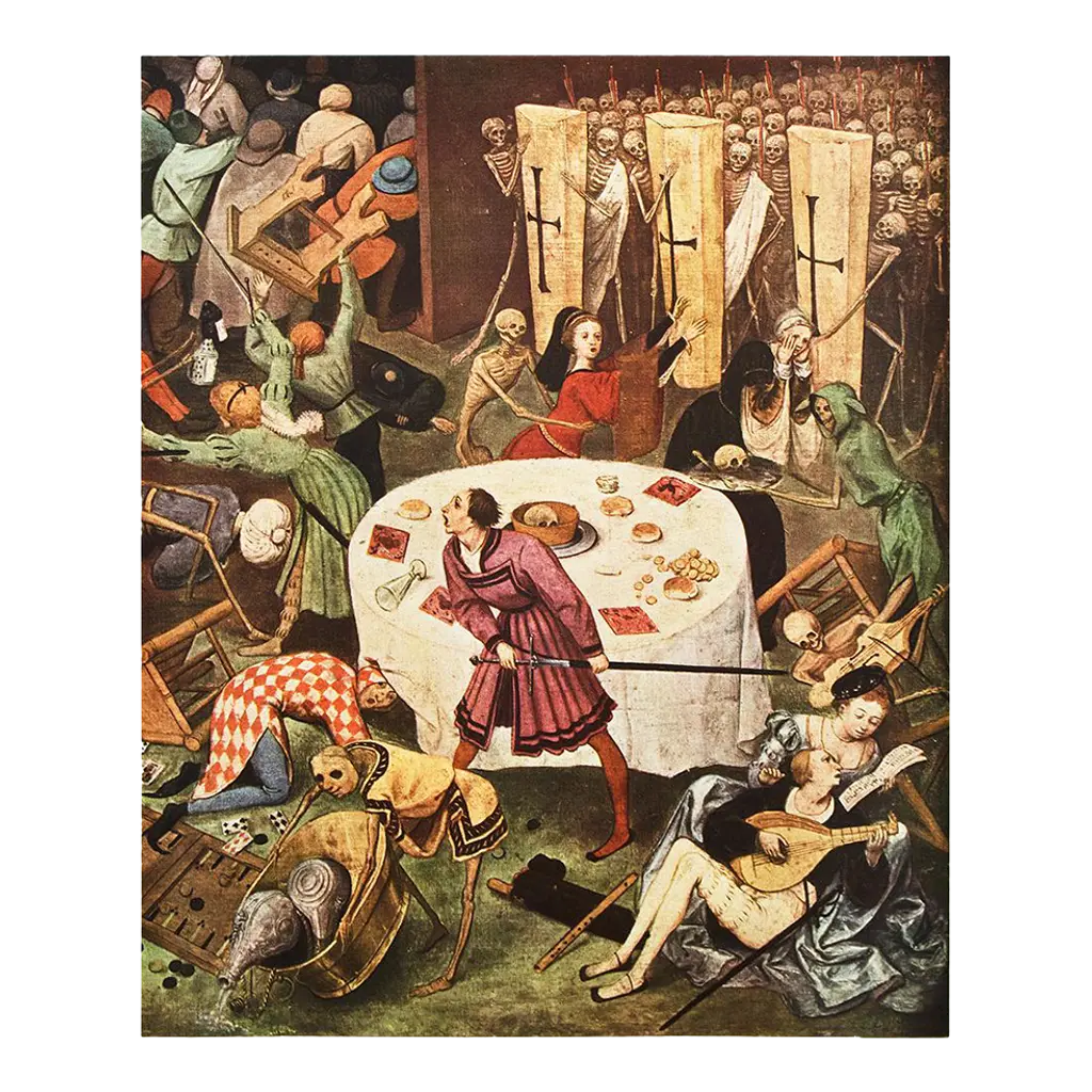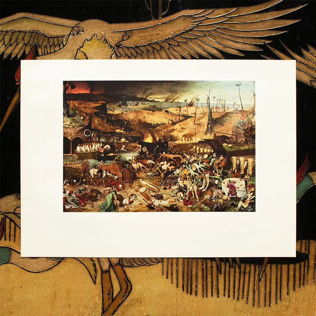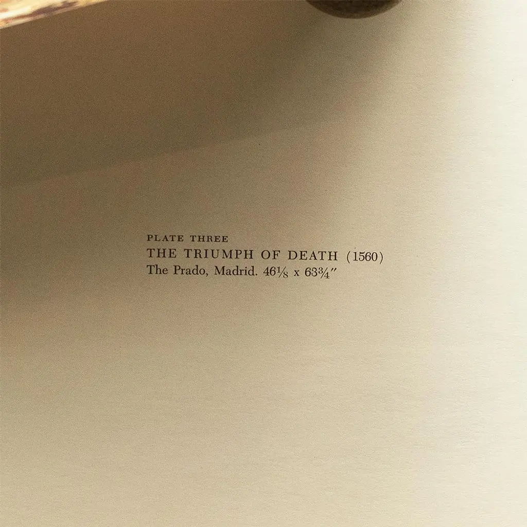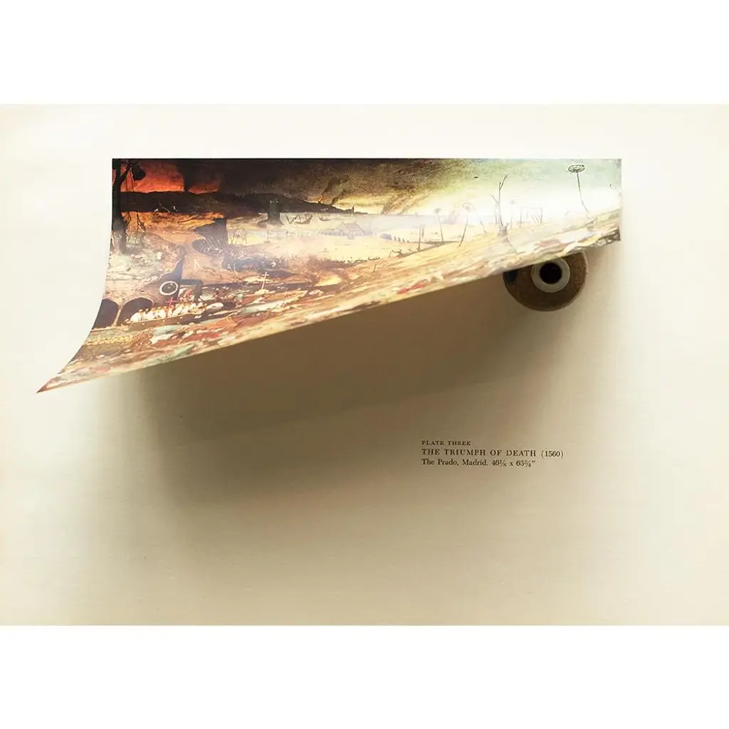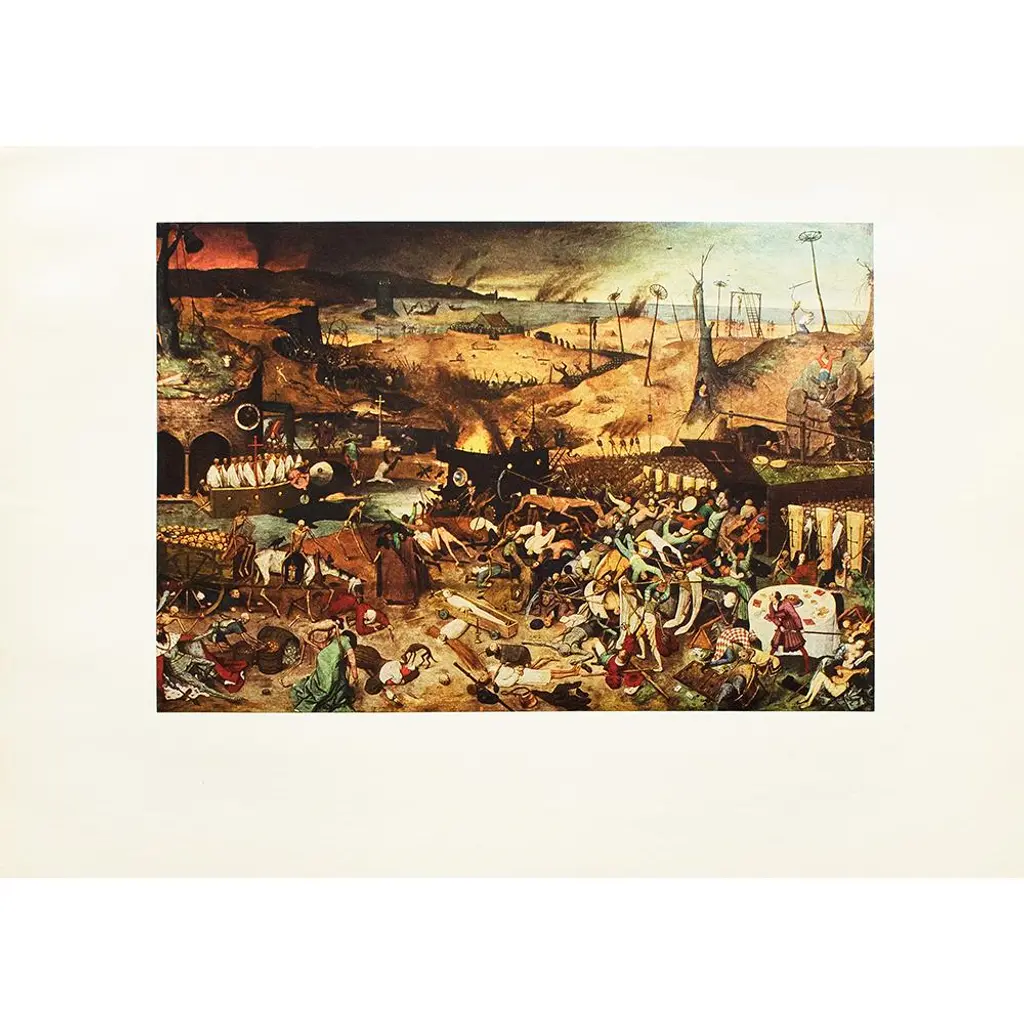 An excellent First Edition photogravure (print) of painting "The Triumph of Death" by Pieter Bruegel. Comes from a First Limited Edition art folio published in 1954. Printed on one side. Hand tipped-in on a board of heavy paper. Information regarding the original artwork will be found by lifting the piece. Excellent condition - minor edge wear on the board, never framed. Image 10.20"W x 7.20"H