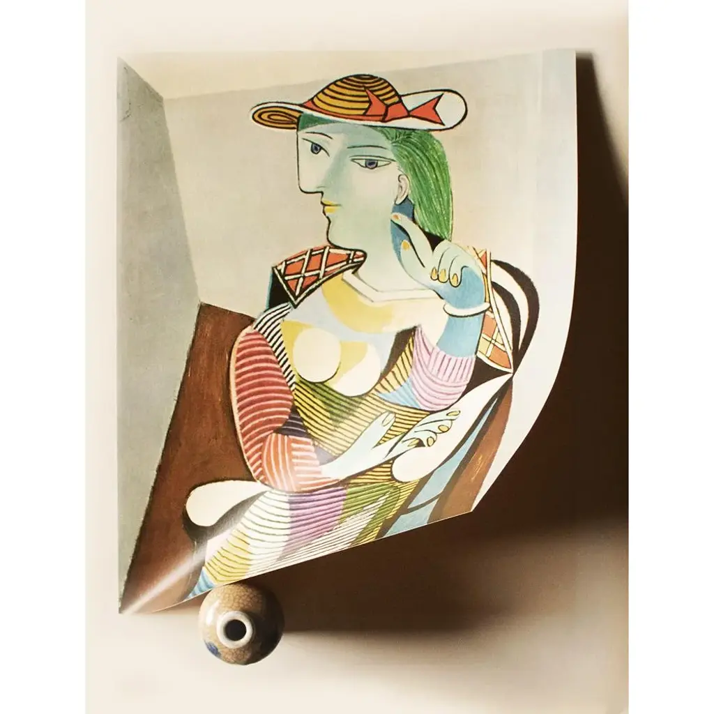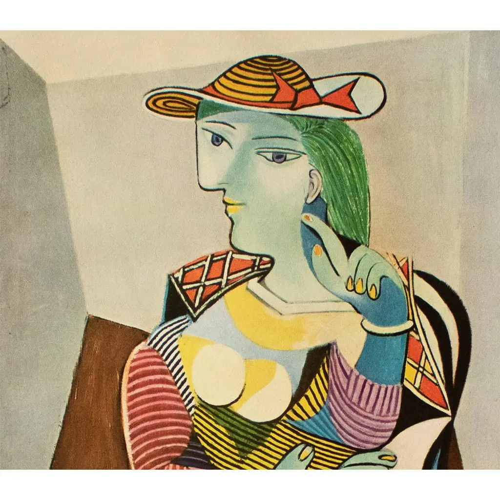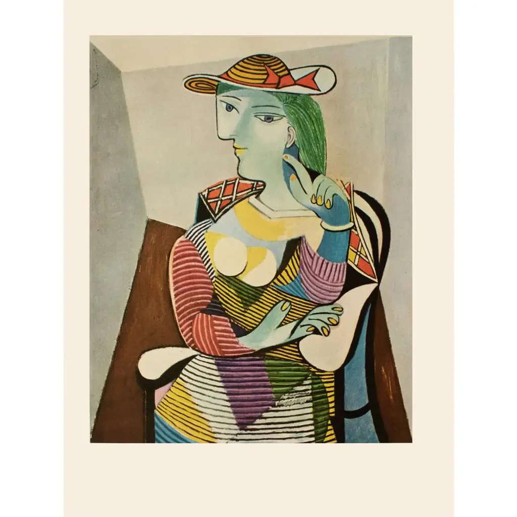 A stunning large vintage First Edition period offset lithograph, print, after painting "Woman with a Hat" (1937) by Pablo Picasso. Comes from a rare First Limited Edition folio published in 1954 in Italy. Printed on one side. Hand tipped-in on a board of heavy paper. Printed name of artwork on the back is related to another piece in the folio. Superb quality. Very detailed. Gorgeous vivid colors. Excellent condition - minor age wear on the board, never framed. You will love texture of the piece. Overall 11.10"W x 14.5"H Image 9.20"W x 11.40"H
