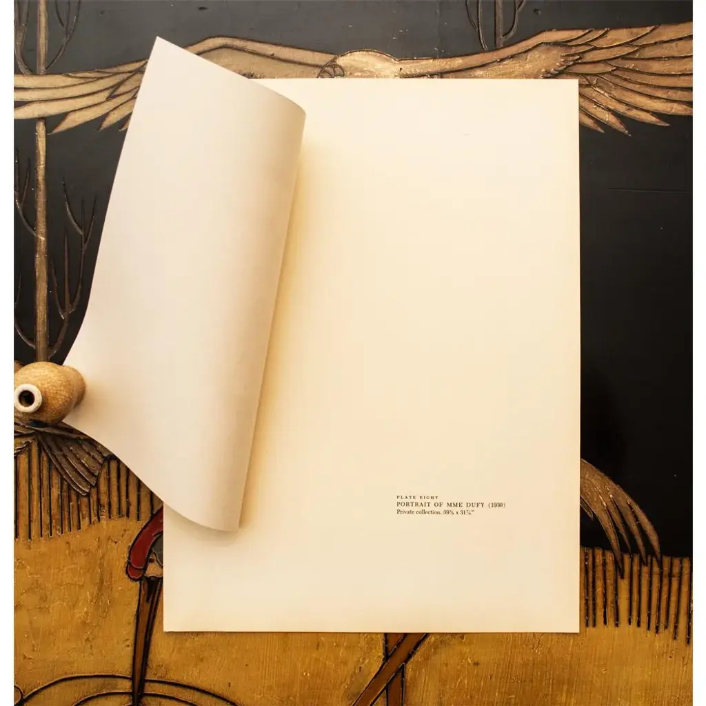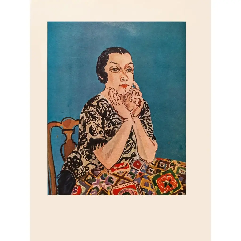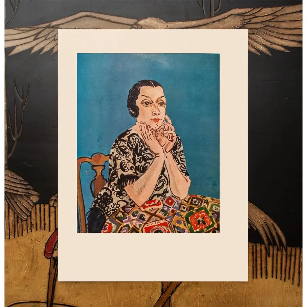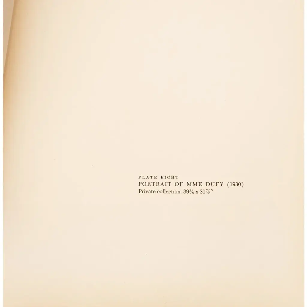 A lovely large vintage offset lithograph, full-color print, of Portrait of Madame Dufy (1930) by Raoul Dufy. Comes from First Limited Edition folio published in 1954, the next year after the artist passed away, which makes it a nearly period piece. Signed in the print. Printed on one side. Hand tipped-in on a board of heavy paper. Information regarding the original artwork will be found by lifting the piece. Excellent condition - minor edge wear on the board, never framed. Overall 11"W x 14.5"H Image 8.45"W x 10.5"H
