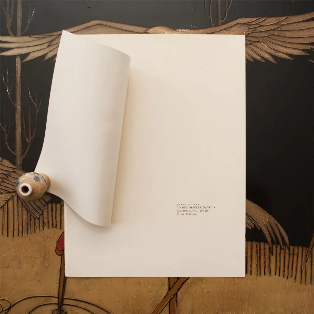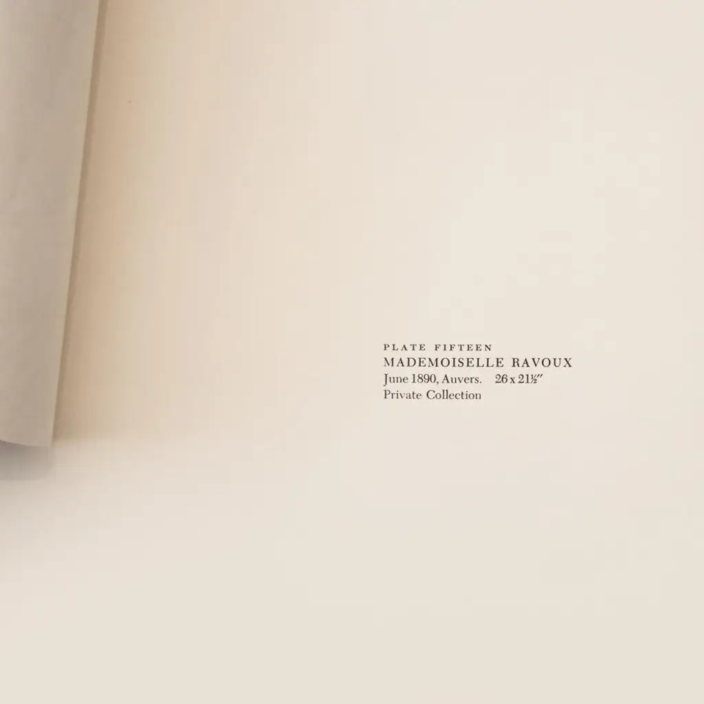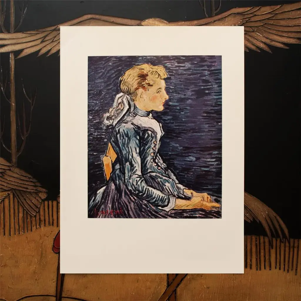 An excellent vintage First Edition full-color print of Post-Impressionist oil on canvas portrait of Mademoiselle Ravoux (June 1890) by Vincent Van Gogh. Comes from a rare First Limited Edition art folio published in the 1954. Signed in the print: "Vincent". Printed on one side. Hand tipped-in on a board of heavy paper. Information regarding the original artwork will be found by lifting the piece. Very detailed. Colors are deep and rich. Excellent condition - minor edge wear on the board, never framed. Overall 10.75"W x 14.75"H Image 7.80"W x 9.75"H