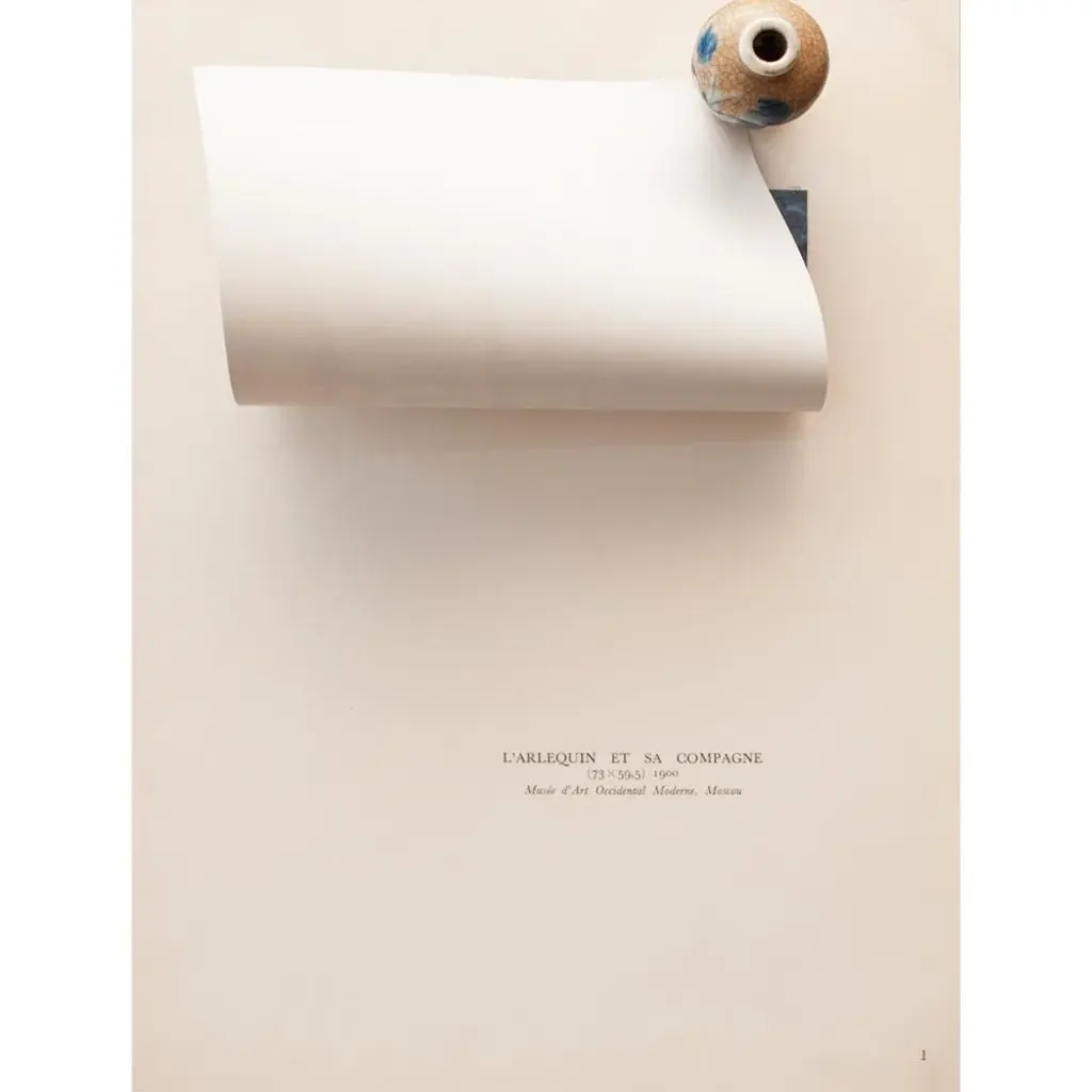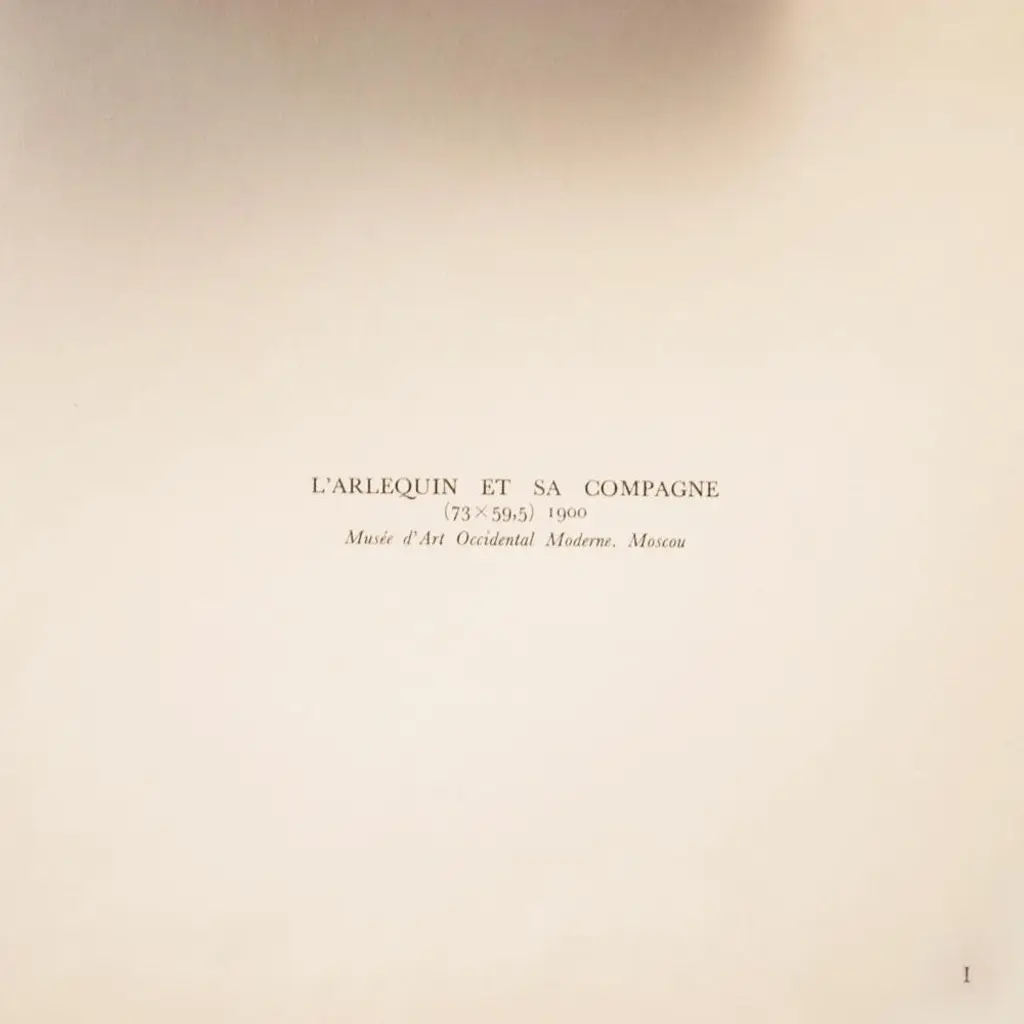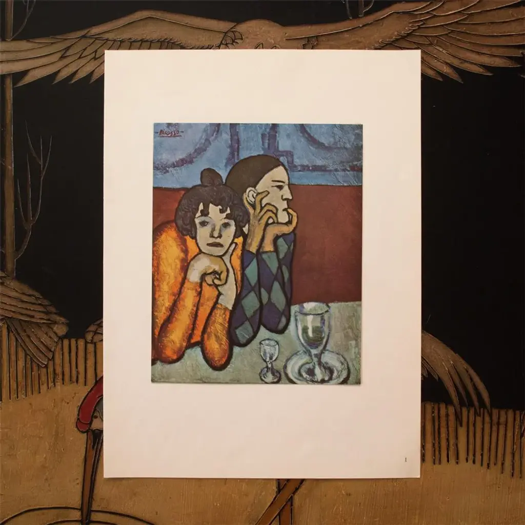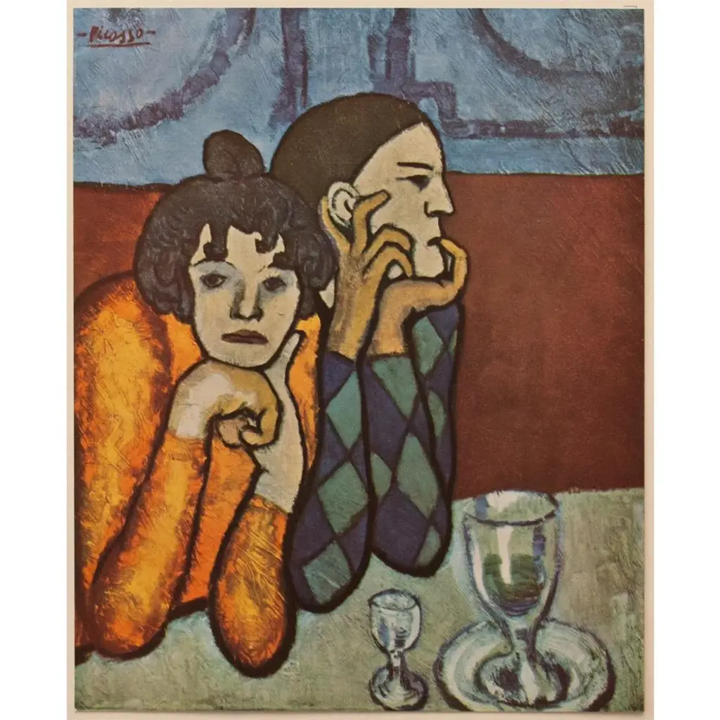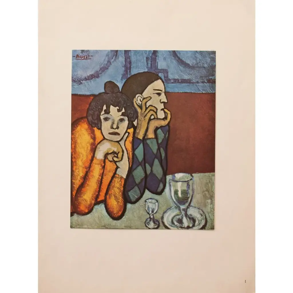 A lovely period vintage First Edition offset lithograph, print, of painting L'arlequin Et Sa Compagne (Harlequin And His Companion, 1900) by Pablo Picasso. Comes from a rare First Limited Edition art folio of the artist published by Les Editions du Chene in Paris, France, in 1955. Signed in the print at the top left corner: -Picasso-. Printed on one side. Hand tipped-in on a board of heavy paper. Information regarding the original artwork, in French, will be found by lifting the piece. Numbered at the lower right corner: "I". Excellent condition, minor edge wear on the board, never framed. Only one copy is available. 10.75"W x 14.5"H overall 7.20"W x 8.80"H image