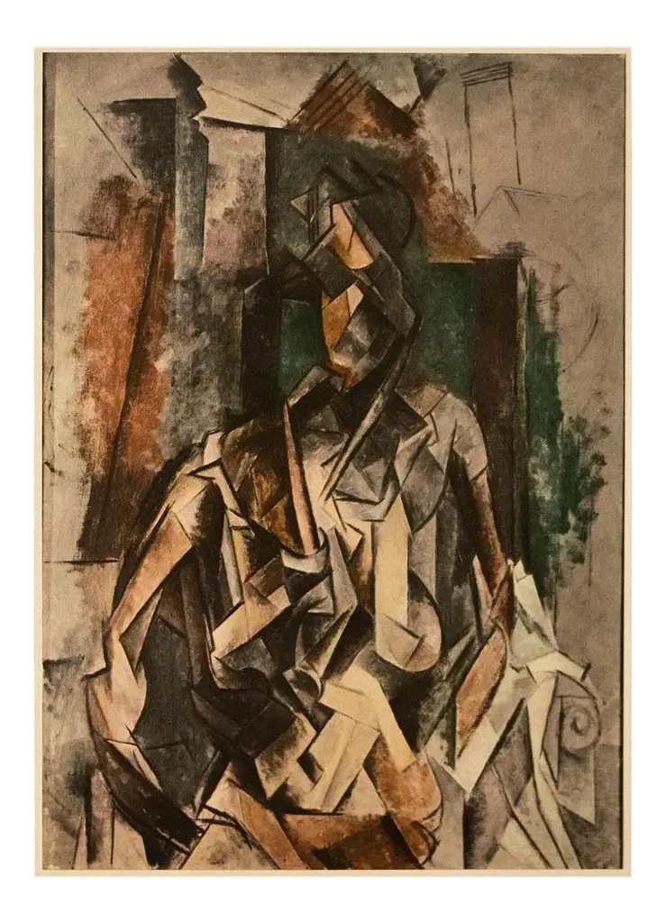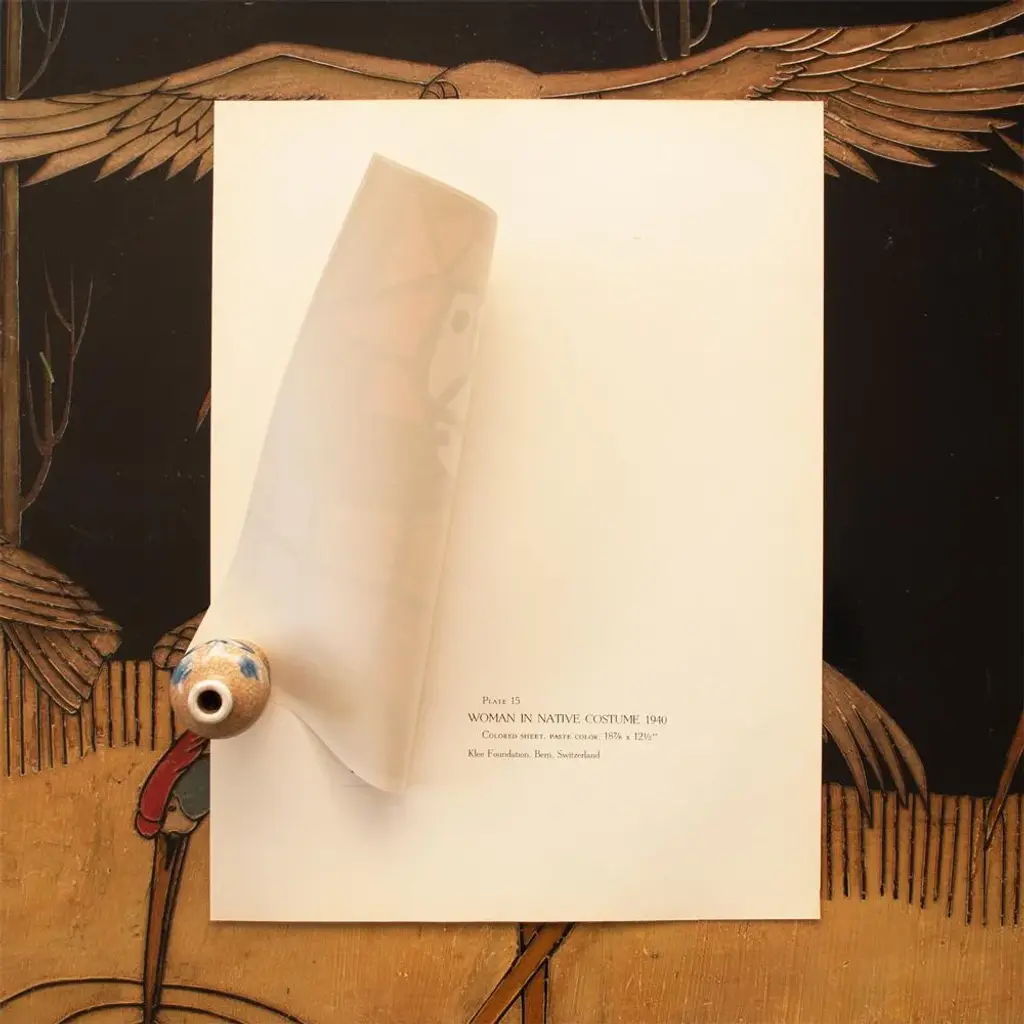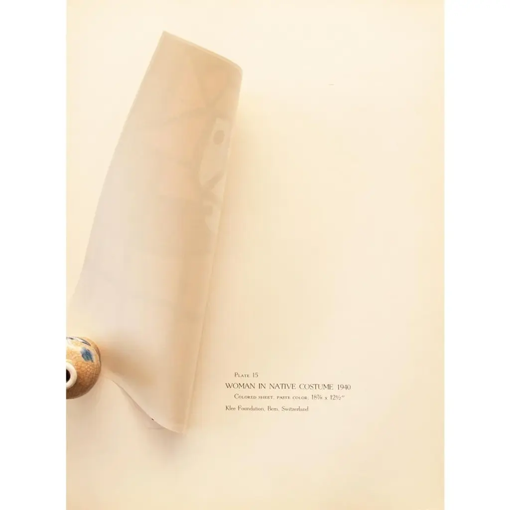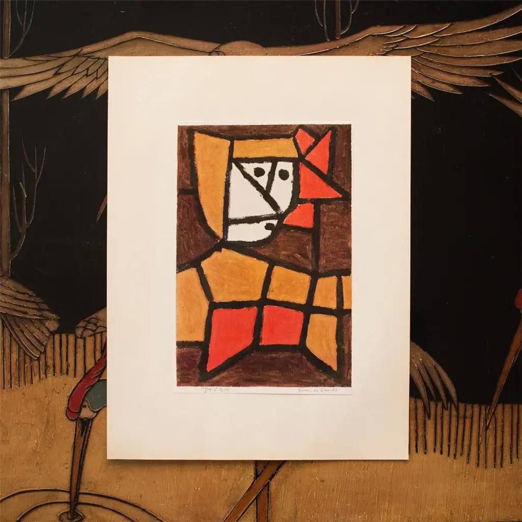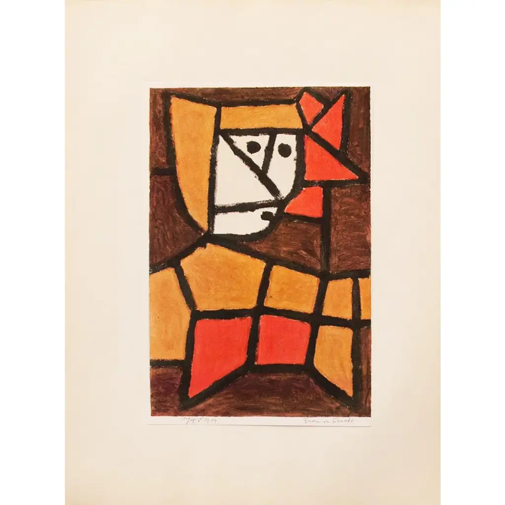 A striking vintage offset lithograph, full-color print, after painting "Woman in Native Costume" (1940) by Swiss-German artist Paul Klee. Comes from a rare art folio published in 1955. First Limited American Edition. Signed in the print. Printed on one side. Hand tipped-in on a sheet of heavy wove paper. Information regarding the original artwork will be found by lifting the piece. Copy on the back of the paper is related to another piece in the portfolio. Rich vivid colors. Excellent condition - never framed. 10.80"W x 14.75"H overall 6.5"W x 10.10"H image Shortly before his death, Klee produced pictures and figures like this Woman in Native Costume which, composed of a few harsh strokes enclosing coloured shapes, have effect of leaded stained-glass windows. The figure of a "woman in native costume" emerged only at the end of a long process - when the triangle of white was associated with a nose, and led of the two black dots that marks the eyes. In other pictures, similar forms led to landscapes or non-representational forms. In the course of a conversation Klee said one evening that when he made this drawing he was so excited that he had the feeling of beating a drum. We can not help recalling these words when we look at such pictures. The lines and the colours have something in them of drum beats, which are limited in mood but all the more emphatic for that. Actually, Klee painted a drummer and drum beats to commemorate a drummer whom he had heard and observed at the Dresden Opera House.