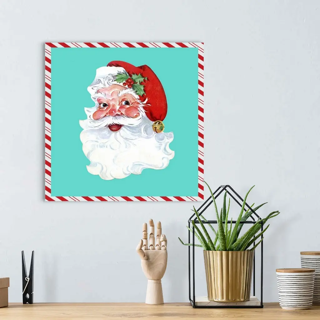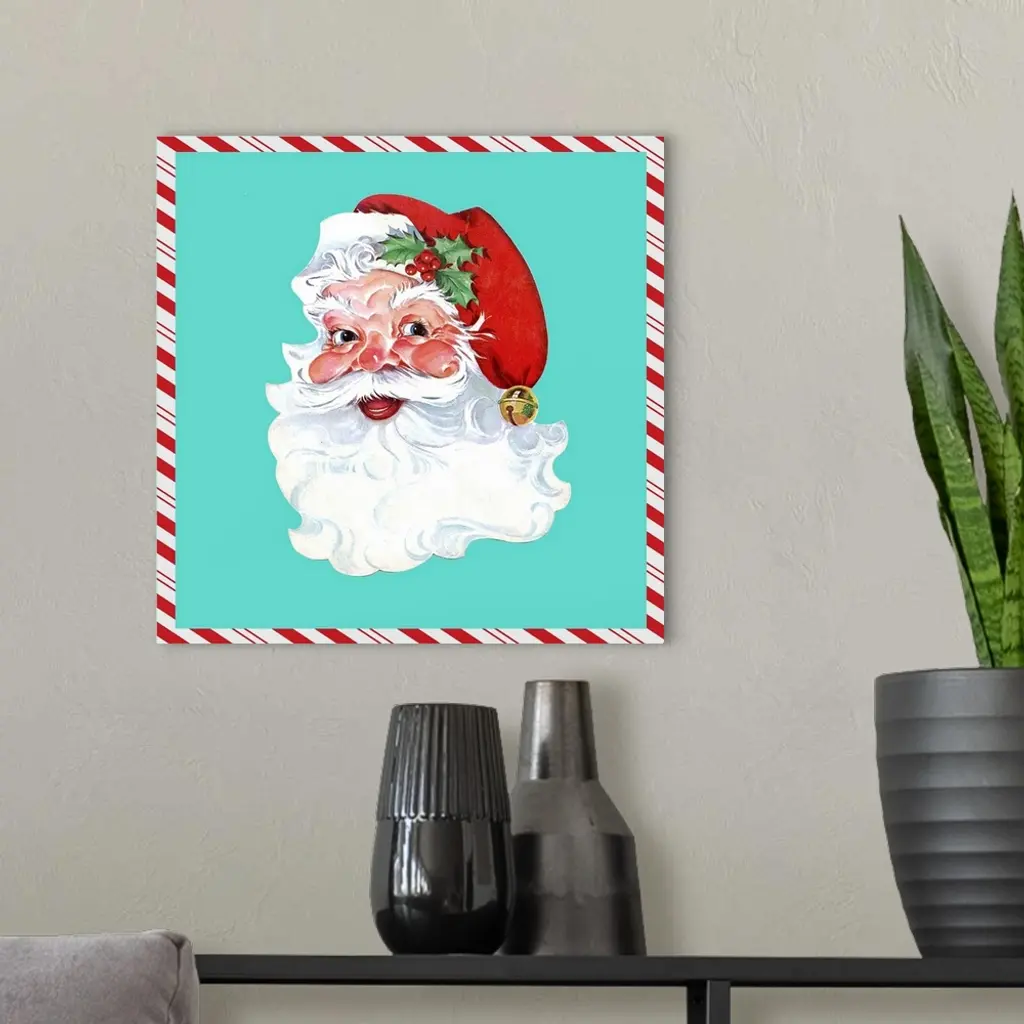 Square vintage artwork of a smiling Santa on a teal background bordered with a candy cane pattern.