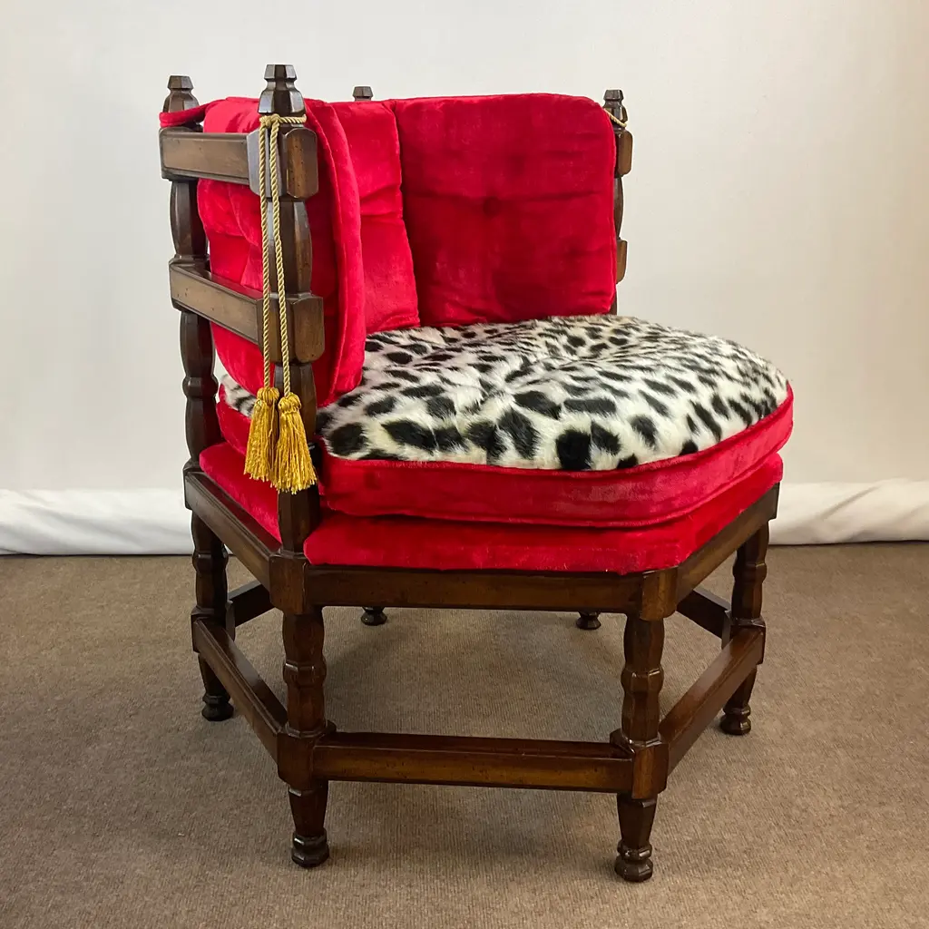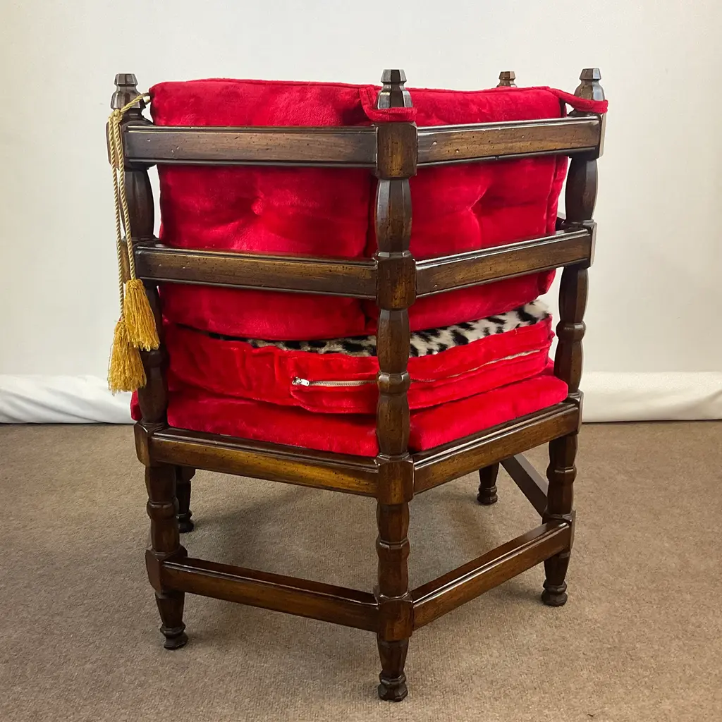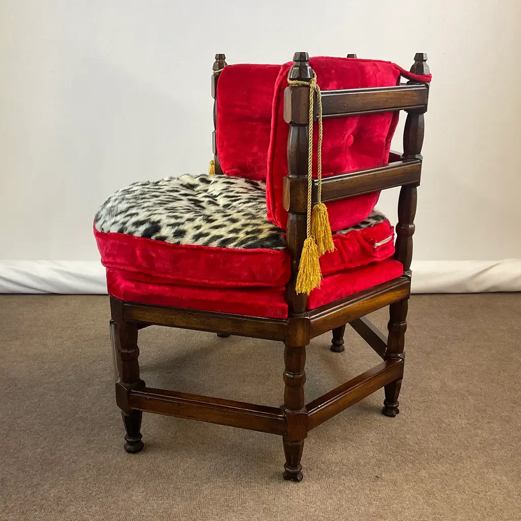 Vintage Home is pleased to present this stunning Hollywood Regency Vintage Side Chair from the 1960s. It was the Golden Era of Hollywood and red velvet, gold tassels and an updated faux cheetah fur fabric was all the rage then and again now. The chair’s history is fun too. Every year in Omaha, NE there is a regional exposition called Aksarben. (It’s Nebraska spelled backwards.) Retailers have booths to showcase their newest wares. A furniture store delivered four of these chairs for the event and then the owners took then home were they were used for many years and curated from their estate sale. The manufacturer was Showpieces by Lewitte out of New York. The Six-Sided chairs were covered in velvet with the color “Tiffany Lipstick”. When we acquired them, we reupholstered one side of the seat cushion because of wear and stains. The faux leopard was a natural option. Everything else is original and it’s stunning. The tag on the underside provides the history. We have 4 of these and can offer a “group” discount. Send an Ask the Seller for details. We have curated a collection of Christmas items from countries near and far. Our CHRISTMAS AROUND THE WORLD collection is a delightful mix of vintage items from many cultures and styles. It’s fun to browse and hopefully you will find something special to add to your holiday. Click on VINTAGE HOME to the left to take you to our front page. You find Holiday items under the Décor – Room Accents & Accessories category and in Tableware – Holiday Tableware. If you purchase more than one item, we COMBINE SHIP whenever possible to save shipping costs. We’ll inform Chairish of the unused shipping labels and they work with UPS on the back end to refund your savings after delivery. Enjoy all of your Holiday Celebrations!