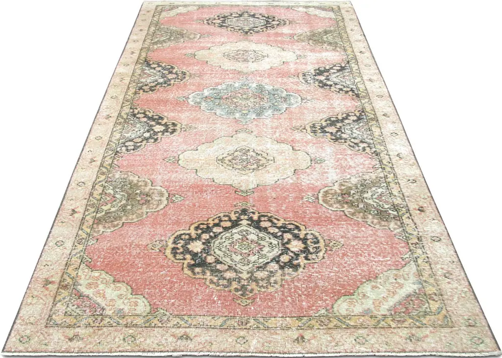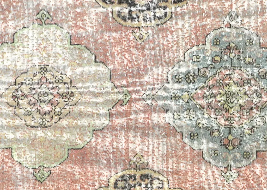 1960s Vintage Turkish Oushak Carpet. Handwoven with wool on wool foundation in the Oushak region of Western Turkey. The Anatolian plateau is where the weaving of oriental carpets originated. Rich in tradition and pride, each of the villages of the area produced a certain design and colors that the neighbors rarely copied. These Antiques were largely illustrated in historical European painting. Their bold geometrical designs and soft colors made them favorites of interior designers.
