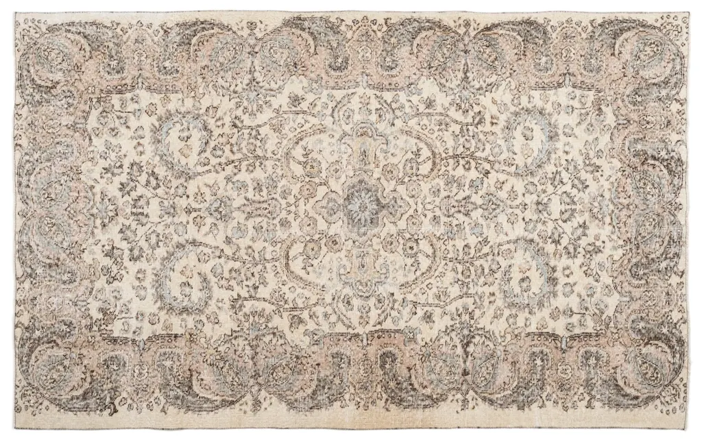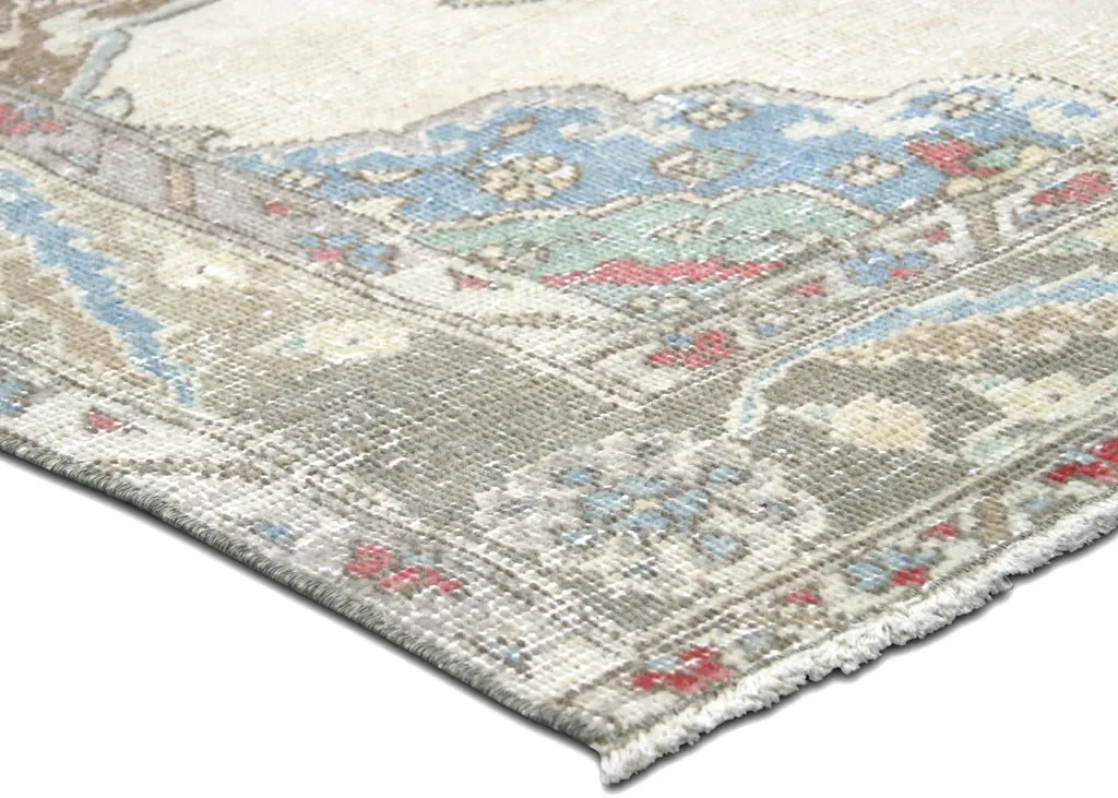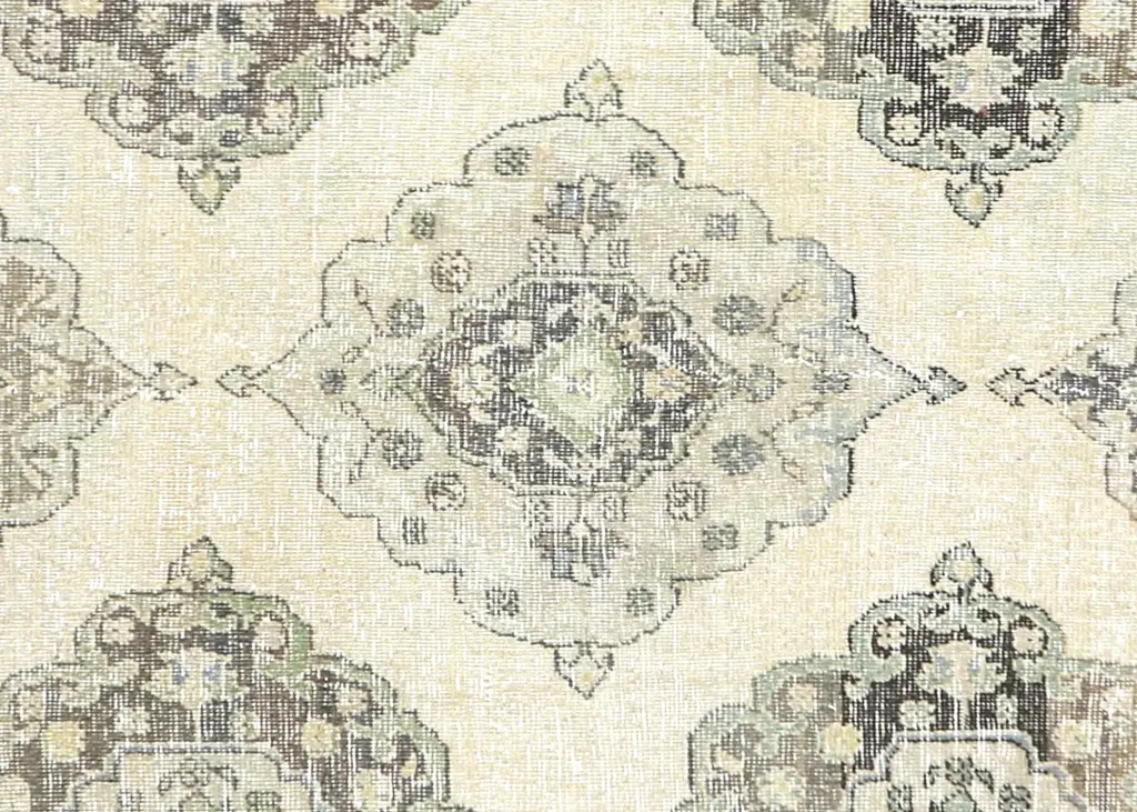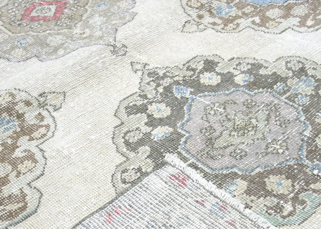 1960s Vintage Turkish Oushak Carpet. Handwoven with wool on wool foundation in the Oushak region of Western Turkey. The Anatolian plateau is where the weaving of oriental carpets originated. Rich in tradition and pride, each of the villages of the area produced a certain design and colors that the neighbors rarely copied. These Antiques were largely illustrated in historical European painting. Their bold geometrical designs and soft colors made them favorites of interior designers.