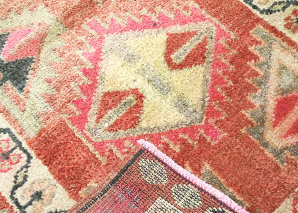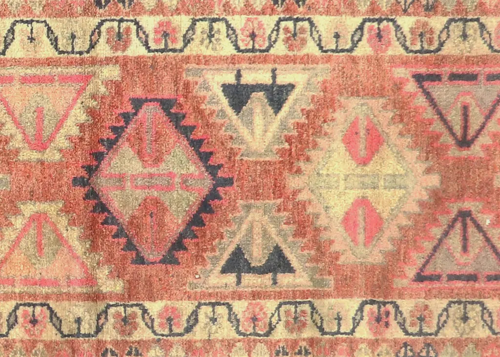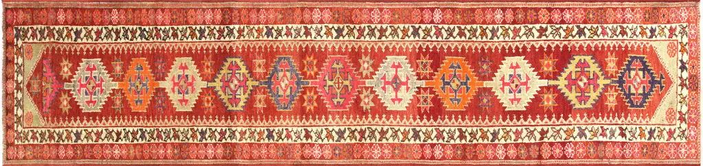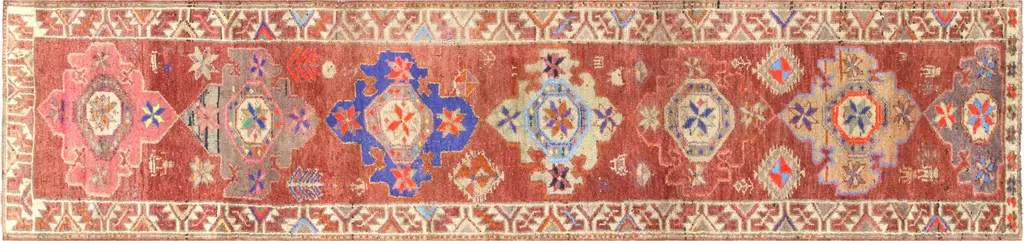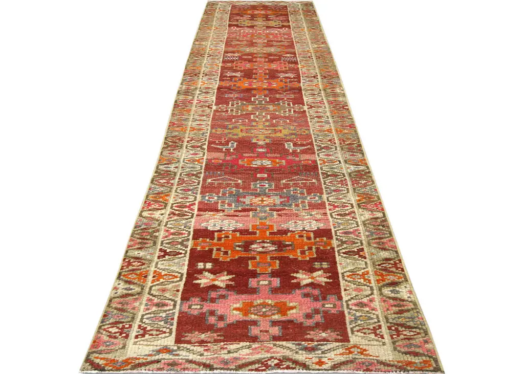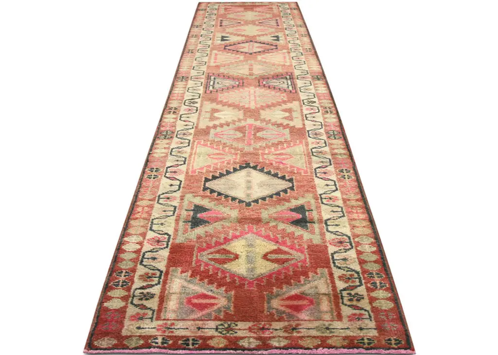 1960s Turkish Oushak Runner. Handwoven with wool on wool foundation in the Oushak region of Western Turkey. The Anatolian plateau is where the weaving of oriental carpets originated. Rich in tradition and pride, each of the villages of the area produced a certain design and colors that the neighbors rarely copied. These Antiques were largely illustrated in historical European painting. Their bold geometrical designs and soft colors made them favorites of interior designers.